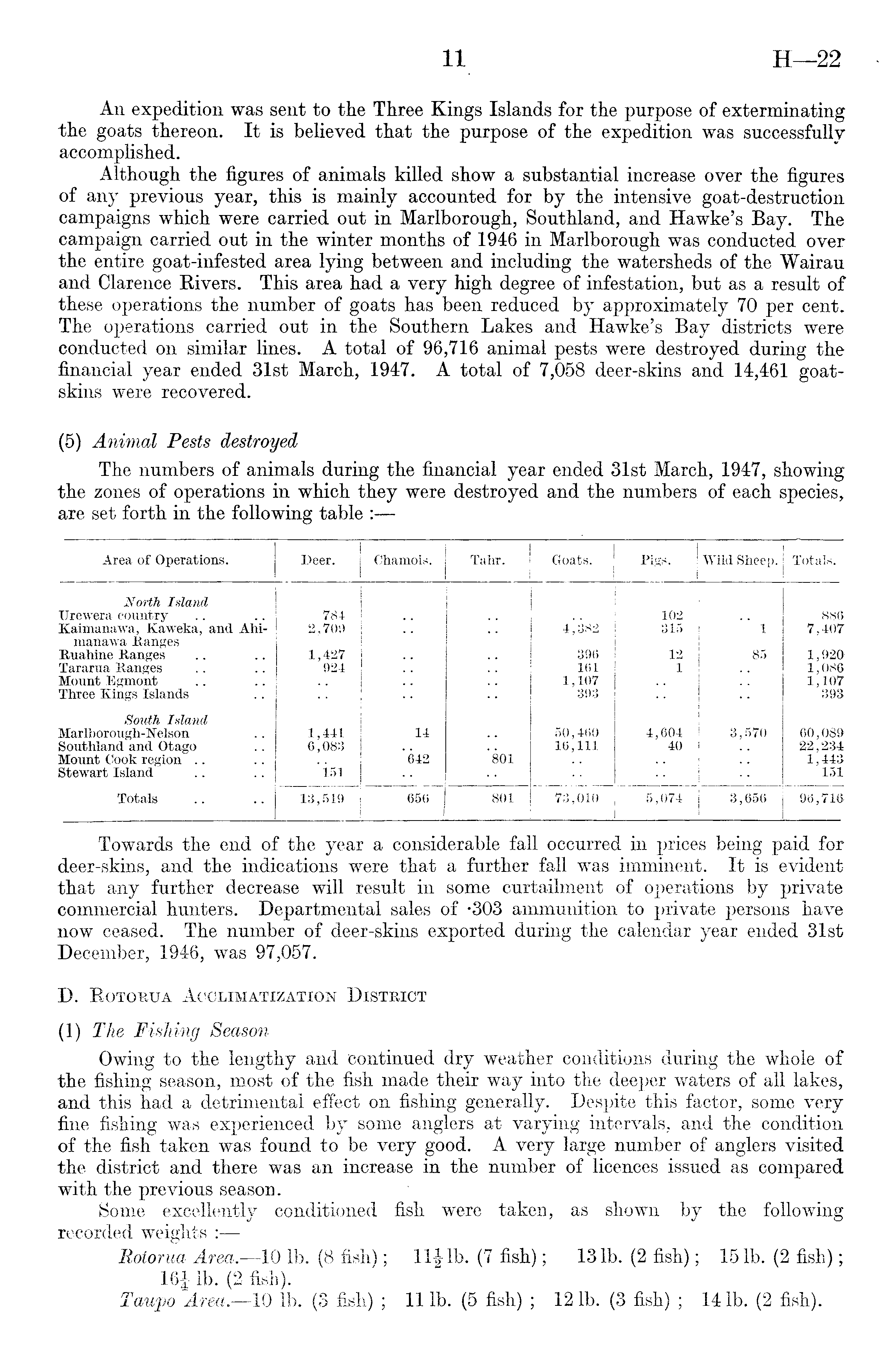 An expedition was sent to the Three Kings Islands for the purpose of exterminating the goats thereon. It is believed that the purpose of the expedition was successfully accomplished. Although the figures of animals killed show a substantial increase over the figures of any previous year, this is mainly accounted for by the intensive goat-destruction campaigns which were carried out in Marlborough, Southland, and Hawke's Bay. The campaign carried out in the winter months of 1946 in Marlborough was conducted over the entire goat-infested area lying between and including the watersheds of the Wairau and Clarence Rivers. This area had a very high degree of infestation, but as a result of these operations the number of goats has been reduced by approximately 70 per cent. The operations carried out in the Southern Lakes and Hawke's Bay districts were conducted on similar lines. A total of 96,716 animal pests were destroyed during the financial year ended 31st March, 1947. A total of 7,058 deer-skins and 14,461 goatskins were recovered. (5) Animal Pests destroyed The numbers of animals during the financial year ended 31st March, 1947, showing the zones of operations in which they were destroyed and the numbers of each species, are set forth in the following table :