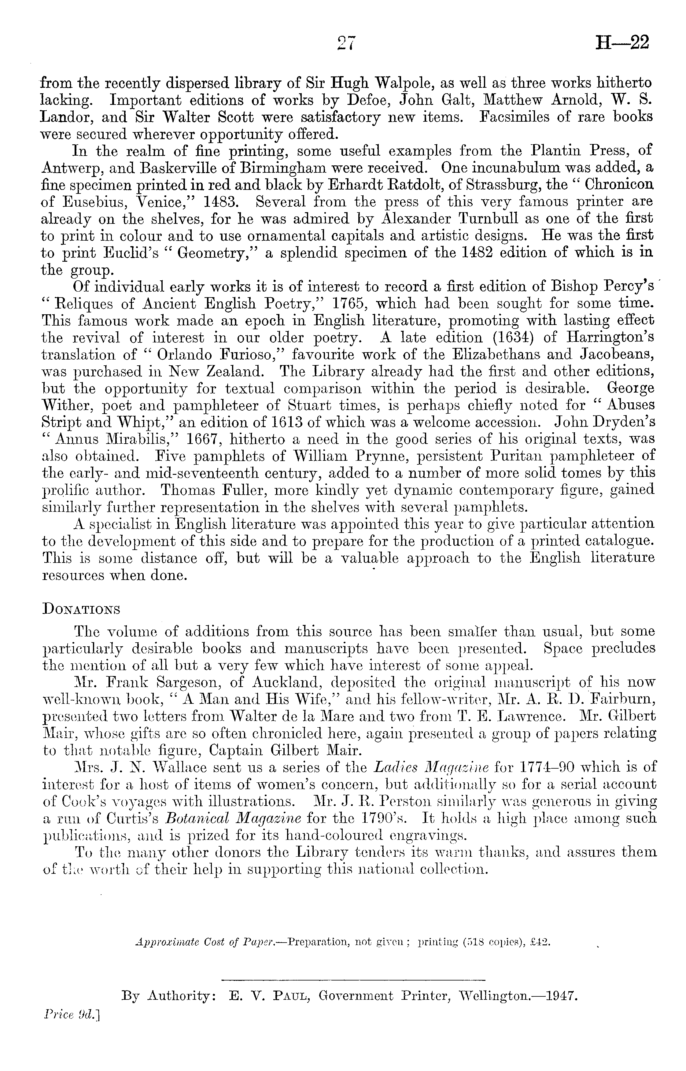 from the recently dispersed library of Sir Hugh Walpole, as well as three works hitherto lacking. Important editions of works by Defoe, John Gait, Matthew Arnold, W. S. Landor, and Sir Walter Scott were satisfactory new items. Facsimiles of rare books were secured wherever opportunity offered. In the realm of fine printing, some useful examples from the Plantin Press, of Antwerp, and Baskerville of Birmingham were received. One incunabulum was added, a fine specimen printed in red and black by Erhardt Eatdolt, of Strassburg, the " Chronicon of Eusebius, Venice," 1483. Several from the press of this very famous printer are already on the shelves, for he was admired by Alexander Turnbull as one of the first to print in colour and to use ornamental capitals and artistic designs. He was the first to print Euclid's " Geometry," a splendid specimen of the 1482 edition of which is in the group. Of individual early works it is of interest to record a first edition of Bishop Percy's " Eeliques of Ancient English Poetry," 1765, which had been sought for some time. This famous work made an epoch in English literature, promoting with lasting effect the revival of interest in our older poetry. A late edition (1634) of Harrington's translation of " Orlando Eurioso," favourite work of the Elizabethans and Jacobeans, was purchased in New Zealand. The Library already had the first and other editions, but the opportunity for textual comparison within the period is desirable. George Wither, poet and pamphleteer of Stuart times, is perhaps chiefly noted for " Abuses Stript and Whipt," an edition of 1613 of which was a welcome accession. John Dryden's " Annus Mirabilis," 1667, hitherto a need in the good series of his original texts, was also obtained. Eive pamphlets of William Prynne, persistent Puritan pamphleteer of the early- and mid-seventeenth century, added to a number of more solid tomes by this prolific author. Thomas Fuller, more kindly yet dynamic contemporary figure, gained similarly further representation in the shelves with several pamphlets. A specialist in English literature was appointed this year to give particular attention to the development of this side and to prepare for the production of a printed catalogue. This is some distance off, but will be a valuable approach to the English literature resources when done. Donations The volume of additions from this source has been smaller than usual, but some particularly desirable books and manuscripts have been presented. Space precludes the mention of all but a very few which have interest of some appeal. Mr. Frank Sargeson, of Auckland, deposited the original manuscript of his now well-known book, " A Man and His Wife," and his fellow-writer, Mr. A. B. D. Fairburn, presented two letters from Walter de la Mare and two from T. E. Lawrence. Mr. Gilbert Mair, whose gifts are so often chronicled here, again presented a group of papers relating to that notable figure, Captain Gilbert Mair. Mrs. J. N". Wallace sent us a series of the Ladies Magazine for 1774-90 which is of interest for a host of items of women's concern, but additionally so for a serial account of Cook's voyages with illustrations. Mr. J. B. Perston similarly was generous in giving a run of Curtis's Botanical Magazine for the 1790'5. It holds a high place among such publications, and is prized for its hand-coloured engravings. To the many other donors the Library tenders its warm thanks, and assures them of the worth of their help in supporting this national collection. Approximate Cost of Paper. —Preparation, not given; printing (518 copies), £42.