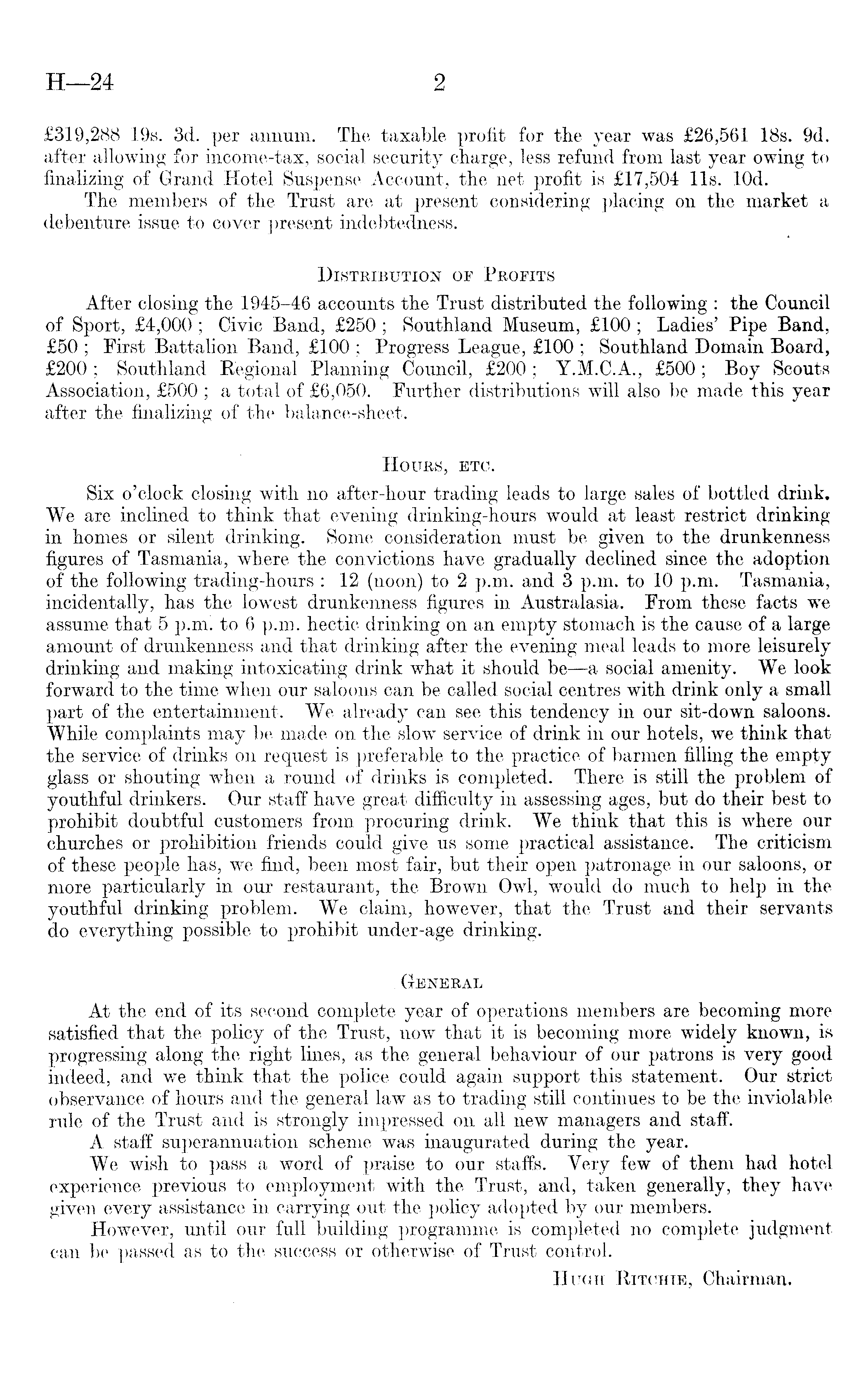 £319,288 19s. 3d. per annum. The taxable profit for the year was £26,561 18s. 9d. after allowing for income-tax, social security charge, less refund from last year owing to finalizing of Grand Hotel Suspense Account, the net profit is £17,504 lis. lOd. The members of the Trust are at present considering placing on the market a debenture issue to cover present indebtedness. Distribution of Profits After closing the 1945-46 accounts the Trust distributed the following : the Council of Sport, £4,000 ; Civic Band, £250 ; Southland Museum, £lOO ; Ladies' Pipe Band, £5O ; First Battalion Band, £lOO ; Progress League, £lOO ; Southland Domain Board, £200; Southland Regional Planning Council, £200; Y.M.C.A., £500; Boy Scouts Association, £5OO ; a total of £6,050. Further distributions will also be made this year after the finalizing of the balance-sheet. Hours, etc. Six o'clock closing with no after-hour trading leads to large sales of bottled drink. We are inclined to think that evening drinking-hours would at least restrict drinking in homes or silent drinking. Some consideration must be given to the drunkenness figures of Tasmania, where the convictions have gradually declined since the adoption of the following trading-hours : 12 (noon) to 2 p.m. and 3 p.m. to 10 p.m. Tasmania, incidentally, has the lowest drunkenness figures in Australasia. From these facts we assume that 5 p.m. to 6 p.m. hectic drinking on an empty stomach is the cause of a large amount of drunkenness and that drinking after the evening meal leads to more leisurely drinking and making intoxicating drink what it should be —a social amenity. We look forward to the time when our saloons can be called social centres with drink only a small part of the entertainment. We already can see this tendency in our sit-down saloons. While complaints may be made on the slow service of drink in our hotels, we think that the service of drinks on request is preferable to the practice of barmen filling the empty glass or shouting when a round of drinks is completed. There is still the problem of youthful drinkers. Our staff have great difficulty in assessing ages, but do their best to prohibit doubtful customers from procuring drink. We think that this is where our churches or prohibition friends could give us some practical assistance. The criticism of these people has, we find, been most fair, but their open patronage in our saloons, or more particularly in our restaurant, the Brown Owl, would do much to help in the youthful drinking problem. We claim, however, that the Trust and their servants do everything possible to prohibit under-age drinking. General At the end of its second complete year of operations members are becoming more satisfied that the policy of the Trust, now that it is becoming more widely known, is progressing along the right lines, as the general behaviour of our patrons is very good indeed, and we think that the police could again support this statement. Our strict observance of hours and the general law as to trading still continues to be the inviolable rule of the Trust and is strongly impressed on all new managers and staff. A staff superannuation scheme was inaugurated during the year. We wish to pass a word of praise to our staffs. Very few of them had hotel experience previous to employment with the Trust, and, taken generally, they have given every assistance in carrying out the policy adopted by our members. However, until our full building programme is completed no complete judgment, can be passed as to the success or otherwise of Trust control. Hugh Ritohte, Chairman.