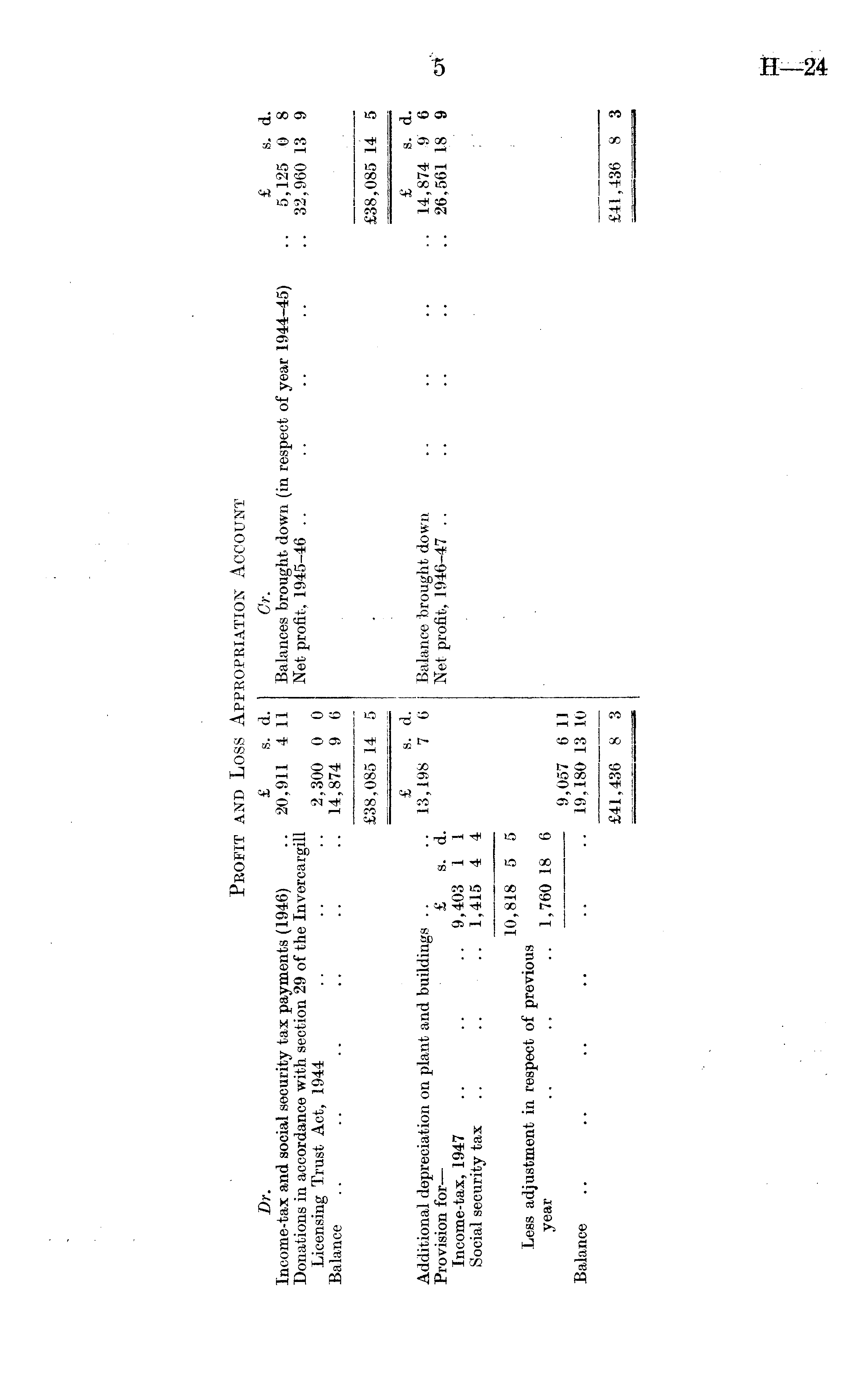 Profit and Loss Appropriation Account Dr. £ s. d. Gr. £ s. d. Income-tax and social security tax payments (1946) .. 20,911 4 11 Balances brought down (in respect of year 1944-45) .. 5,125 0 8 Donations in accordance with section 29 of the Invercargill Net profit, 1945-46 .. .. .. .. .. 32,960 13 9 Licensing Trust Act, 1944 .. .. .. 2,300 0 0 Balance .. .. .. .. .. .. 14,874 9 6; £38,085 14 5 £38,085 14 5 £ s. d. £ s. d. Additional depreciation on plant and buildings .. .. 13,198 7 6 Balance brought down .. .. .. .. 14,874 9 6 Provision for— £ s. d. Net profit, 1946-47 .. .. .. .. .. 26,56118 9 Income-tax, 1947 .. .. .. 9,403 1 1 Social security tax .. .. .. 1,415 4 4 ; 10,818 5 5 ! Less adjustment in respect of previous year .. .. .. 1,760 18 6 9,057 6 11 Balance .. .. .. .. .. ..19,180 13 10 £41,436 8 3 £41,436 8 3