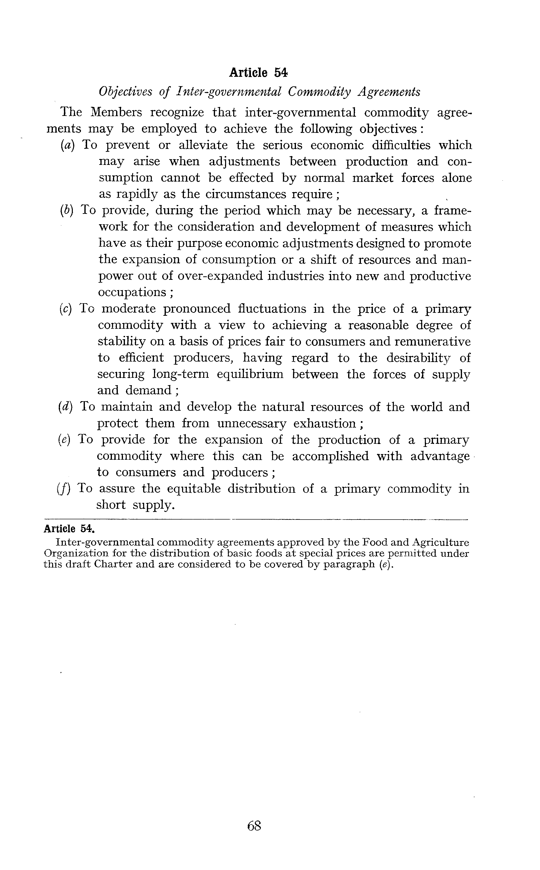 Article 54. Inter-governmental commodity agreements approved by the Food and Agriculture Organization for the distribution of basic foods at special prices are permitted under this draft Charter and are considered to be covered by paragraph (e).