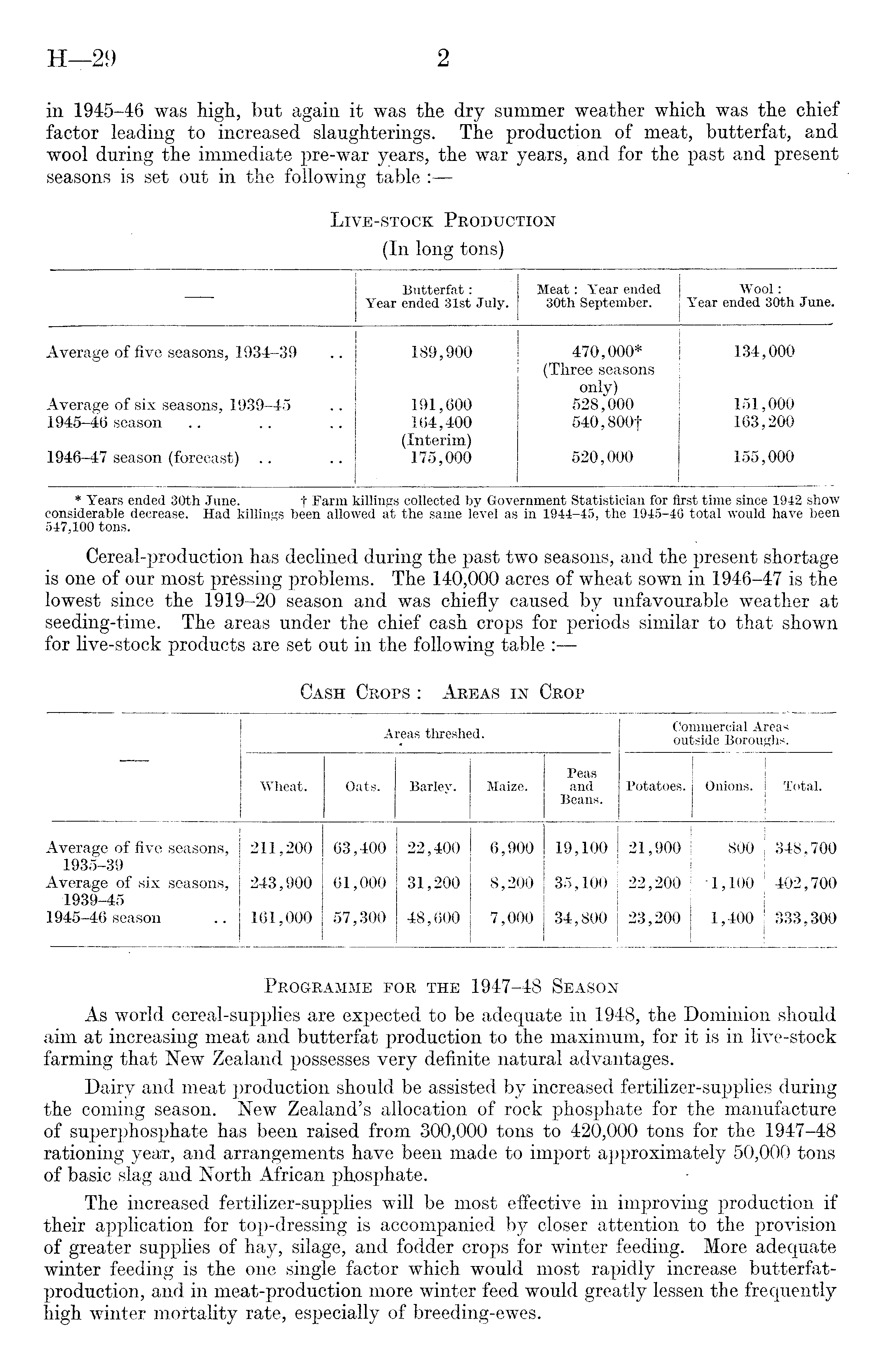 (In long tons) —• Butterfat: Year ended 31st July. Meat: Year ended 30th September. Wool: Year ended 30th June. Average of five seasons, 1934-39 Average of six seasons, 1939-45 1945-46 season 1946-47 season (forecast) 189,900 191,600 164,400 (Interim) 175,000 470,000* (Three seasons only) 528,000 540,800f 520,000 134,000 151,000 163,200 155,000 * Years ended 30th June. t Farm killings collected by Government Statistician for first time since 1942 show considerable decrease. Had killings been allowed at the same level as in 1944-45, the 1945-46 total would have been 547,100 tons.