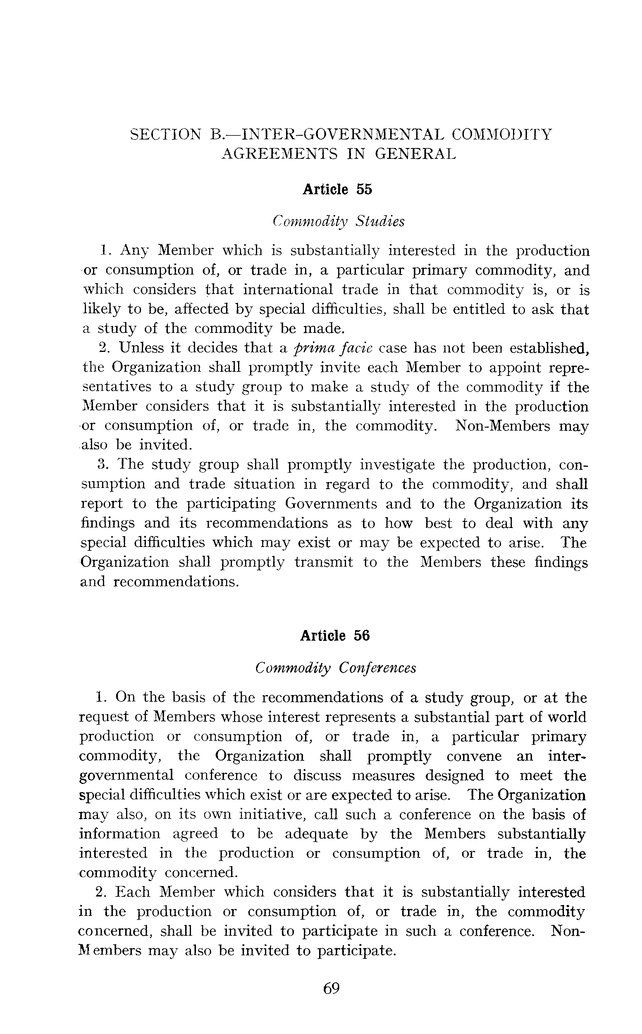 SECTION B.—INTER-GOVERNMENTAL COMMODITY AGREEMENTS IN GENERAL Article 55 Commodity Studies 1. Any Member which is substantially interested in the production or consumption of, or trade in, a particular primary commodity, and which considers that international trade in that commodity is, or is likely to be, affected by special difficulties, shall be entitled to ask that a study of the commodity be made. 2. Unless it decides that a prima facie case has not been established, the Organization shall promptly invite each Member to appoint representatives to a study group to make a study of the commodity if the Member considers that it is substantially interested in the production -or consumption of, or trade in, the commodity. Non-Members may also be invited. 3. The study group shall promptly investigate the production, consumption and trade situation in regard to the commodity, and shall report to the participating Governments and to the Organization its findings and its recommendations as to how best to deal with any special difficulties which may exist or may be expected to arise. The Organization shall promptly transmit to the Members these findings and recommendations. Article 56 Commodity Conferences 1. On the basis of the recommendations of a study group, or at the request of Members whose interest represents a substantial part of world production or consumption of, or trade in, a particular primary commodity, the Organization shall promptly convene an intergovernmental conference to discuss measures designed to meet the special difficulties which exist or are expected to arise. The Organization may also, on its own initiative, call such a conference on the basis of information agreed to be adequate by the Members substantially interested in the or consumption of, or trade in, the •commodity concerned. 2. Each Member which considers that it is substantially interested in the production or consumption of, or trade in, the commodity concerned, shall be invited to participate in such a conference. NonMembers may also be invited to participate.
