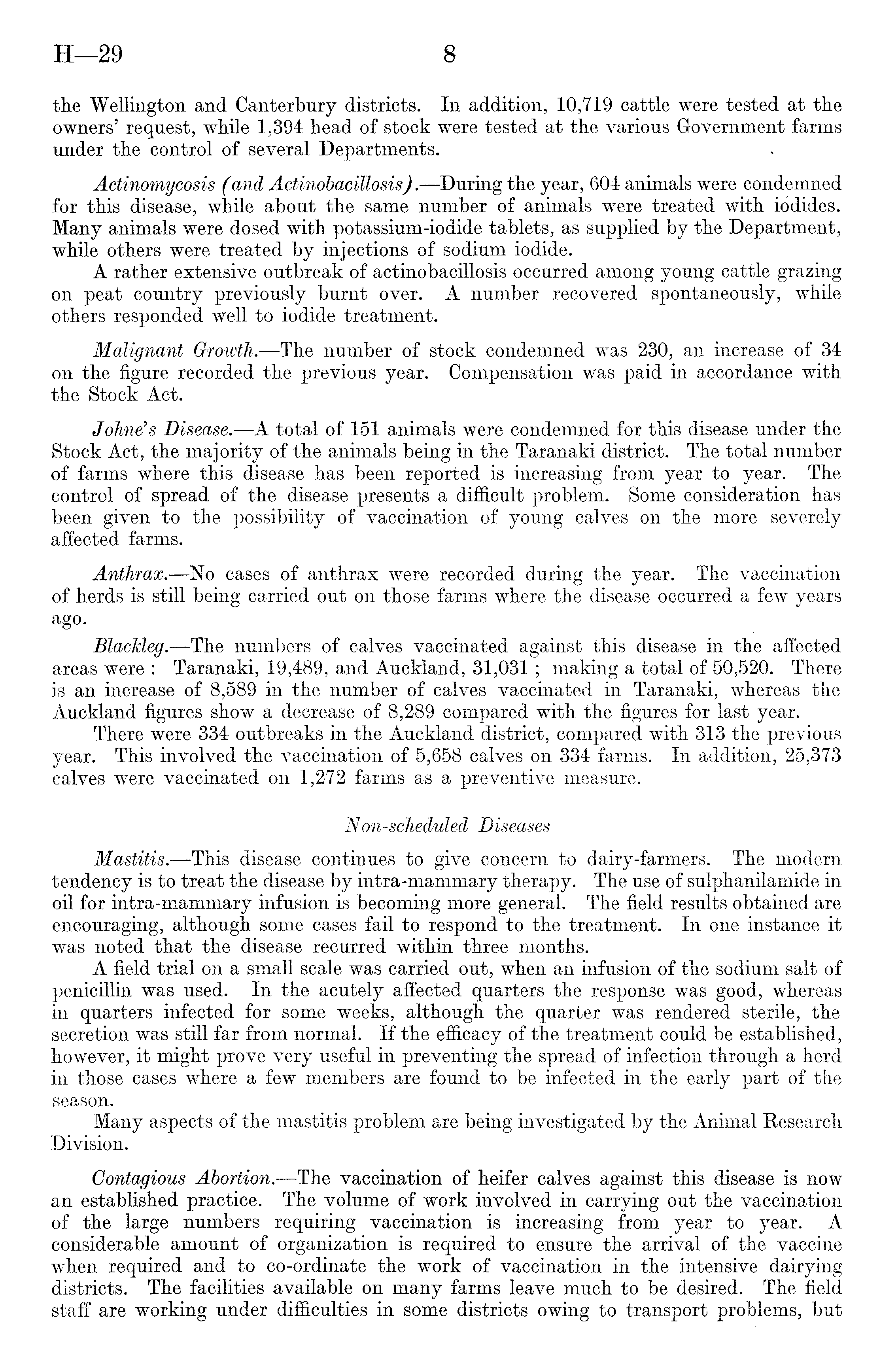 the Wellington and Canterbury districts. In addition, 10,719 cattle were tested at the owners' request, while 1,394 head of stock were tested at the various Government farms under the control of several Departments. Actinomycosis (and Actinobacillosis). —During the year, 604 animals were condemned for this disease, while about the same number of animals were treated with iodides. Many animals were dosed with potassium-iodide tablets, as supplied by the Department, while others were treated by injections of sodium iodide. A rather extensive outbreak of actinobacillosis occurred among young cattle grazing on peat country previously burnt over. A number recovered spontaneously, while others responded well to iodide treatment. Malignant Growth. —The number of stock condemned was 230, an increase of 34 on the figure recorded the previous year. Compensation was paid in accordance with the Stock Act. J ohm's Disease. —A total of 151 animals were condemned for this disease under the Stock Act, the majority of the animals being in the Taranaki district. The total number of farms where this disease has been reported is increasing from year to year. The control of spread of the disease presents a difficult problem. Some consideration has been given to the possibility of vaccination of young calves on the more severely affected farms. Anthrax. —No cases of anthrax were recorded during the year. The vaccination of herds is still being carried out on those farms where the disease occurred a few years ago. Blackleg. —The numbers of calves vaccinated against this disease in the affected areas were : Taranaki, 19,489, and Auckland, 31,031 ; making a total of 50,520. There is an increase of 8,589 in the number of calves vaccinated in Taranaki, whereas the Auckland figures show a decrease of 8,289 compared with the figures for last year. There were 334 outbreaks in the Auckland district, compared with 313 the previous year. This involved the vaccination of 5,658 calves on 334 farms. In addition, 25,373 calves were vaccinated on 1,272 farms as a preventive measure. Non-scheduled Diseases Mastitis.—This disease continues to give concern to dairy-farmers. The modern tendency is to treat the disease by intra-mammary therapy. The use of sulphanilamide in oil for intra-mammary infusion is becoming more general. The field results obtained are encouraging, although some cases fail to respond to the treatment. In one instance it was noted that the disease recurred within three months. A field trial on a small scale was carried out, when an infusion of the sodium salt of penicillin was used. In the acutely affected quarters the response was good, whereas in quarters infected for some weeks, although the quarter was rendered sterile, the secretion was still far from normal. If the efficacy of the treatment could be established, however, it might prove very useful in preventing the spread of infection through a herd in those cases where a few members are found to be infected in the early part of the season. Many aspects of the mastitis problem are being investigated by the Animal Research Division. Contagious Abortion.—The' vaccination of heifer calves against this disease is now an established practice. The volume of work involved in carrying out the vaccination of the large numbers requiring vaccination is increasing from year to year. A considerable amount of organization is required to ensure the arrival of the vaccine when required and to co-ordinate the work of vaccination in the intensive dairying districts. The facilities available on many farms leave much to be desired. The field staff are working under difficulties in some districts owing to transport problems, but
