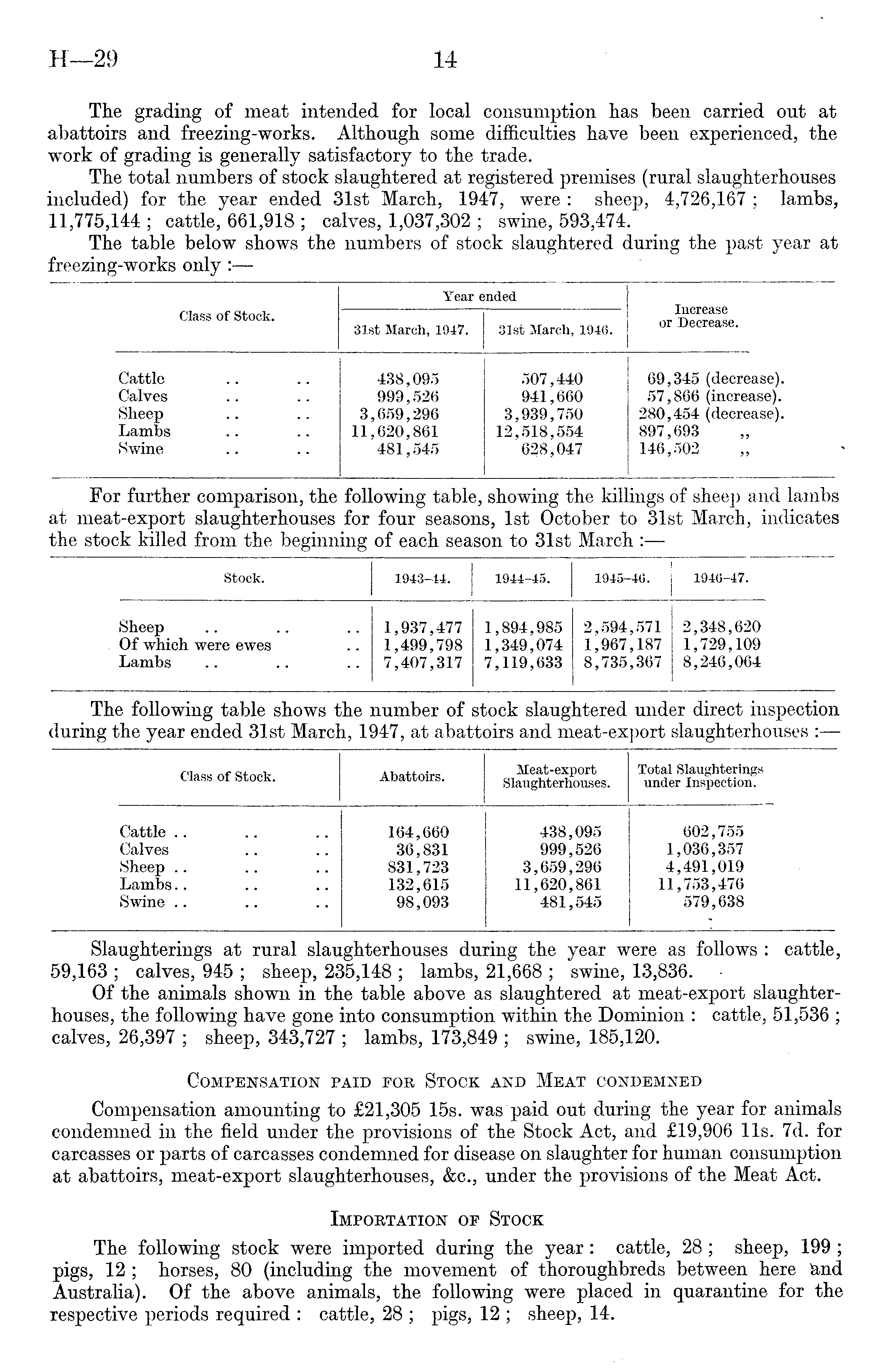 Slaughterings at rural slaughterhouses during the year were as follows : cattle, 59,163 ; calves, 945 ; sheep, 235,148 ; lambs, 21,668 ; swine, 13,836. Of the animals shown in the table above as slaughtered at meat-export slaughterhouses, the following have gone into consumption within the Dominion : cattle, 51,536 ; calves, 26,397 ; sheep, 343,727 ; lambs, 173,849 ; swine, 185,120. Compensation paid for Stock and Meat condemned Compensation amounting to £21,305 15s. was paid out during the year for animals condemned in the field under the provisions of the Stock Act, and £19,906 lis. 7d. for carcasses or parts of carcasses condemned for disease on slaughter for human consumption at abattoirs, meat-export slaughterhouses, &c., under the provisions of the Meat Act. Importation of Stock The following stock were imported during the year: cattle, 28; sheep, 199 ; pigs, 12 ; horses, 80 (including the movement of thoroughbreds between here iand Australia). Of the above animals, the following were placed in quarantine for the respective periods required : cattle, 28 ; pigs, 12 ; sheep, 14.