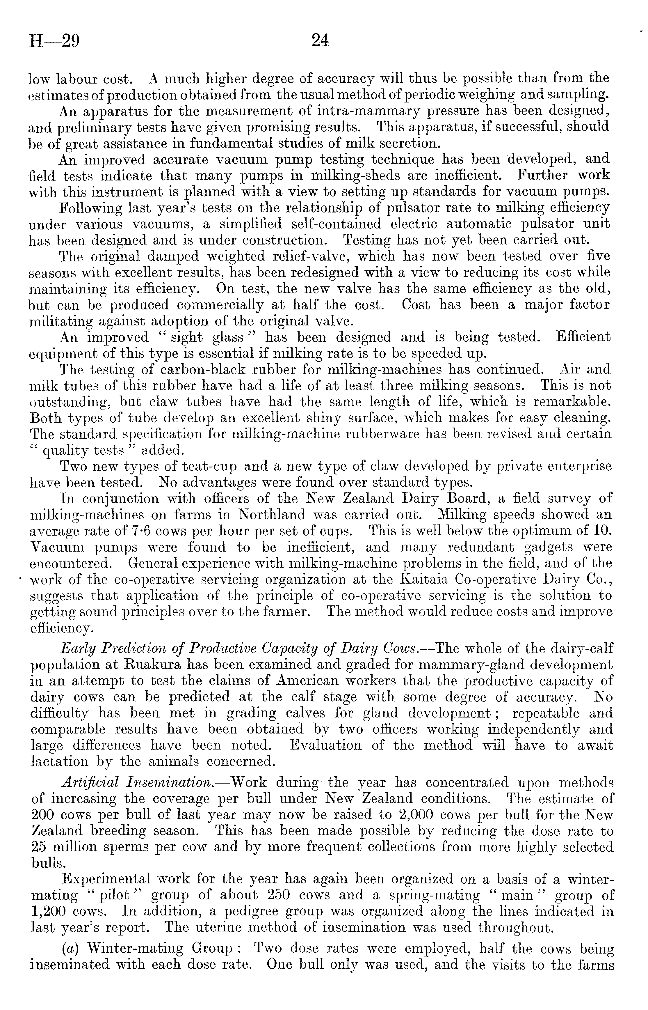 low labour cost. A much higher degree of accuracy will thus be possible than from the estimates of production obtained from the usual method of periodic weighing and sampling. An apparatus for the measurement of intra-mammary pressure has been designed, and preliminary tests have given promising results. This apparatus, if successful, should be of great assistance in fundamental studies of milk secretion. An improved accurate vacuum pump testing technique has been developed, and field tests indipate that many pumps in milking-sheds are inefficient. Further work with this instrument is planned with a view to setting up standards for vacuum pumps. Following last year's tests on the relationship of pulsator rate to milking efficiency under various vacuums, a simplified self-contained electric automatic pulsator unit has been designed and is under construction. Testing has not yet been carried out. The original damped weighted relief-valve, which has now been tested over five seasons with excellent results, has been redesigned with a view to reducing its cost while maintaining its efficiency. On test, the new valve has the same efficiency as the old, but can be produced commercially at half the cost. Cost has been a major factor militating against adoption of the original valve. An improved " sight glass " has been designed and is being tested. Efficient equipment of this type is essential if milking rate is to be speeded up. The testing of carbon-black rubber for milking-machines has continued. Air and milk tubes of this rubber have had a life of at least three milking seasons. This is not outstanding, but claw tubes have had the same length of life, which is remarkable. Both types of tube develop an excellent shiny surface, which makes for easy cleaning. The standard specification for milking-machine rubberware has been revised and certain " quality tests " added. Two new types of teat-cup and a new type of claw developed by private enterprise have been tested. No advantages were found over standard types. In conjunction with officers of the New Zealand Dairy Board, a field survey of milking-machines on farms in Northland was carried out. Milking speeds showed an average rate of 7-6 cows per hour per set of cups. This is well below the optimum of 10. Vacuum pumps were found to be inefficient, and many redundant gadgets were encountered. General experience with milking-machine problems in the field, and of the ' work of the co-operative servicing organization at the Kaitaia Co-operative Dairy Co., suggests that application of the principle of co-operative servicing is the solution to getting sound principles over to the farmer. The method would reduce costs and improve efficiency. Early Prediction of Productive Capacity of Dairy Cows.—The whole of the dairy-calf population at Ruakura has been examined and graded for mammary-gland development in an attempt to test the claims of American workers that the productive capacity of dairy cows can be predicted at the calf stage with some degree of accuracy. No difficulty has been met in grading calves for gland development; repeatable and comparable results have been obtained by two officers working independently and -large differences have been noted. Evaluation of the method will have to await lactation by the animals concerned. Artificial Insemination. —Work during the year has concentrated upon methods of increasing the coverage per bull under New Zealand conditions. The estimate of 200 cows per bull of last year may now be raised to 2,000 cows per bull for the New Zealand breeding season. This has been made possible by reducing the dose rate to 25 million sperms per cow and by more frequent collections from more highly selected bulls. Experimental work for the year has again been organized on a basis of a wintermating " pilot" group of about 250 cows and a spring-mating " main " group of 1,200 cows. In addition, a pedigree group was organized along the lines indicated in last year's report. The uterine method of insemination was used throughout. {a) Winter-mating Group : Two dose rates were employed, half the cows being inseminated with each dose rate. One bull only was used, and the visits to the farms