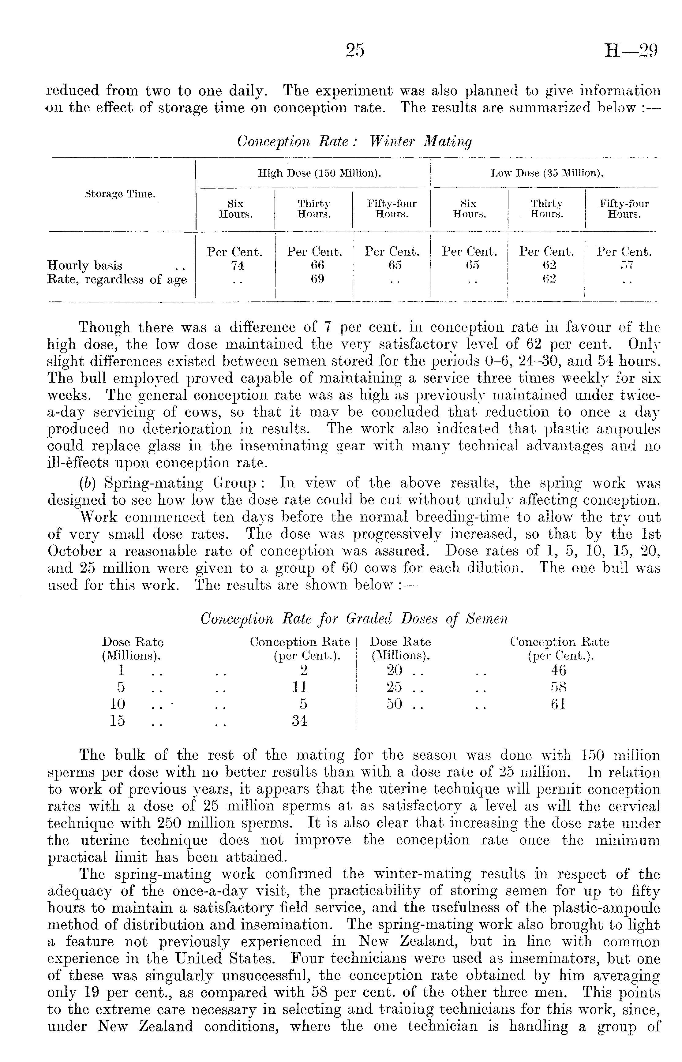 Though, there was a difference of 7 per cent, in conception rate in favour of the high dose, the low dose maintained the very satisfactory level of 62 per cent. Only slight differences existed between semen stored for the periods 0-6, 24-30, and 54 hours. The bull employed proved capable of maintaining a service three times weekly for six weeks. The general conception rate was as high as previously maintained under twice-a-day servicing of cows, so that it may be concluded that reduction to once a day produced no deterioration in results. The work also indicated that plastic ampoules could replace glass in the inseminating gear with many technical advantages and no ill-effects upon conception rate. (b) Spring-mating Group : In view of the above results, the spring work was designed to see how low the dose rate could be cut without unduly affecting conception. Work commenced ten days before the normal breeding-time to allow the try out of very small dose rates. The dose was progressively increased, so that by the Ist October a reasonable rate of conception was assured. Dose rates of 1, 5, 10, 15, 20, and 25 million were given to a group of 60 cows for each dilution. The one bull was used for this work. The results are shown below : Conception Rate for Graded Doses of Semen Dose Rate Conception Rate Dose Rate Conception Rate (Millions). (per Cent.). (Millions). (per Cent.). 1 .. .. 2 20 .. .. 46 5 .. 11 25 .. .. 58 10 .. • .. 5 50 .. .. 61 15 .. .. 34 The bulk of the rest of the mating for the season was done with 150 million sperms per dose with no better results than with a dose rate of 25 million. In relation to work of previous years, it appears that the uterine technique will permit conception rates with a dose of 25 million sperms at as satisfactory a level as will the cervical technique with 250 million sperms. It is also clear that increasing the dose rate under the uterine technique does not improve the conception rate once the minimum practical limit has been attained. The spring-mating work confirmed the winter-mating results in respect of the adequacy of the once-a-day visit, the practicability of storing semen for up to fifty hours to maintain a satisfactory field service, and the usefulness of the plastic-ampoule method of distribution and insemination. The spring-mating work also brought to light a feature not previously experienced in New Zealand, but in line with common experience in the United States. Four technicians were used as inseminators, but one of these was singularly unsuccessful, the conception rate obtained by him averaging only 19 per cent., as compared with 58 per cent, of the other three men. This points to the extreme care necessary in selecting and training technicians for this work, since, under New Zealand conditions, where the one technician is handling a group of