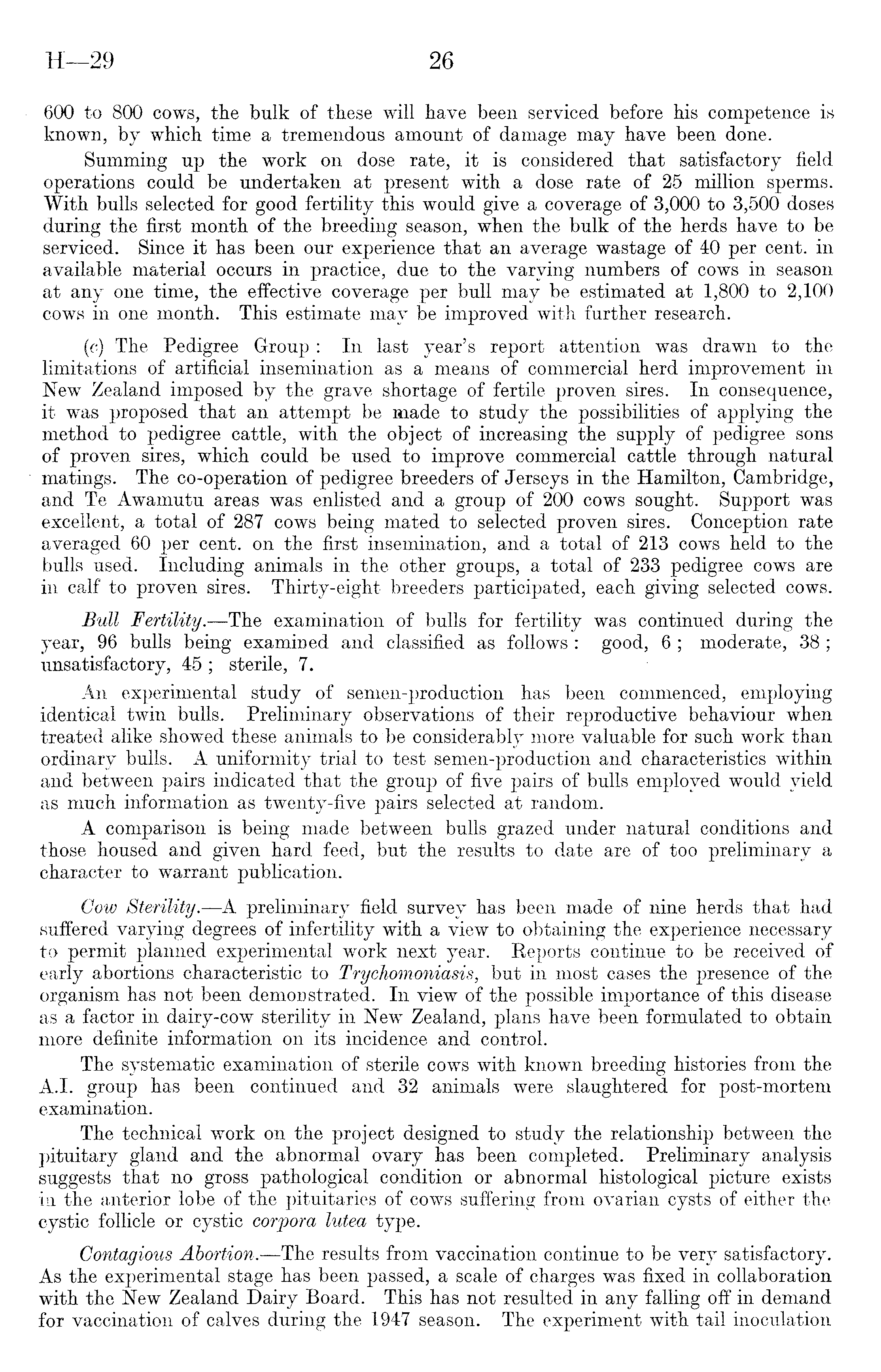 600 to 800 cows, the bulk of these will have been serviced before his competence is known, by which time a tremendous amount of damage may have been done. Summing up the work on dose rate, it is considered that satisfactory field operations could be undertaken at present with a dose rate of 25 million sperms. With bulls selected for good fertility this would give a coverage of 3,000 to 3,500 doses during the first month of the breeding season, when the bulk of the herds have to be serviced. Since it has been our experience that an average wastage of 40 per cent, in available material occurs in practice, due to the varying numbers of cows in season at any one time, the effective coverage per bull may be estimated at 1,800 to 2,100 cows in one month. This estimate may be improved with further research. (c) The Pedigree Group : In last year's report attention was drawn to the limitations of artificial insemination as a means of commercial herd improvement in New Zealand imposed by the grave shortage of fertile proven sires. In consequence, it was proposed that an attempt be made to study the possibilities of applying the method to pedigree cattle, with the object of increasing the supply of pedigree sons of proven sires, which could be used to improve commercial cattle through natural matings. The co-operation of pedigree breeders of Jerseys in the Hamilton, Cambridge, and Te Awamutu areas was enlisted and a group of 200 cows sought. Support was excellent, a total of 287 cows being mated to selected proven sires. Conception rate averaged 60 per cent, on the first insemination, and a total of 213 cows held to the bulls used. Including animals in the other groups, a total of 233 pedigree cows are in calf to proven sires. Thirty-eight breeders participated, each giving selected cows. Bull Fertility.—The examination of bulls for fertility was continued during the year, 96 bulls being examined and classified as follows : good, 6 ; moderate, 38 ; unsatisfactory, 45 ; sterile, 7. An experimental study of semen-production has been commenced, employing identical twin bulls. Preliminary observations of their reproductive behaviour when treated alike showed these animals to'be considerably more valuable for such work than ordinary bulls. A uniformity trial to test semen-production and characteristics within and between pairs indicated that the group of five pairs of bulls employed would yield as much information as twenty-five pairs selected at random. A comparison is being made between bulls grazed under natural conditions and those housed and given hard feed, but the results to date are of too preliminary a character to warrant publication. Cow Sterility. —A preliminary field survey has been made of nine herds that had suffered varying degrees of infertility with a view to obtaining the experience necessary to permit planned experimental work next year. Reports continue to be received of early abortions characteristic to Trychomoniasis, but in most cases the presence of the organism has not been demonstrated. In view of the possible importance of this disease as a factor in dairy-cow sterility in New Zealand, plans have been formulated to obtain more definite information on its incidence and control. The systematic examination of sterile cows with known breeding histories from the A.I. group has been continued and 32 animals were slaughtered for post-mortem examination. The technical work on the project designed to study the relationship between the pituitary gland and the abnormal ovary has been completed. Preliminary analysis suggests that no gross pathological condition or abnormal histological picture exists in the anterior lobe of the pituitaries of cows suffering from ovarian cysts of either the cystic follicle or cystic corpora lutea type. Contagious Abortion.—The results from vaccination continue to be very satisfactory. As the experimental stage has been passed, a scale of charges was fixed in collaboration with the New Zealand Dairy Board. This has not resulted in any falling off in demand for vaccination of calves during the 1947 season. The experiment with tail inoculation