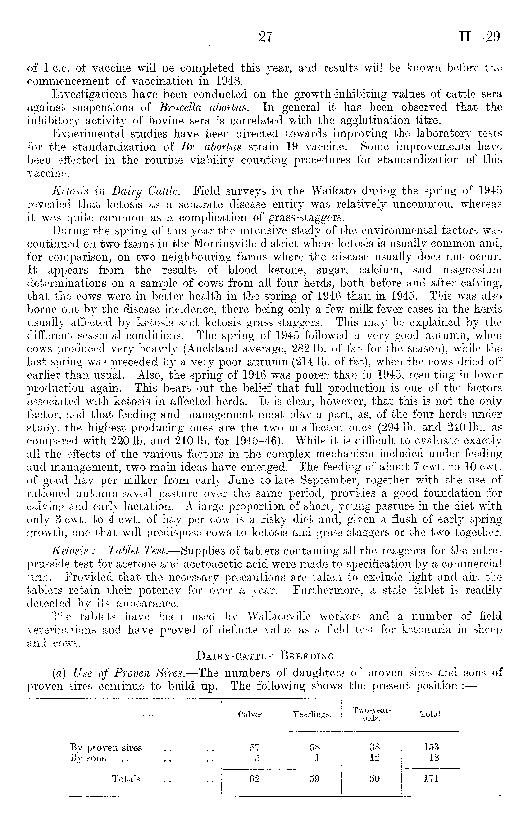 of 1 c.c. of vaccine will be completed this year, and results will be known before the commencement of vaccination in 1948. Investigations have been conducted on the growth-inhibiting values of cattle sera against suspensions of Brucella abortus. In general it has been observed that the inhibitory activity of bovine sera is correlated with the agglutination titre. Experimental studies have been directed towards improving the laboratory tests for the standardization of Br. abortus strain 19 vaccine. Some improvements have been effected in the routine viability counting procedures for standardization of this vaccine. Ketosis in Dairy Cattle.—Field surveys in the Waikato during the spring of 1945 revealed that ketosis as a separate disease entity was relatively uncommon, whereas it was quite common as a complication of grass-staggers. During the spring of this year the intensive study of the environmental factors was continued on two farms in the Morrinsville district where ketosis is usually common and, for comparison, on two neighbouring farms where the disease usually does not occur. It appears from the results of blood ketone, sugar, calcium, and magnesium determinations on a sample of cows from all four herds, both before and after calving, that the cows were in better health in the spring of 1946 than in 1945. This was also borne out by the disease incidence, there being only a few milk-fever cases in the herds usually affected by ketosis and ketosis grass-staggers. This may be explained by the different seasonal conditions. The spring of 1945 followed a very good autumn, when cows produced very heavily (Auckland average, 282 lb. of fat for the season), while the last spring was preceded by a very poor autumn (214 lb. of fat), when the cows dried off earlier than usual. Also, the spring of 1946 was poorer than in 1945, resulting in lower production again. This bears out the belief that full production is one of the factors associated with ketosis in affected herds. It is clear, however, that this is not the only factor, and that feeding and management must play a part, as, of the four herds under study, the highest producing ones are the two unaffected ones (294 lb. and 240 lb., as compared with 220 lb. and 210 lb. for 1945-46). While it is difficult to evaluate exactly all the effects of the various factors in the complex mechanism included under feeding and management, two main ideas have emerged. The feeding of about 7 cwt. to 10 cwt. of good hay per milker from early June to late September, together with the use of rationed autumn-saved pasture over the same period, provides a good foundation for calving and early lactation. A large proportion of short, young pasture in the diet with only 3 cwt. to 4 cwt. of hay per cow is a risky diet and, given a flush of early spring growth, one that will predispose cows to ketosis and grass-staggers or the two together. Ketosis : Tablet Test.—Supplies of tablets containing all the reagents for the nitroprusside test for acetone and acetoacetic acid were made to specification by a commercial firm. Provided that the necessary precautions are taken to exclude light and air, the tablets retain their potency for over a year. Furthermore, a stale tablet is readily detected by its appearance. The tablets have been used by Wallaceville workers and a number of field veterinarians and have proved of definite value as a field test for ketonuria in sheep and cows. Dairy-cattle Breeding (a) Use of Proven Sires. —The numbers of daughters of proven sires and sons of proven sires continue to build up. The following shows the present position:—