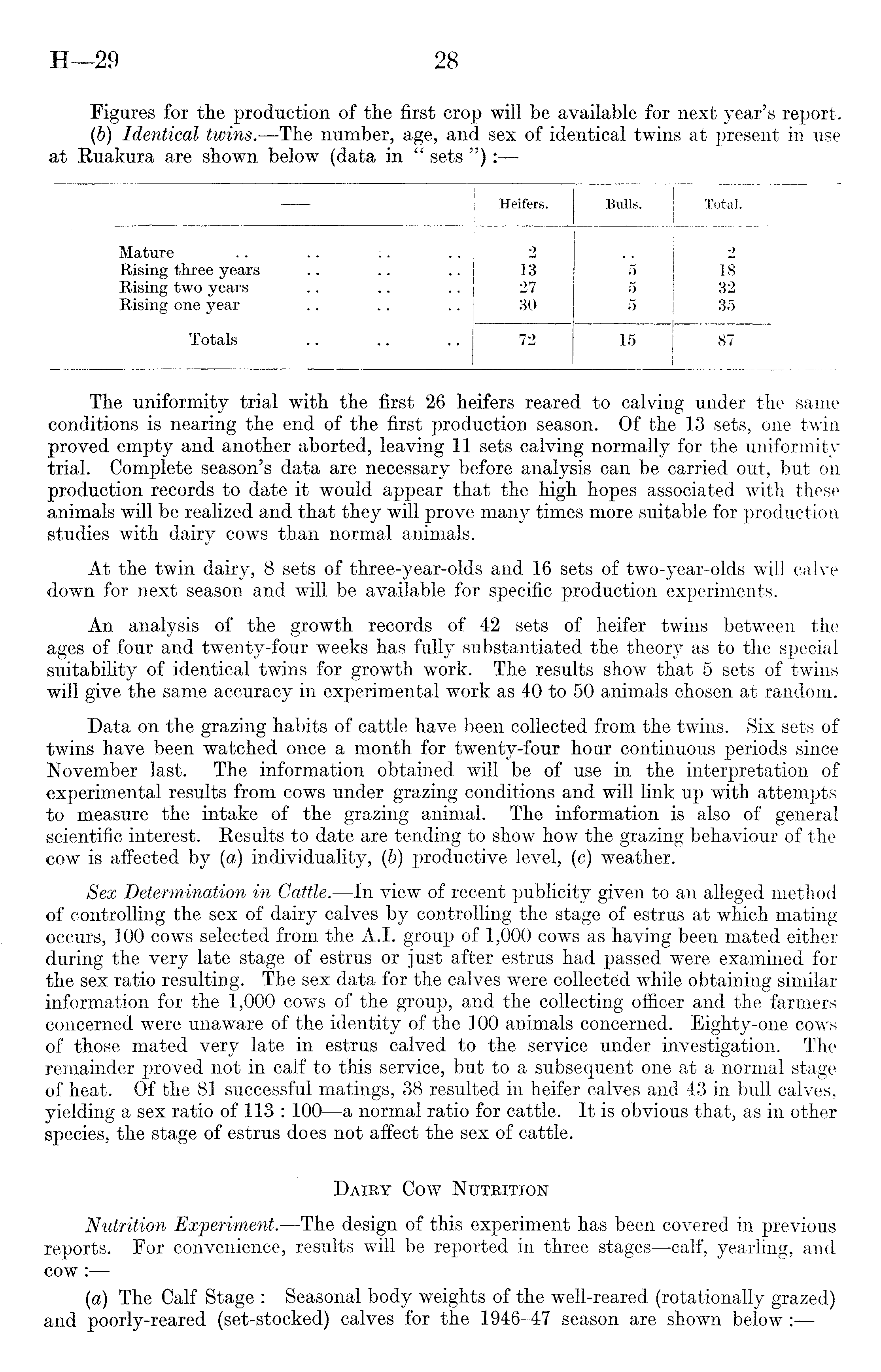 The uniformity trial with the first 26 heifers reared to calving under the same conditions is nearing the end of the first production season. Of the 13 sets, one twin proved empty and another aborted, leaving 11 sets calving normally for the uniformity trial. Complete season's data are necessary before analysis can be carried out, but on production records to date it would appear that the high hopes associated with these animals will be realized and that they will prove many times more suitable for production studies with dairy cows than normal animals. At the twin dairy, 8 sets of three-year-olds and 16 sets of two-year-olds will calve down for next season and will be available for specific production experiments. An analysis of the growth records of 42 sets of heifer twins between the ages of four and twenty-four weeks has fully substantiated the theory as to the special suitability of identical twins for growth work. The results show that 5 sets of twins will give the same accuracy in experimental work as 40 to 50 animals chosen at random. Data on the grazing habits of cattle have been collected from the twins. Six sets of twins have been watched once a month for twenty-four hour continuous periods since November last. The information obtained will be of use in the interpretation of experimental results from cows under grazing conditions and will link up with attempts to measure the intake of the grazing animal. The information is also of general scientific interest. Results to date are tending to show how the grazing behaviour of the cow is affected by (a) individuality, (6) productive level, (c) weather. Sex Determination in Cattle.—ln view of recent publicity given to an alleged method of controlling the sex of dairy calves by controlling the stage of estrus at which mating occurs, 100 cows selected from the A.I. group of 1,000 cows as having been mated either during the very late stage of estrus or just after estrus had passed were examined for the sex ratio resulting. The sex data for the calves were collected while obtaining similar information for the 1,000 cows of the group, and the collecting officer and the farmers concerned were unaware of the identity of the 100 animals concerned. Eighty-one cows of those mated very late in estrus calved to the service under investigation. The remainder proved not in calf to this service, but to a subsequent one at a normal stage of heat. Of the 81 successful matings, 38 resulted in heifer calves and 43 in bull calves, yielding a sex ratio of 113 :100—a normal ratio for cattle. It is obvious that, as in other species, the stage of estrus does not affect the sex of cattle. Dairy Cow Nutrition Nutrition Experiment. —The design of this experiment has been covered in previous reports. For convenience, results will be reported in three stages —calf, yearling, and cow : (a) The Calf Stage : Seasonal body weights of the well-reared (rotationally grazed) and poorly-reared (set-stocked) calves for the 1946-47 season are shown below :