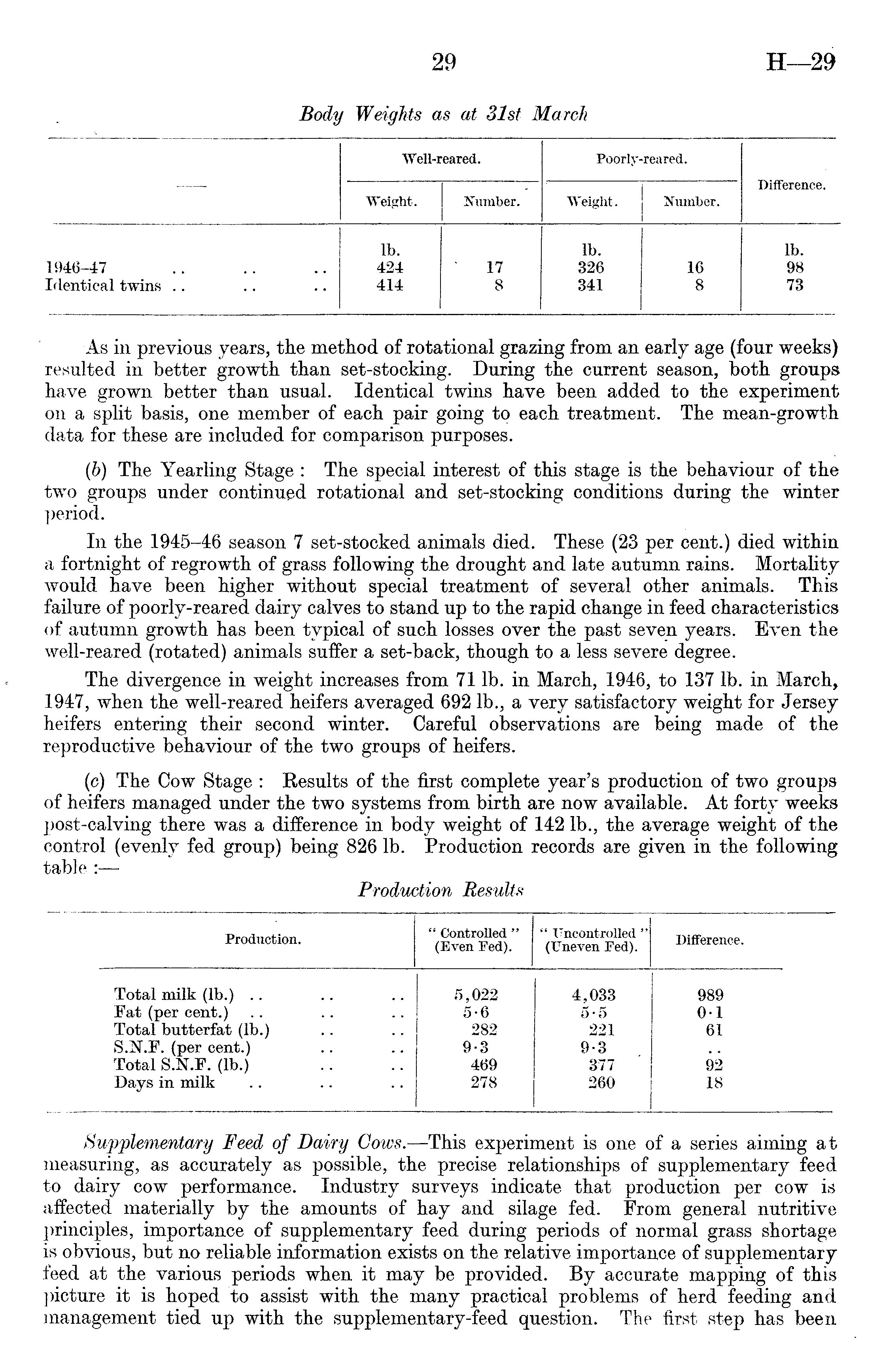 As in previous years, the method of rotational grazing from an early age (four weeks) resulted in better growth than set-stocking. During the current season, both groups have grown better than usual. Identical twins have been added to the experiment on a split basis, one member of each pair going to each treatment. The mean-growth data for these are included for comparison purposes. (6) The Yearling Stage : The special interest of this stage is the behaviour of the two groups under continued rotational and set-stocking conditions during the winter period. In the 1945-46 season 7 set-stocked animals died. These (23 per cent.) died within a fortnight of regrowth of grass following the drought and late autumn rains. Mortality would have been higher without special treatment of several other animals. This failure of poorly-reared dairy calves to stand up to the rapid change in feed characteristics of autumn growth has been typical of such losses over the past seven years. Even the well-reared (rotated) animals suffer a set-back, though to a less severe degree. The divergence in weight increases from 71 lb. in March, 1946, to 137 lb. in March, 1947, when the well-reared heifers averaged 692 lb., a very satisfactory weight for Jersey heifers entering their second winter. Careful observations are being made of the reproductive behaviour of the two groups of heifers. (c) The Cow Stage : Results of the first complete year's production of two groups of heifers managed under the two systems from birth are now available. At forty weeks post-calving there was a difference in body weight of 142 lb., the average weight of the control (evenly fed group) being 826 lb. Production records are given in the following table :