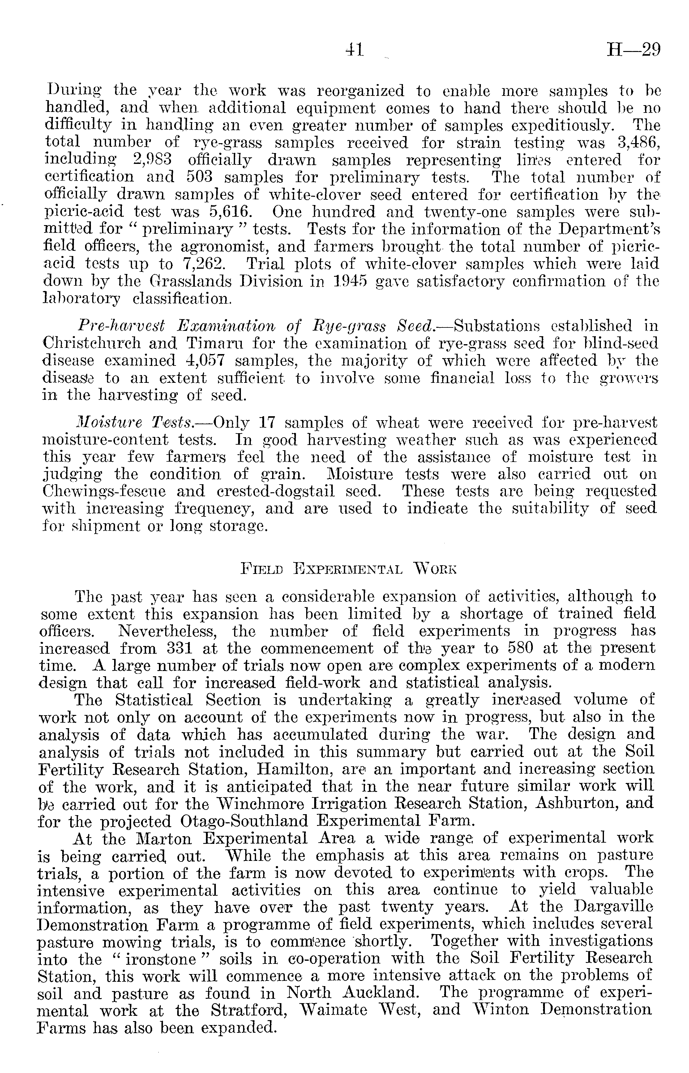 During the year the work was reorganized to enable more samples to be handled, and when additional equipment comes to hand there should be no difficulty in handling an even greater number of samples expeditiously. The total number of rye-grass samples received for strain testing was 3,486, including 2,983 officially drawn samples representing lines entered for certification and 503 samples for preliminary tests. The total number of officially drawn samples of white-clover seed entered for certification by the picric-acid test was 5,616. One hundred and twenty-one samples were submitted for " preliminary " tests. Tests for the information of the Department's field officers, the agronomist, and farmers brought the total number of picricacid tests up to 7,262. Trial plots of white-clover samples which were laid down by the Grasslands Division in. 1945 gave satisfactory confirmation of the laboratory classification. Pre-harves't Examination of Bye-grass Seed.—Substations established in Ohristchurch and Timaru for the examination of rye-grass seed for blind-seed disease examined 4,057 samples, the majority of which were affected by the disease to an extent sufficient to involve some financial loss to the growers in the harvesting of seed. Moisture T<&sts. —Only 17 samples of wheat were received for pre-harvest moisture-content tests. In good harvesting weather such as was experienced this year few farmers feel the need of the assistance of moisture test in judging the condition of grain. Moisture tests were also carried out on Chewings-fescue and crested-dogstail seed. These tests are being requested with increasing frequency, and are used to indicate the suitability of seed for shipment or long storage. Field Experimental Work The past year has seen a considerable expansion of activities, although to some extent this expansion has been limited by a shortage of trained field officers. Nevertheless, the number of field experiments in progress has increased from 331 at the commencement of th'e year to 580 at thei present time. A large number of trials now open are complex experiments of a modern design that call for increased field-work and statistical analysis. The Statistical Section is undertaking a greatly increased volume of work not only on account of the experiments now in progress, but also in the analysis of data which has accumulated during the war. The design and analysis of trials not included in this summary but carried out at the Soil Fertility Research Station, Hamilton, are an important and increasing section of the work, and it is anticipated that in the near future similar work will ba carried out for the Winchmore Irrigation Research Station, Ashburton, and for the projected Otago-Southland Experimental Farm. At the Marton Experimental Area a wide range of experimental work is being carried, out. While the emphasis at this area remains on pasture trials, a portion of the farm is now devoted to experiments with crops. The intensive experimental activities on this area continue to yield valuable information, as they have over the past twenty years. At the Dargaville Demonstration Farm a programme of field experiments, which includes several pasture mowing trials, is to commence shortly. Together with investigations into the " ironstone " soils in co-operation with the Soil Fertility Research Station, this work will commence a more intensive attack on the problems of soil and pasture as found in North Auckland. The programme of experimental work at the Stratford, Waimate West, and Winton Demonstration Farms has also been expanded.