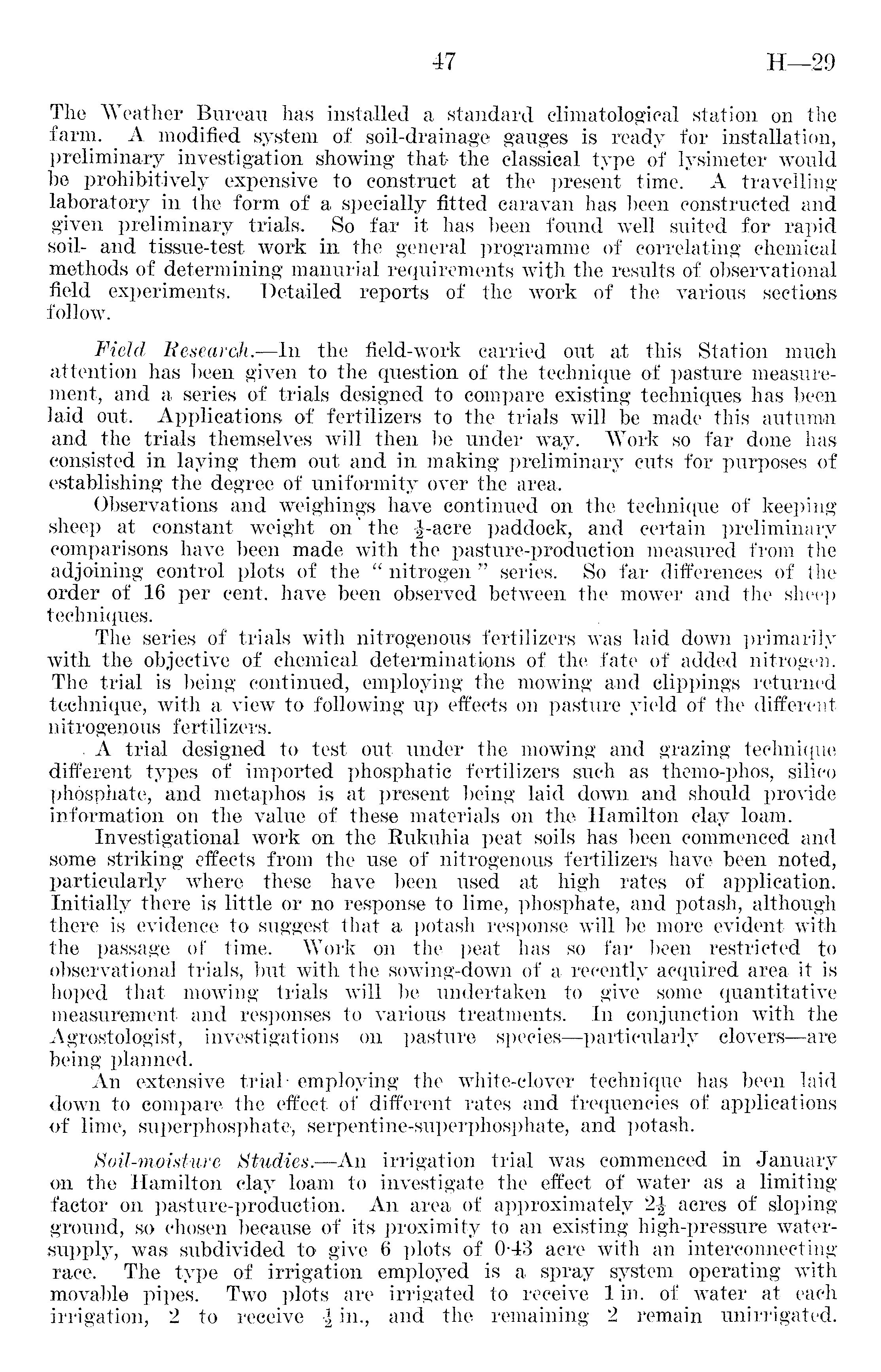 The Weather Bureau has installed a standard climatological station on the farm. A modified system of soil-drainage gauges is ready for installation, preliminary investigation showing thafc the classical type of lysimeter would "be prohibitively expensive to construct at the present time. A travelling laboratory in the form of a specially fitted caravan has been constructed and given preliminary trials. So far it has been found well suited for rapid soil- and tissue-test work in the general programme of correlating chemical methods of determining manurial requirements with the results of observational field experiments. Detailed reports of the work of the various sections follow. Field Research.—ln the field-work carried out at this Station much attention has been given to the question of the technique of pasture measurement, and a series of trials designed to compare existing techniques has been laid out. Applications of fertilizers to the trials will be made this autumn and the trials themselves will then be under way. Work so far done has consisted in laying them out and in making preliminary cuts for purposes of establishing the degree of uniformity over the area. Observations and weighings have continued on the technique of keeping sheep at constant weight on' the £-acre paddock, and certain preliminary comparisons have been made with the pasture-production measured from the adjoining control plots of the " nitrogen " series. So far differences of the order of 16 per cent, have been observed between the mower and the sheep techniques. The series of trials with nitrogenous fertilizers was laid down primarily with the objective of chemical determinations of the fate of added nitrogen. The trial is being continued, employing the mowing and clippings returned technique, with a view to following up effects on pasture yield of the different nitrogenous fertilizers. A trial designed to test out under the mowing and grazing technique different types of imported phosphatic fertilizers such as themo-phos, silico phosphate, and metaphos is at present being laid down and should provide information on the value of these materials on the Hamilton clay loam. Investigational work on the Rukuhia peat soils has been commenced and some striking effects from the use of nitrogenous fertilizers have been noted, particularly where these have been used at high rates of application. Initially there is little or no response to lime, phosphate, and potash, although there is evidence to suggest that a potash response will be more evident with the passage of time. Work on the peat has so far been restricted to observational trials, but with the sowing-down of a recently acquired area, it is hoped that mowing trials will be undertaken to give some quantitative measurement and responses to various treatments. In conjunction with the Agrostologist, investigations on pasture species—particularly clovers —are being planned. An extensive trial- employing the white-clover technique has been laid down to compare the effect of . different rates and frequencies of applications of lime, superphosphate, serpentine-superphosphate, and potash. Soil-moisture Studies.—An irrigation trial was commenced in January on the Hamilton clay loam to investigate the effect of water as a limiting factor on pasture-production. An area of approximately acres of sloping ground, so chosen because of its proximity to an existing high-pressure watersupply, was subdivided to give 6 plots of 043 acre with an interconnecting race. The type of irrigation employed is a spray system operating with movable pipes. Two plots are irrigated to receive 1 in. of water at each irrigation, 2 to receive in., and the remaining 2 remain" unirrigated.