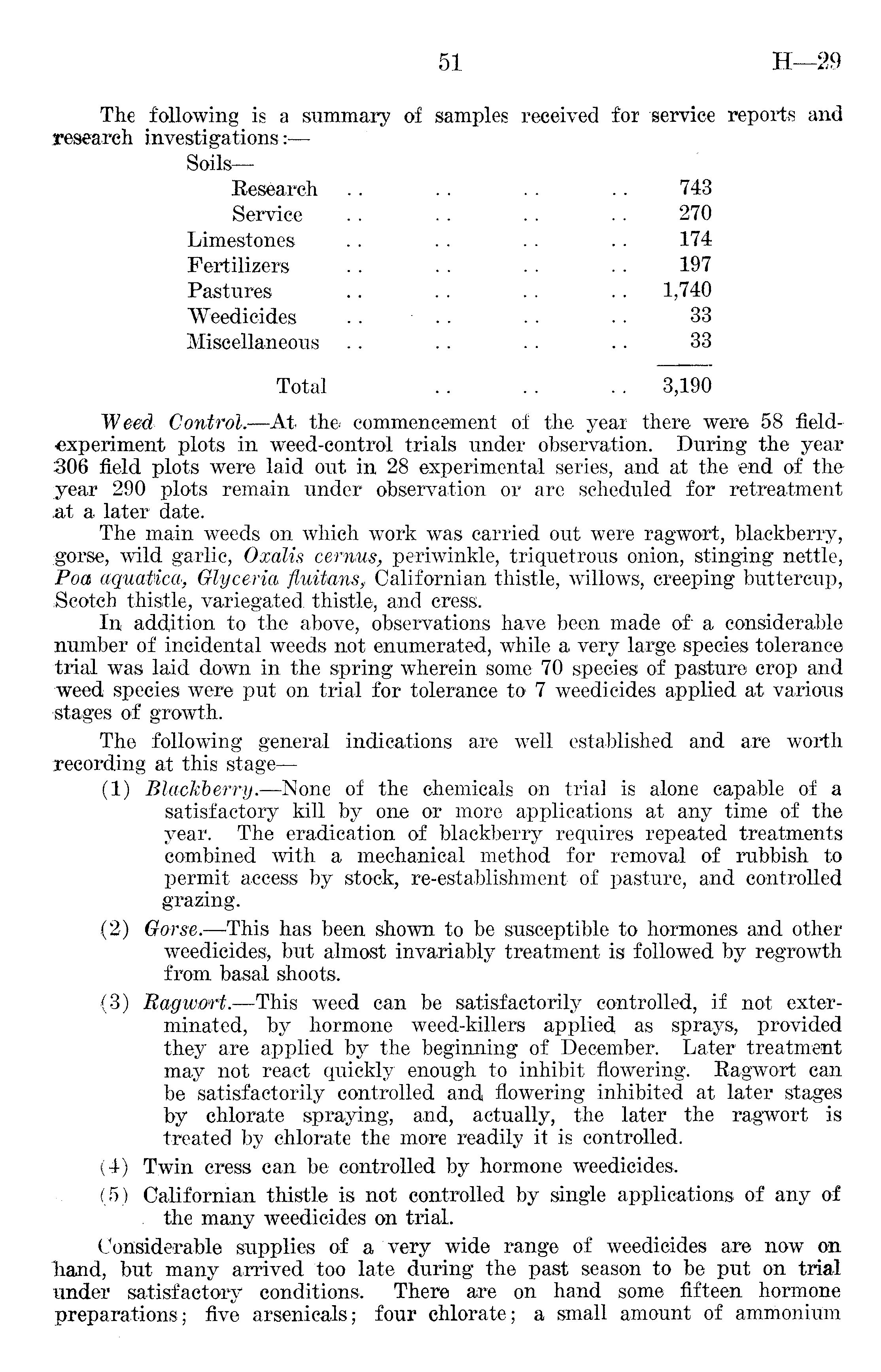 The following is a summary of samples received for service reports and research investigations:— Soils — Research .. . . .. .. 743 Service .. . . .. . . 270 Limestones . . . . . . . . 174 Fertilizers .. . . . . .. 197 Pastures .. .. .. .. 1,740 Weedieides .. .. .. .. 33 Miscellaneous .. .. .. .. 33 Total 3,190 Weed Control. —At the commencement of the year there were 58 fieldexperiment plots in weed-control trials under observation. During the year 306 field plots were laid out in 28 experimental series, and at the end of theyear 290 plots remain under observation or are scheduled for retreatment &t a later date. The main weeds on which work was carried out were ragwort, blackberry, gorse, wild garlic, Oxdlis cem/usa, periwinkle, triquetrous onion, stinging nettle, Poa aquaMca, Glyceric/, fluitcms, Californian thistle, willows, creeping buttercup, .Scotch thistle, variegated, thistle, and cress. In addition to the above, observations have been made of a considerable number of incidental weeds not enumerated, while a very large species tolerance trial was laid down in the spring wherein some 70 species of pasture crop and weed species were put on trial for tolerance to 7 weedieides applied at various stages of growth. The following general indications are well established and are worth recording at this stage—(l) Blackberry.—None of the chemicals on trial is alone capable of a satisfactory kill by one or more applications at any time of the year. The eradication of blackberry requires repeated treatments combined with a mechanical method for removal of rubbish to permit access by stock, re-establishment of pasture, and controlled grazing. (2) Gorse.—This has been shown to be susceptible to hormones and other weedieides, but almost invariably treatment is followed by regrowth from basal shoots. (3) Ragwort.—This weed can be satisfactorily controlled, if not exterminated, by hormone weed-killers applied as sprays, provided they are applied by the beginning of December. Later treatment may not react quickly enough to inhibit flowering. Ragwort can be satisfactorily controlled and flowering inhibited at later stages by chlorate spraying, and, actually, the later the ragwort is treated by chlorate the more readily it is controlled. (4) Twin cress can be controlled by hormone weedieides. (5) Californian thistle is not controlled by single applications of any of the many weedieides on trial. Considerable supplies of a very wide range of weedieides are now on hand, but many arrived too late during the past season to be put on trial under satisfactory conditions. There are on hand some fifteen hormone preparations; five arsenicals; four chlorate; a small amount of ammonium