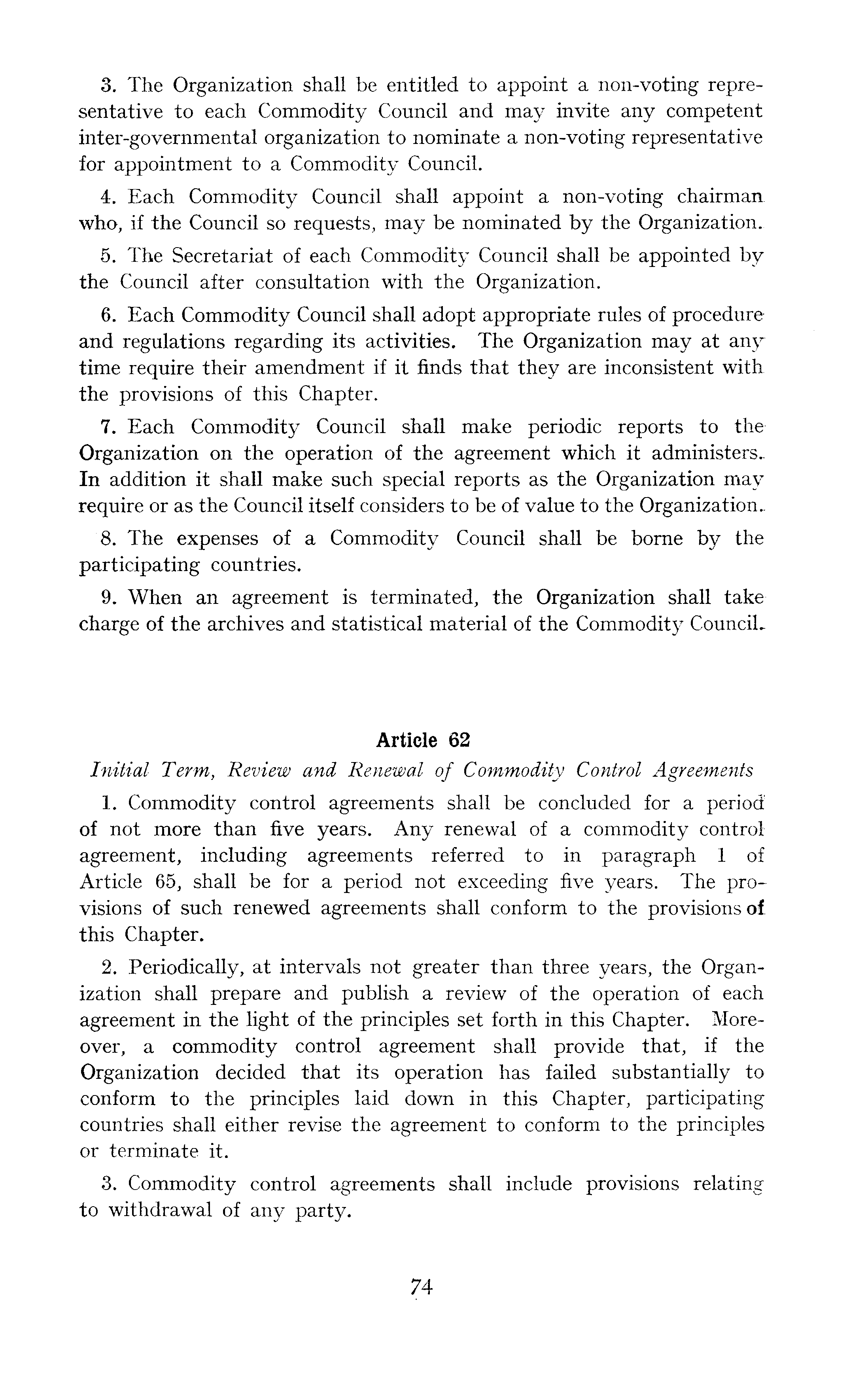 3. The Organization shall be entitled to appoint a non-voting representative to each Commodity Council and may invite any competent inter-governmental organization to nominate a non-voting representative for appointment to a Commodity Council. 4. Each Commodity Council shall appoint a non-voting chairman who, if the Council so requests, may be nominated by the Organization. 5. The Secretariat of each Commodity Council shall be appointed by the Council after consultation with the Organization. 6. Each Commodity Council shall adopt appropriate rules of procedure and regulations regarding its activities. The Organization may at any time require their amendment if it finds that they are inconsistent with the provisions of this Chapter. 7. Each Commodity Council shall make periodic reports to the Organization on the operation of the agreement which it administers. In addition it shall make such special reports as the Organization may require or as the Council itself considers to be of value to the Organization. 8. The expenses of a Commodity Council shall be borne by the participating countries. 9. When an agreement is terminated, the Organization shall take charge of the archives and statistical material of the Commodity Council. Article 62 Initial Term, Review and Renewal of Commodity Control Agreements 1. Commodity control agreements shall be concluded for a period of not more than five years. Any renewal of a commodity control agreement, including agreements referred to in paragraph 1 of Article 65, shall be for a period not exceeding five years. The provisions of such renewed agreements shall conform to the provisions of this Chapter. 2. Periodically, at intervals not greater than three years, the Organization shall prepare and publish a review of the operation of each agreement in the light of the principles set forth in this Chapter. Moreover, a commodity control agreement shall provide that, if the Organization decided that its operation has failed substantially to conform to the principles laid down in this Chapter, participating countries shall either revise the agreement to conform to the principles or terminate it. 3. Commodity control agreements shall include provisions relating to withdrawal of any party.