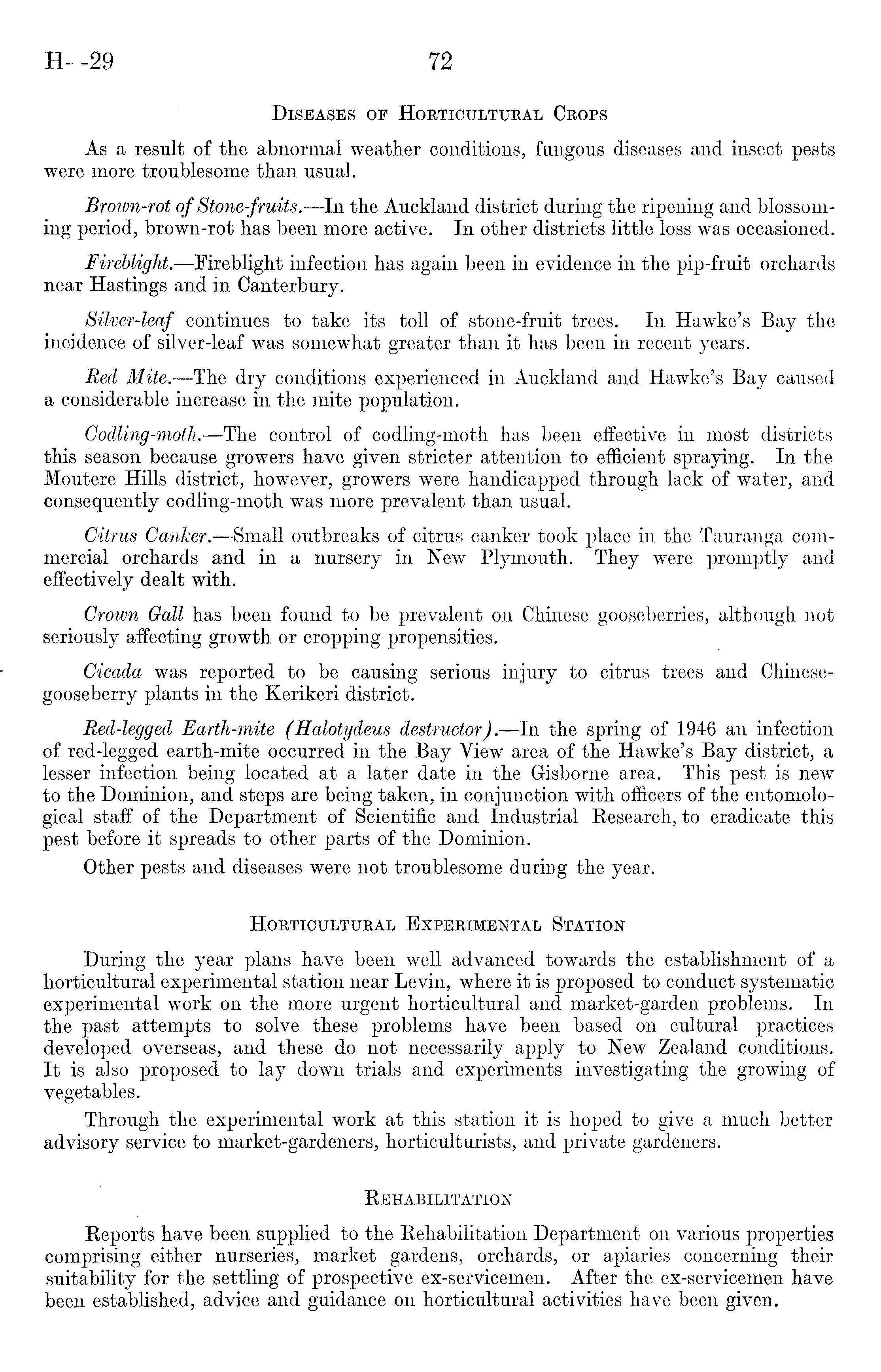 Diseases of Horticultural Crops As a result of the abnormal weather conditions, fungous diseases and insect pests were more troublesome than usual. Brown-rot of Stone-fruits. —In the Auckland district during the ripening and blossoming period, brown-rot has been more active. In other districts little loss was occasioned. Fireblight.—Fireblight infection has again been in evidence in the pip-fruit orchards near Hastings and in Canterbury. Silver-leaf continues to take its toll of stone-fruit trees. In Hawke's Bay the incidence of silver-leaf was somewhat greater than it has been in recent years. Red Mite. —The dry conditions experienced in Auckland and Hawke's Bay caused a considerable increase in the mite population. Codling-moth.—The control of codling-moth has been effective in most districts this season because growers have given stricter attention to efficient spraying. In the Moutere Hills district, however, growers were handicapped through lack of water, and consequently codling-moth was more prevalent than usual. Citrus Canker.—Small outbreaks of citrus canker took place in the Tauranga commercial orchards and in a nursery in New Plymouth. They were promptly and effectively dealt with. Crown Gall has been found to be prevalent on Chinese gooseberries, although not seriously affecting growth or cropping propensities. Cicada was reported to be causing serious injury to citrus trees and Chinesegooseberry plants in the Kerikeri district. Red-legged Earth-mite (Halotydeus destructor). —In the spring of 194:6 an infection of red-legged earth-mite occurred in the Bay View area of the Hawke's Bay district, a lesser infection being located at a later date in the Gisborne area. This pest is new to the Dominion, and steps are being taken, in conjunction with officers of the entomological staff of the Department of Scientific and Industrial Research, to eradicate this pest before it spreads to other parts of the Dominion. Other pests and diseases were not troublesome during the year. Horticultural Experimental Station During the year plans have been well advanced towards the establishment of a horticultural experimental station near Levin, where it is proposed to conduct systematic experimental work on the more urgent horticultural and market-garden problems. In the past attempts to solve these problems have been based on cultural practices developed overseas, and these do not necessarily apply to New Zealand conditions. It is also proposed to lay down trials and experiments investigating the growing of vegetables. Through the experimental work at this station it is hoped to give a much better advisory service to market-gardeners, horticulturists, and private gardeners. Rehabilitation Reports have been supplied to the Rehabilitation Department on various properties comprising either nurseries, market gardens, orchards, or apiaries concerning their suitability for the settling of prospective ex-servicemen. After the ex-servicemen have been established, advice and guidance on horticultural activities have been given.