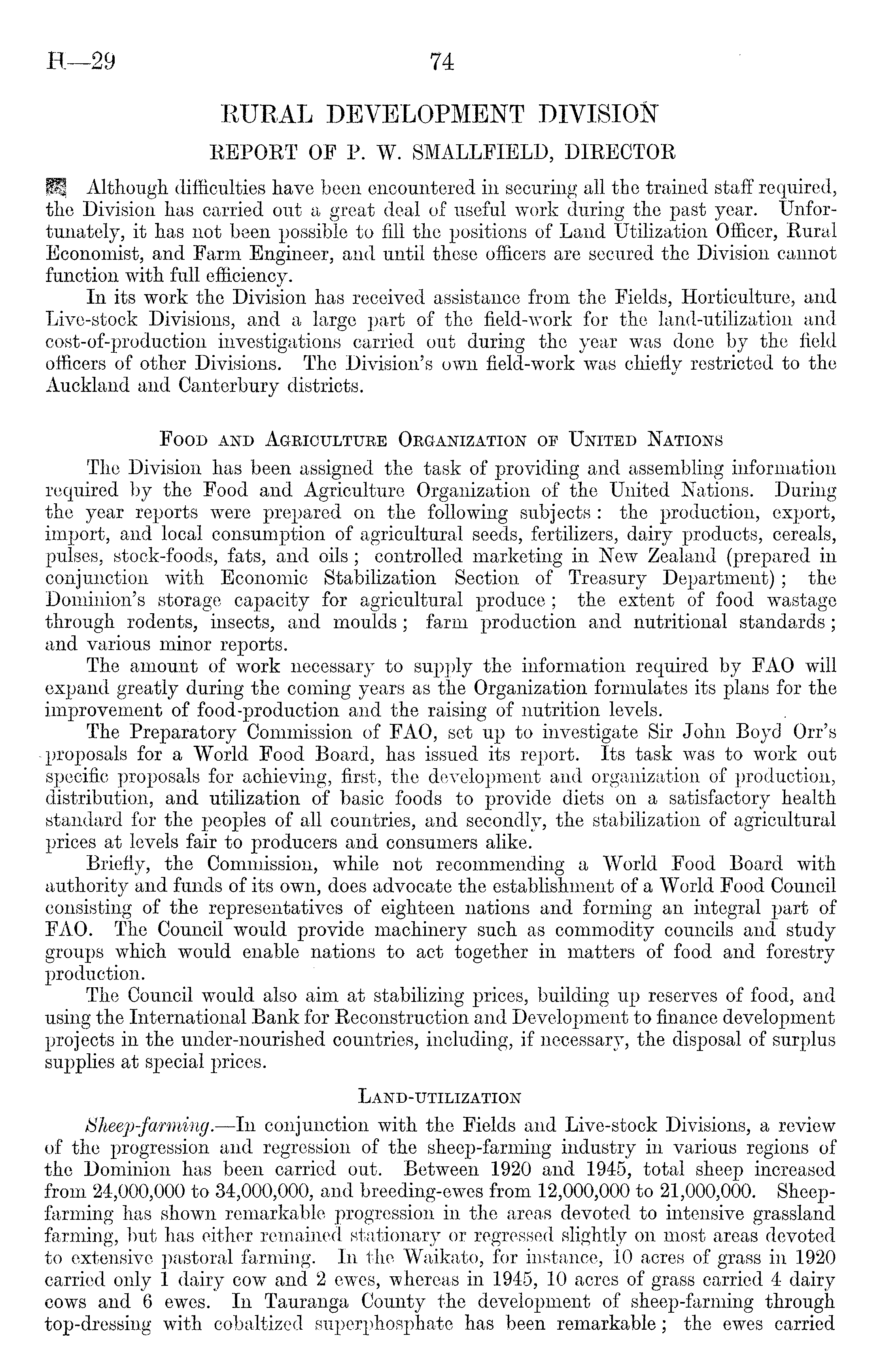 RURAL DEVELOPMENT DIVISION REPORT OF P. W. SMALLFIELD, DIRECTOR HI Although difficulties have been encountered in securing all the trained staff required, the Division has carried out a great deal of useful work during the past year. Unfortunately, it has not been possible to fill the positions of Land Utilization Officer, Rural Economist, and Farm Engineer, and until these officers are secured the Division cannot function with full efficiency. In its work the Division has received assistance from the Fields, Horticulture, and Live-stock Divisions, and a large part of the field-work for the land-utilization and cost-of-production investigations carried out during the year was done by the field officers of other Divisions. The Division's own field-work was chiefly restricted to the Auckland and Canterbury districts. Food and Agriculture Organization of United Nations The Division has been assigned the task of providing and assembling information required by the Food and Agriculture Organization of the United Nations. During the year reports were prepared on the following subjects : the production, export, import, and local consumption of agricultural seeds, fertilizers, dairy products, cereals, pulses, stock-foods, fats, and oils; controlled marketing in New Zealand (prepared in conjunction with Economic Stabilization Section of Treasury Department); the Dominion's storage capacity for agricultural produce ; the extent of food wastage through rodents, insects, and moulds ; farm production and nutritional standards ; and various minor reports. The amount of work necessary to supply the information required by FAO will expand greatly during the coming years as the Organization formulates its plans for the improvement of food-production and the raising of nutrition levels. The Preparatory Commission of FAO, set up to investigate Sir John Boyd Orr's proposals for a World Food Board, has issued its report. Its task was to work out specific proposals for achieving, first, the development and organization of production, distribution, and utilization of basic foods to provide diets on a satisfactory health standard for the peoples of all countries, and secondly, the stabilization of agricultural prices at levels fair to producers and consumers alike. Briefly, the Commission, while not recommending a World Food Board with authority and funds of its own, does advocate the establishment of a World Food Council consisting of the representatives of eighteen nations and forming an integral part of FAO. The Council would provide machinery such as commodity councils and study groups which would enable nations to act together in matters of food and forestry production. The Council would also aim at stabilizing prices, building up reserves of food, and using the International Bank for Reconstruction and Development to finance development projects in the under-nourished countries, including, if necessary, the disposal of surplus supplies at special prices. Land-utilization Sheep-farming.—ln conjunction with the Fields and Live-stock Divisions, a review of the progression and regression of the sheep-farming industry in various regions of the Dominion has been carried out. Between 1920 and 1945, total sheep increased from 24,000,000 to 34,000,000, and breeding-ewes from 12,000,000 to 21,000,000. Sheepfarming has shown remarkable progression in the areas devoted to intensive grassland farming, but has either remained stationary or regressed slightly on most areas devoted to extensive pastoral farming. In the Waikato, for instance, 10 acres of grass in 1920 carried only 1 dairy cow and 2 ewes, whereas in 1945, 10 acres of grass carried 4 dairy cows and 6 ewes. In Tauranga County the development of sheep-farming through top-dressing with cobaltized superphosphate has been remarkable; the ewes carried