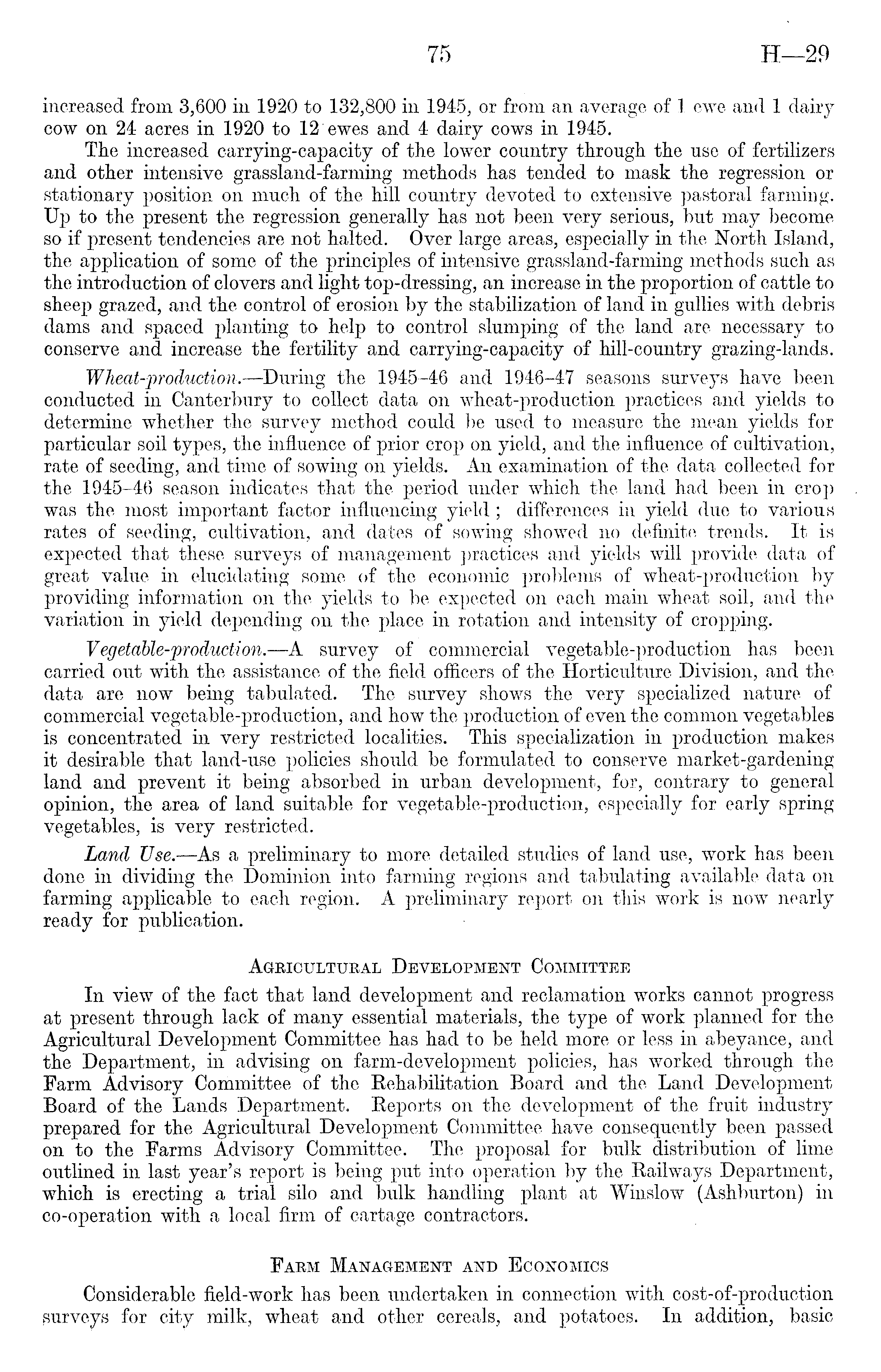 increased from 3,600 in 1920 to 132,800 in 1945, or from an average of 1 ewe and 1 dairycow on 24 acres in 1920 to 12 ewes and 4 dairy cows in 1945. The increased carrying-capacity of the lower country through the use of fertilizers and other intensive grassland-farming methods has tended to mask the regression or stationary position on much of the hill country devoted to extensive pastoral farming. Up to the present the regression generally has not been very serious, but may become so if present tendencies are not halted. Over large areas, especially in the North Island, the application of some of the principles of intensive grassland-farming methods such as the introduction of clovers and light top-dressing, an increase in the proportion of cattle to sheep grazed, and the control of erosion by the stabilization of land in gullies with debris dams and spaced planting to help to control slumping of the land are necessary to conserve and increase the fertility and carrying-capacity of hill-country grazing-lands. Wheat-production. —During the 1945-46 and 1946-47 seasons surveys have been conducted in Canterbury to collect data on wheat-production practices and yields to determine whether the survey method could be used to measure the mean yields for particular soil types, the influence of prior crop on yield, and the influence of cultivation, rate of seeding, and time of sowing on yields. An examination of the data collected for the 1945-46 season indicates that the period under which the land had been in crop was the most important factor influencing yield ; differences in yield due to various rates of seeding, cultivation, and dates of sowing showed no definite trends. It is expected that these surveys of management practices and yields will provide data of great value in elucidating some of the economic problems of wheat-production by providing information on the yields to be expected oil each main wheat soil, and the variation in yield depending on the place in rotation and intensity of cropping. Vegetable-production. —A survey of commercial vegetable-production has been carried out with the assistance of the field officers of the Horticulture Division, and the data are now being tabulated. The survey shows the very specialized nature of commercial vegetable-production, and how the production of even the common vegetables is concentrated in very restricted localities. This specialization in production makes it desirable that land-use policies should be formulated to conserve market-gardening land and prevent it being absorbed in urban development, for, contrary to general opinion, the area of land suitable for vegetable-production, especially for early spring vegetables, is very restricted. Land TJse. —As a preliminary to more detailed studies of land use, work has been done in dividing the Dominion into farming regions and tabulating available data on farming applicable to each region. A preliminary report on this work is now nearly ready for publication. Agricultural Development Committee In view of the fact that land development and reclamation works cannot progress at present through lack of many essential materials, the type of work planned for the Agricultural Development Committee has had to be held more or less in abeyance, and the Department, in advising on farm-development policies, has worked through the Farm Advisory Committee of the Rehabilitation Board and the Land Development Board of the Lands Department. Reports on the development of the fruit industry prepared for the Agricultural Development Committee have consequently been passed on to the Farms Advisory Committee. The proposal for bulk distribution of lime outlined in last year's report is being put into operation by the Railways Department, which is erecting a trial silo and bulk handling plant at Winslow (Ashburton) in co-operation with a local firm of cartage contractors. Farm Management and Economics Considerable field-work has been undertaken in connection with cost-of-production surveys for city milk, wheat and other cereals, and potatoes. In addition, basic