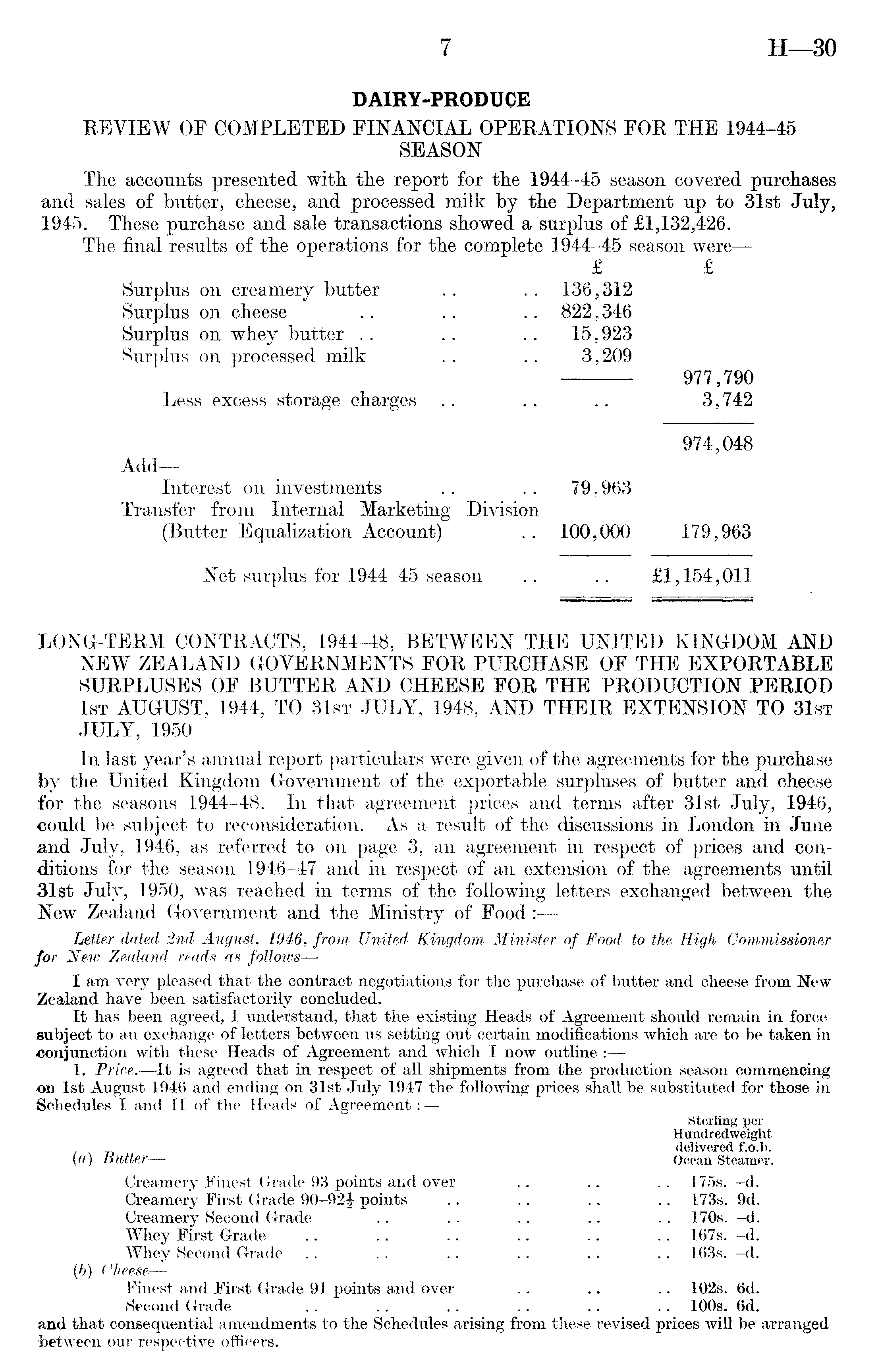 DAIRY-PRODUCE REVIEW OF COMPLETED FINANCIAL OPERATIONS FOR THE 1944-45 SEASON The accounts presented with the report for the 1944-45 season covered purchases and sales of butter, cheese, and processed milk by the Department up to 31st July, 1945. These purchase and sale transactions showed a surplus of £1,132,426. The final results of the operations for the complete 1944-45 season were — £ £ Surplus on creamery butter .. .. 136,312 Surplus on cheese .. .. .. 822,346 Surplus on whey butter .. .. .. 15,923 Surplus on processed milk .. .. 3,209 977,790 Less excess storage charges .. .. .. 3,742 974,048 Add— Interest on investments .. .. 79,963 Transfer from Internal Marketing Division (Butter Equalization Account) .. 100,000 179,963 Net surplus for 1944-45 season .. .. £1,154,011 LONG-TERM CONTRACTS, 1944-48, BETWEEN THE UNITED KINGDOM AND NEW ZEALAND GOVERNMENTS FOR PURCHASE OF THE EXPORTABLE SURPLUSES OF BUTTER AND CHEESE FOR THE PRODUCTION PERIOD IST AUGUST, 1944, TO 31ST JULY, 1948, AND THEIR EXTENSION TO 31ST JULY, 1950 In last year's annual report particulars were given of the agreements for the purchase by the United Kingdom Government of the exportable surpluses of butter and cheese for the seasons 1944-48. In that agreement prices and terms after 31st July, 1946, could be subject to reconsideration. As a result of the discussions in London in June and July, 1946, as referred to on page 3, an agreement in respect of prices and conditions for the season 1946-47 and in respect of an extension of the agreements until 31st July, 1950, was reached in terms of the following letters exchanged between the New Zealand Government and the Ministry of Food : Letter dated 2nd August, 1946, from United Kingdom, Minister of Food to the High Commissioner for New Zealand reads as follows — I am very pleased that the contract negotiations for the purchase of butter and cheese from New Zealand have been satisfactorily concluded. It has been agreed, I understand, that the existing Heads of Agreement should remain in force subject to an exchange of letters between us setting out certain modifications which are to be taken in conjunction with these Heads of Agreement and which I now outline : 1. Price. —It is agreed that in respect of all shipments from the production season commencing on Ist August 1946 and ending on 31st July 1947 the following prices shall be substituted for those in Schedules I and II of the Heads of Agreement:— Sterling per Hundredweight . v delivered f.o.b. (a) Butter — Ocean Steamer. Creamery Finest Grade 93 points and over .. .. .. 1755. -d. Creamery First Grade 90-92£ points .. .. .. .. 1735. 9d. Creamery Second Grade . . .. .. .. .. 170s. -d. Whey First Grade .. .. .. .. .. .. 1675. -d. Whey Second Grade .. .. .. .. .. .. 1635. -d. (b) Cheese— Finest and First Grade 91 points and over .. .. .. 102s. 6d. Second Grade .. . . .. .. .. .. 100s. 6d. and that consequential amendments to the Schedules arising from these revised prices will be arranged between our respective officers.