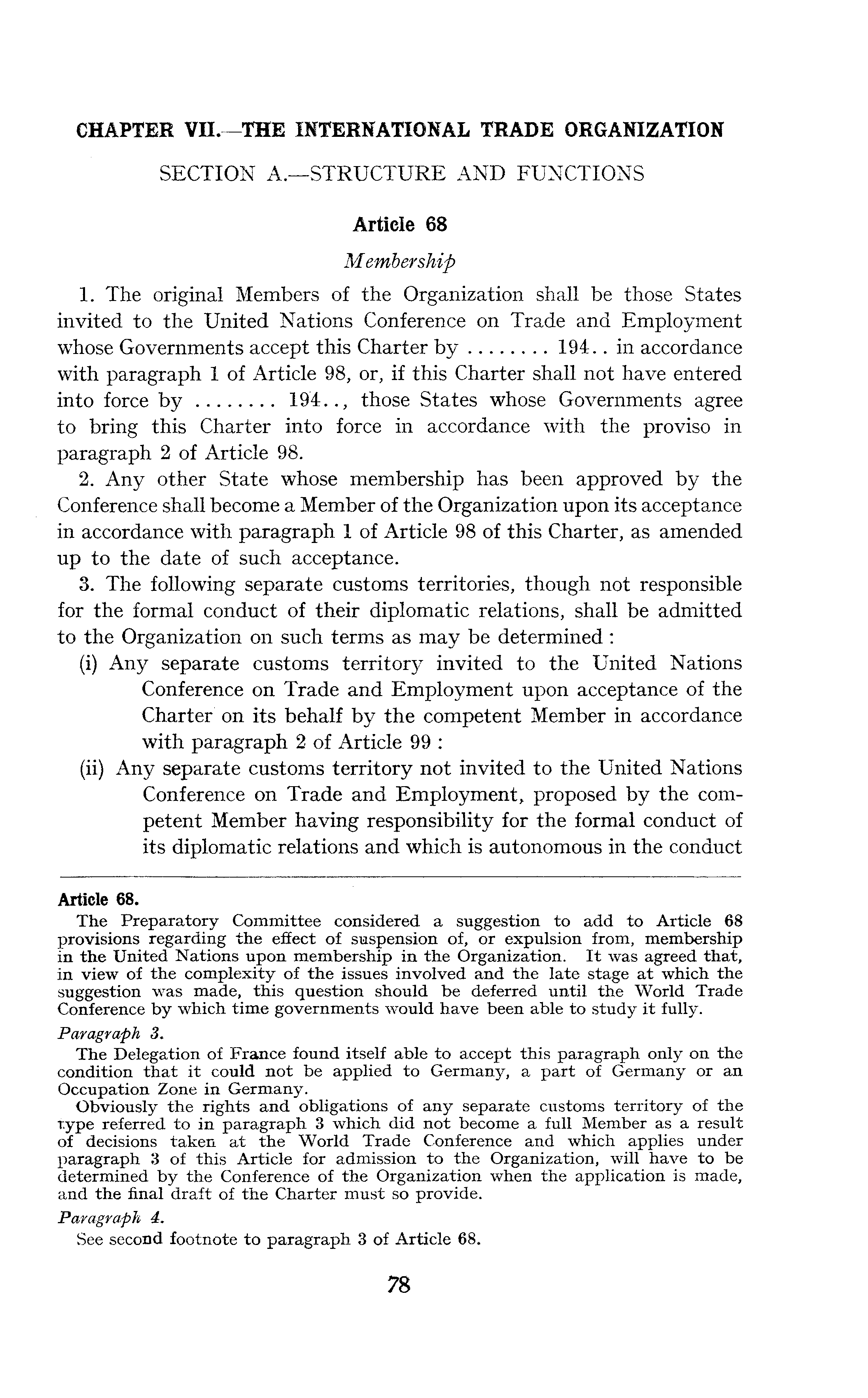 CHAPTER VII. THE INTERNATIONAL TRADE ORGANIZATION SECTION A.—STRUCTURE AND FUNCTIONS Article 68 Membership 1. The original Members of the Organization shall be those States invited to the United Nations Conference on Trade and Employment whose Governments accept this Charter by 194.. in accordance with paragraph 1 of Article 98, or, if this Charter shall not have entered into force by 194.., those States whose Governments agree to bring this Charter into force in accordance with the proviso in paragraph 2 of Article 98. 2. Any other State whose membership has been approved by the Conference shall become a Member of the Organization upon its acceptance in accordance with paragraph 1 of Article 98 of this Charter, as amended up to the date of such acceptance. 3. The following separate customs territories, though not responsible for the formal conduct of their diplomatic relations, shall be admitted to the Organization on such terms as may be determined: (i) Any separate customs territory invited to the United Nations Conference on Trade and Employment upon acceptance of the Charter on its behalf by the competent Member in accordance with paragraph 2 of Article 99 : (ii) Any separate customs territory not invited to the United Nations Conference on Trade and Employment, proposed by the competent Member having responsibility for the formal conduct of its diplomatic relations and which is autonomous in the conduct