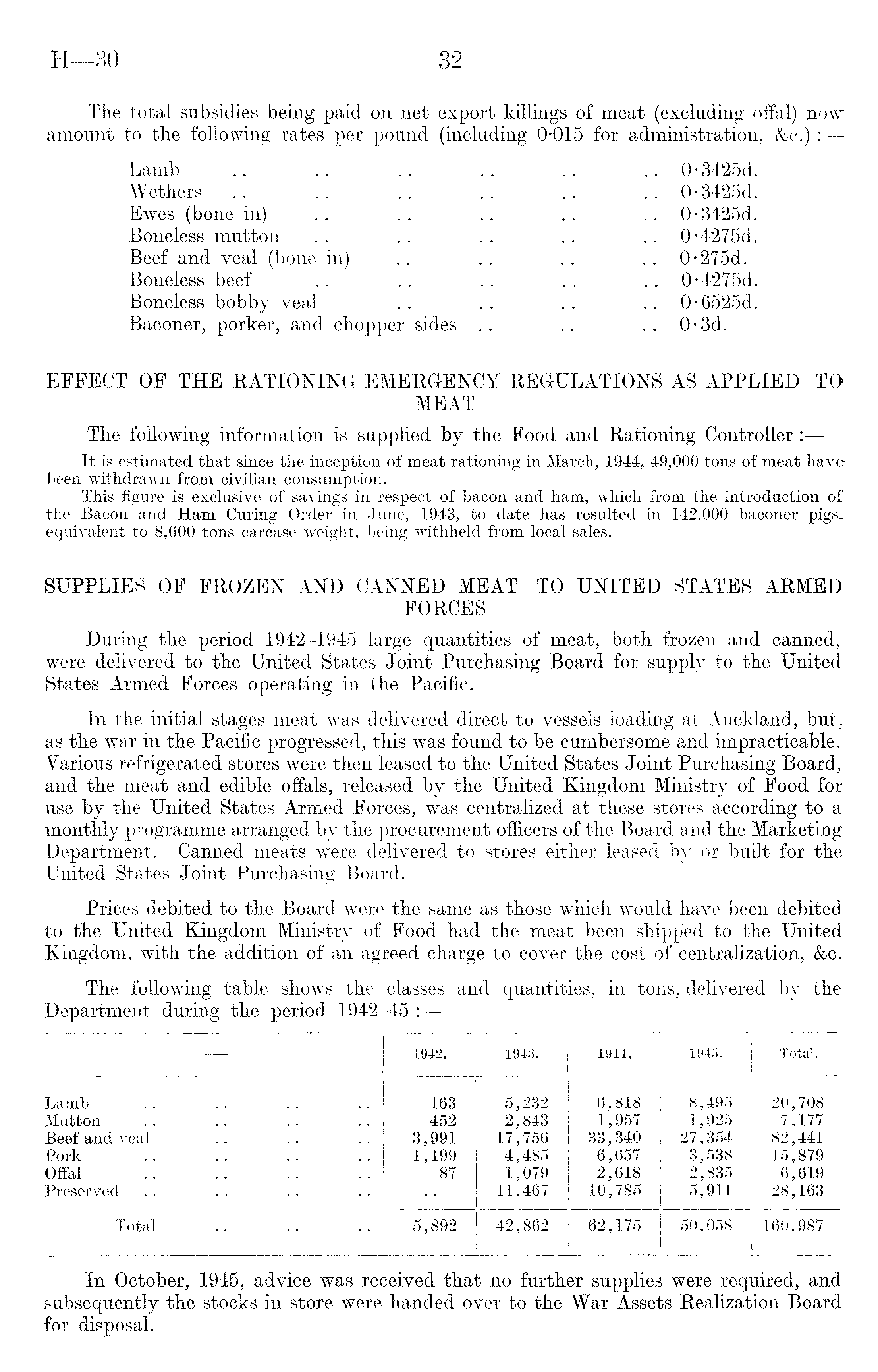 The total subsidies being paid on net export killings of meat (excluding offal) now amount to the following rates per pound (including 0-015 for administration, &c.) : —- Lamb .. .. .. .. .. .. 0-3425 d. Wethers .. .. .. .. .. .. 0-3425 d. Ewes (bone in) .. .. .. .. .. 0-3425 d. Boneless mutton .. . . .. .. .. 0-4275 d. Beef and veal (bone in) .. .. .. .. 0-275 d. Boneless beef .. .. .. .. .. 0-4275 d. Boneless bobby veal .. .. .. .. 0 • 6525 d. Baconer, porker, and chopper sides .. .. .. 0 • 3d. EFFECT OF THE RATIONING EMERGENCY REGULATIONS AS APPLIED TO MEAT The following information is supplied by the Food and Rationing Controller : It is estimated that since the inception of meat rationing in March, 1944, 49,000 tons of meat have been withdrawn from civilian consumption. This figure is exclusive of savings in respect of bacon and ham, which from the introduction of the Bacon and Ham Curing Order in June, 1943, to date has resulted in 142,000 baconer pigs, equivalent to 8,600 tons carcase weight, being withheld from local sales. SUPPLIES OF FROZEN AND CANNED MEAT TO UNITED STATES ARMED FORCES During the period 1942-1945 large quantities of meat, both frozen and canned, were delivered to the United States Joint Purchasing Board for supply to the United States .Armed Forces operating in the Pacific. In the initial stages meat was delivered direct to vessels loading at Auckland, but, as the war in the Pacific progressed, this was found to be cumbersome and impracticable. Various refrigerated stores were then leased to the United States Joint Purchasing Board, and the meat and edible offals, released by the United Kingdom Ministry of Food for use by the United States Armed Forces, was centralized at these stores according to a monthly programme arranged by the procurement officers of the Board and the Marketing Department. Canned meats were delivered to stores either leased by or built for the United States Joint Purchasing Board. Prices debited to the Board were the same as those which would have been debited to the United Kingdom Ministry of Food had the meat been shipped to the United Kingdom, with the addition of an agreed charge to cover the cost of centralization, &c. The following table shows the classes and quantities, in tons, delivered by the Department during the period 1942-45 :—-