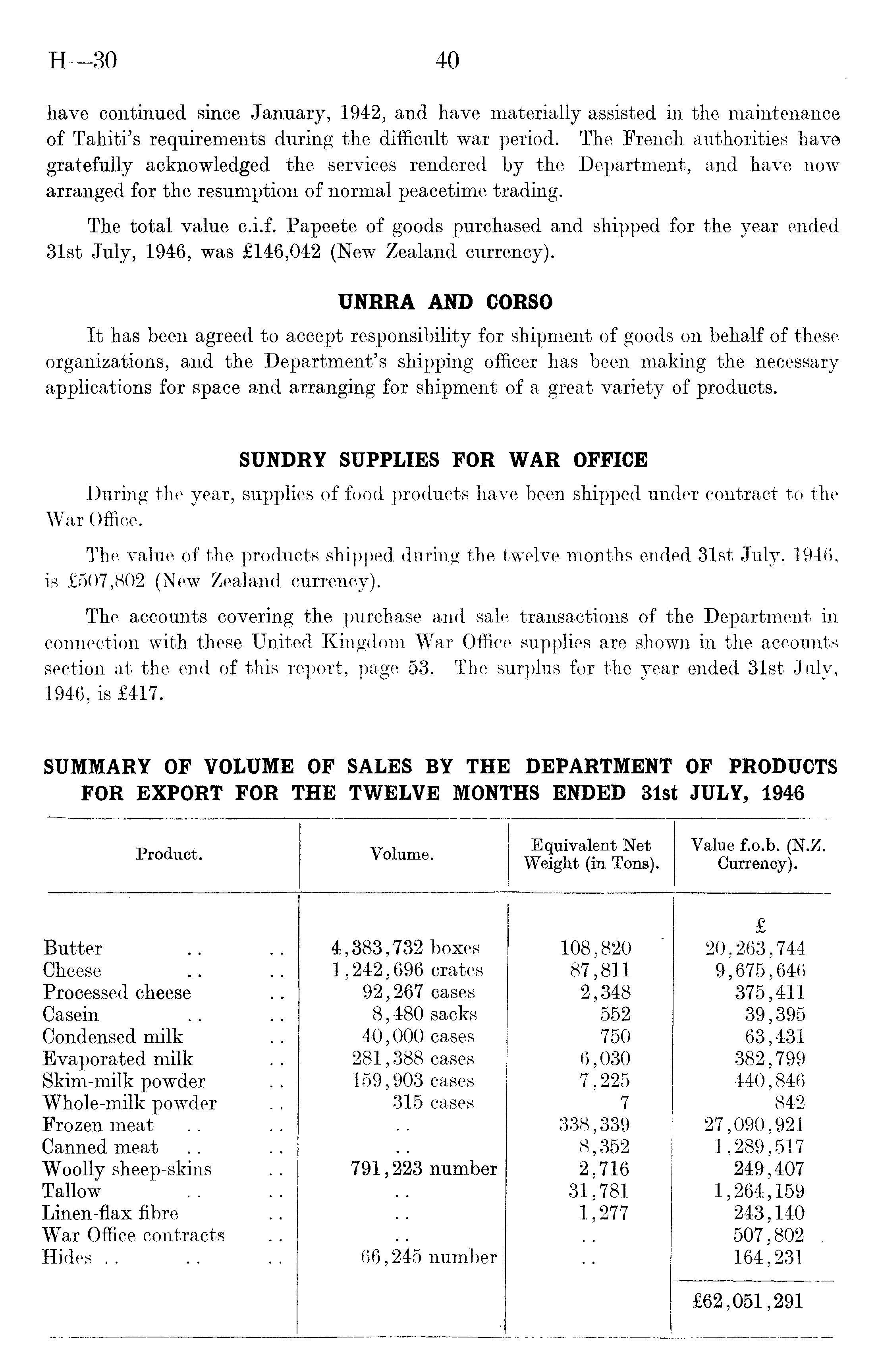 have continued since January, 1942, and have materially assisted in the maintenance of Tahiti's requirements during the difficult war period. The French authorities have gratefully acknowledged the services rendered l?y the Department, and have now arranged for the resumption of normal peacetime trading. The total value c.i.f. Papeete of goods purchased and shipped for the year ended 31st July, 1946, was £146,042 (New Zealand currency). UNRRA AND CORSO It has been agreed to accept responsibility for shipment of goods on behalf of these organizations, and the Department's shipping officer has been making the necessary applications for space and arranging for shipment of a great variety of products. SUNDRY SUPPLIES FOR WAR OFFICE During the year, supplies of food products have been shipped under contract to the War Office. The value of the products shipped during the twelve months ended 31st July, 1946, is £507,802 (New Zealand currency). The accounts covering the purchase and sale transactions of the Department in connection with these United Kingdom War Office supplies are shown in the accounts section at the end of this report, page 53. The surplus for the year ended 31st July, 1946, is £417.