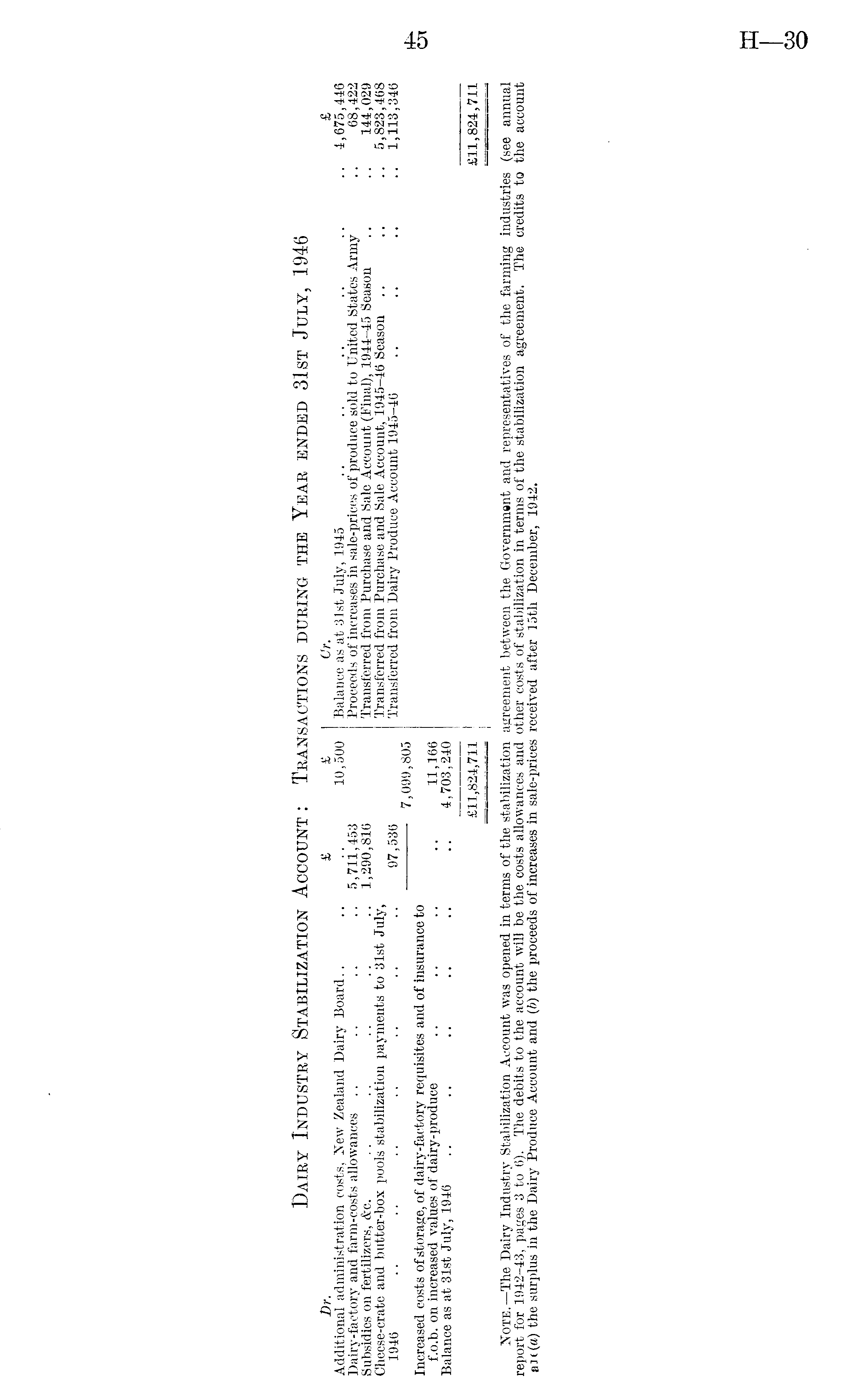 Dairy Industry Stabilization Account : Transactions during the Year ended 31st July, 1946 Dr. £ £ Or. £ Additional administration costs, New Zealand Dairy Board.. .. .. 10,500 Balance as at 31st July, 1945 .. .. .. .. .. .. 4,675,446 Dairy-factory and farm-costs allowances .. .. .. .. 5,711,453 Proceeds of increases in sale-prices of produce sold to United States Army .. 68,422 Subsidies on fertilizers, <fec. .. .. .. .. .. 1,290,816 Transferred from Purchase and Sale Account (Final), 1944-45 Season .. .. 144,029 Cheese-crate and butter-box pools stabilization payments to 31st July, Transferred from Purchase and Sale Account, 1945-46 Season .. .. .. 5,823,468 1946 .. .. .. .. .. .. .. 97,536 Transferred from Dairy Produce Account 1945-46 .. .. .. .. 1,113,346 7,099,805 Increased costs of storage, of dairy-factory requisites and of insurance to f.o.b. on increased values of dairy-produce .. .. .. .. 11,166 Balance as at 31st July, 1946 .. .. .. .. .. .. 4,703,240 £11,824,711 £11,824,711 Note.—The Dairy Industry Stabilization Account was opened in terms of the stabilization agreement between the Government and representatives of the farming industries (see annual report for 1942-43, pages 3 to 6). The debits to the account will be the costs allowances and other costs of stabilization in terms of the stabilization agreement. The credits to the account a it (a) the surplus in the Dairy Produce Account and (6) the proceeds of increases in sale-prices received after 15th December, 1942.