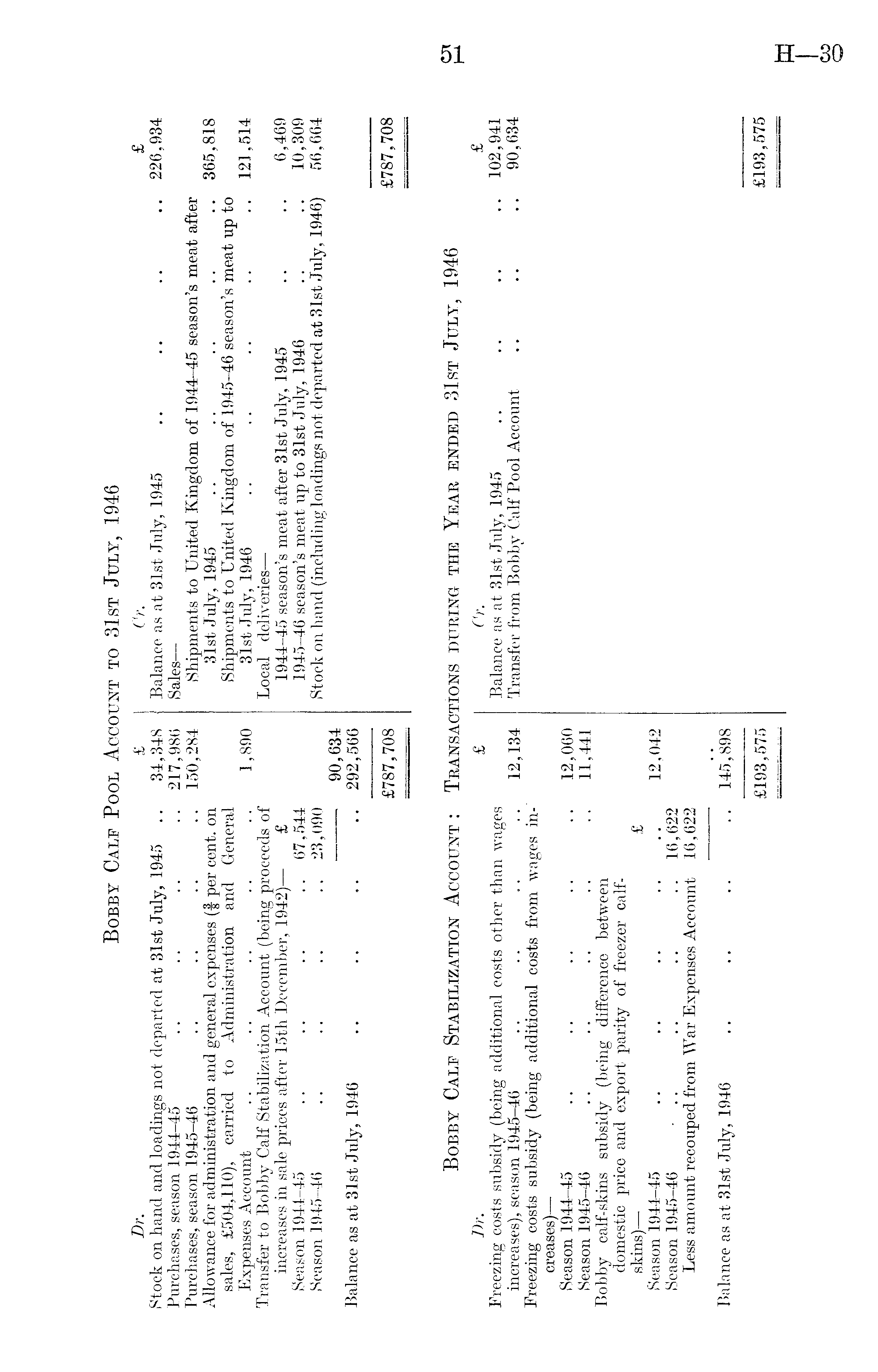 Bobby Calf Pool Account to 31st July, 1946 Dr. £ Cr. £ Stock on hand and loadings not departed at 31st July, 1945 .. 34,348 Balance as at 31st July, 1945 .. .. .. .. 226,934 Purchases, season 1944-45 .. .. .. .. 217,986 SalesPurchases, season 1945-46 .. .. .. .. 150,284 Shipments to United Kingdom of 1944-45 season's meat after Allowance for administration and general expenses (f per cent, on 31st July, 1945 .. .. .. .. .. 365,818 sales, £504,110), carried to Administration and General Shipments to United Kingdom of 1945-46 season's meat up to Expenses Account .. .. .. .. .. 1,890 31st July, 1946 .. .. .. .. .. 121,514 Transfer to Bobby Calf Stabilization Account (being proceeds of Local deliveries— increases in sale prices after 15th December, 1942)— £ 1944-45 season's meat after 31st July, 1945 .. .. 6,469 Season 1944-45 .. .. .. .. 67,544 1945-46 season's meat up to 31st July, 1946 .. .. 10,309 Season 1945-46 .. .. .. .. 23,090 Stock on hand (including loadings not departed at 31st July, 1946) 56,664 90,634 Balance as at 31st July, 1946 .. .. .. .. 292,566 £787,708 £787,708 Bobby Calf Stabilization Account : Transactions during the Year ended 31st July, 1946 Dr. £ Cr. £ Freezing costs subsidy (being additional costs other than wages Balance as at 31st July, 1945 .. .. .. .. 102,941 increases), season 1945-46 .. .. .. .. 12,134 Transfer from Bobby Calf Pool Account .. .. .. 90,634 Freezing costs subsidy (being additional costs from wages increases)— Season 1944-45 .. .. .. .. .. 12,060 Season 1945-46 .. .. .. .. .. 11,441 Bobby calf-skins subsidy (being difference between domestic price and export parity of freezer calfskins)— £ Season 1944-45 .. .. .. .. .. 12,042 Season 1945-46 ■ .. .. .. 16,622 Less amount recouped from War Expenses Account 16,622 Balance as at 31st July, 1946 .. .. .. .. 145,898 £193,575 £193,575