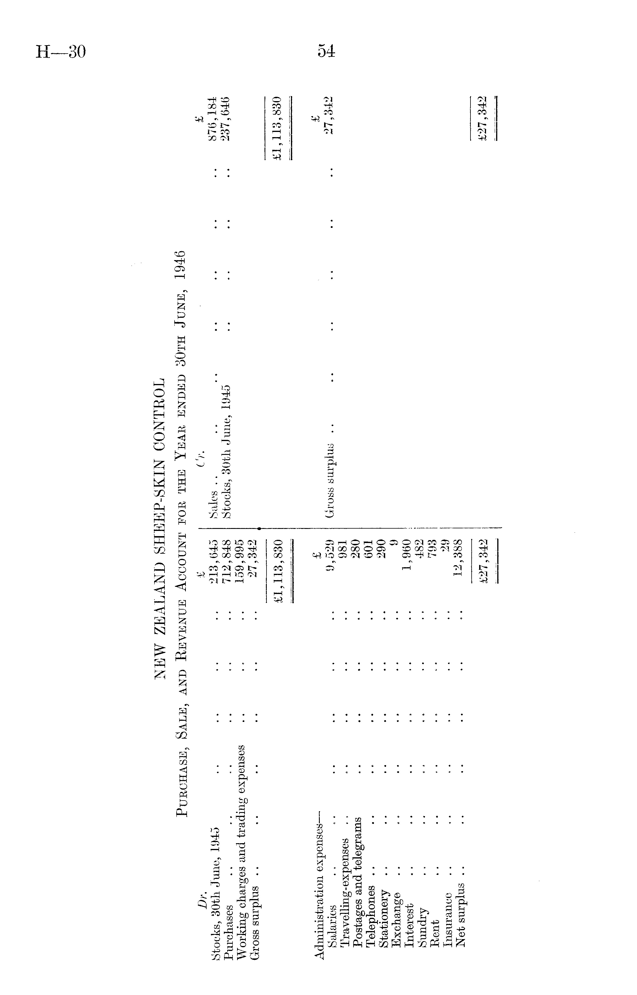 NEW ZEALAND SHEEP-SKIN CONTROL Purchase, Sale, and Revenue Account for the Year ended 30th June, 1946 Dr. £ Or. £ Stocks, 30th June, 1945 .. .. .. •• 213,645 Sales .. .. .. .. .. .. .. 876,184 Purchases .. .. .. .. •• •• 712,848 Stocks, 30th 7 June, 1945 .. .. .. .. 237,646 Working charges and trading expenses .. .. .. 159,995 Gross surplus .. .. .. .. •• •• 27,342 £1,113,830 £1,113,830 Administration expenses— £ » £ Salaries .. .. .. .. •• 9,529 Gross surplus .. .. .. .. .. .. 27,342 Travelling-expenses .. .. .. • • • • 981 Postages and telegrams .. .. . • • • 280 Telephones .. .. . • • • • • • • 601 Stationery .. .. .. • • • • • • 290 Exchange .. .. • • •• • • • • 9 Interest .. .. •• •• •• •• 1,960 Sundry .. .. • • • • • ■ • • 482 Rent •• •• 793 Insurance .. .. x • • • • • • • 29 Net surplus .. .. • • •• •• •• 12,388 £27,342 £27,342
