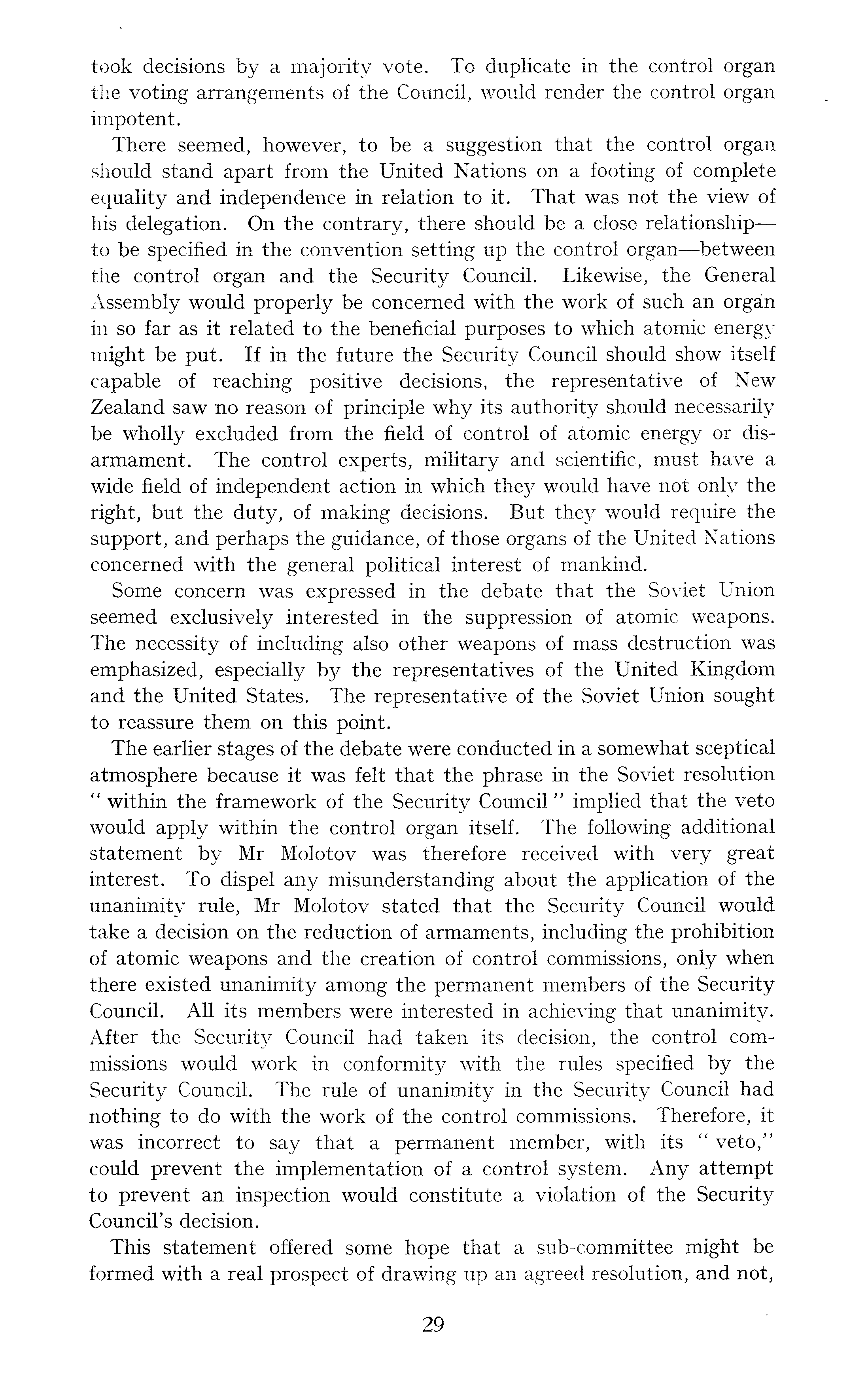 took decisions by a majority vote. To duplicate in the control organ the voting arrangements of the Council, would render the control organ impotent. There seemed, however, to be a suggestion that the control organ should stand apart from the United Nations on a footing of complete equality and independence in relation to it. That was not the view of his delegation. On the contrary, there should be a close relationship—to be specified in the convention setting up the control organ —between the control organ and the Security Council. Likewise, the General Assembly would properly be concerned with the work of such an organ in so far as it related to the beneficial purposes to which atomic energy might be put. If in the future the Security Council should show itself capable of reaching positive decisions, the representative of New Zealand saw no reason of principle why its authority should necessarily be wholly excluded from the field of control of atomic energy or disarmament. The control experts, military and scientific, must have a wide field of independent action in which they would have not only the right, but the duty, of making decisions. But they would require the support, and perhaps the guidance, of those organs of the United Nations concerned with the general political interest of mankind. Some concern was expressed in the debate that the Soviet Union seemed exclusively interested in the suppression of atomic weapons. The necessity of including also other weapons of mass destruction was emphasized, especially by the representatives of the United Kingdom and the United States. The representative of the Soviet Union sought to reassure them on this point. The earlier stages of the debate were conducted in a somewhat sceptical atmosphere because it was felt that the phrase in the Soviet resolution " within the framework of the Security Council" implied that the veto would apply within the control organ itself. The following additional statement by Mr Molotov was therefore received with very great interest. To dispel any misunderstanding about the application of the unanimity rule, Mr Molotov stated that the Security Council would take a decision on the reduction of armaments, including the prohibition of atomic weapons and the creation of control commissions, only when there existed unanimity among the permanent members of the Security Council. All its members were interested in achieving that unanimity. After the Security Council had taken its decision, the control commissions would work in conformity with the rules specified by the Security Council. The rule of unanimity in the Security Council had nothing to do with the work of the control commissions. Therefore, it was incorrect to say that a permanent member, with its " veto," could prevent the implementation of a control system. Any attempt to prevent an inspection would constitute a violation of the Security Council's decision. This statement offered some hope that a sub-committee might be formed with a real prospect of drawing up an agreed resolution, and not,