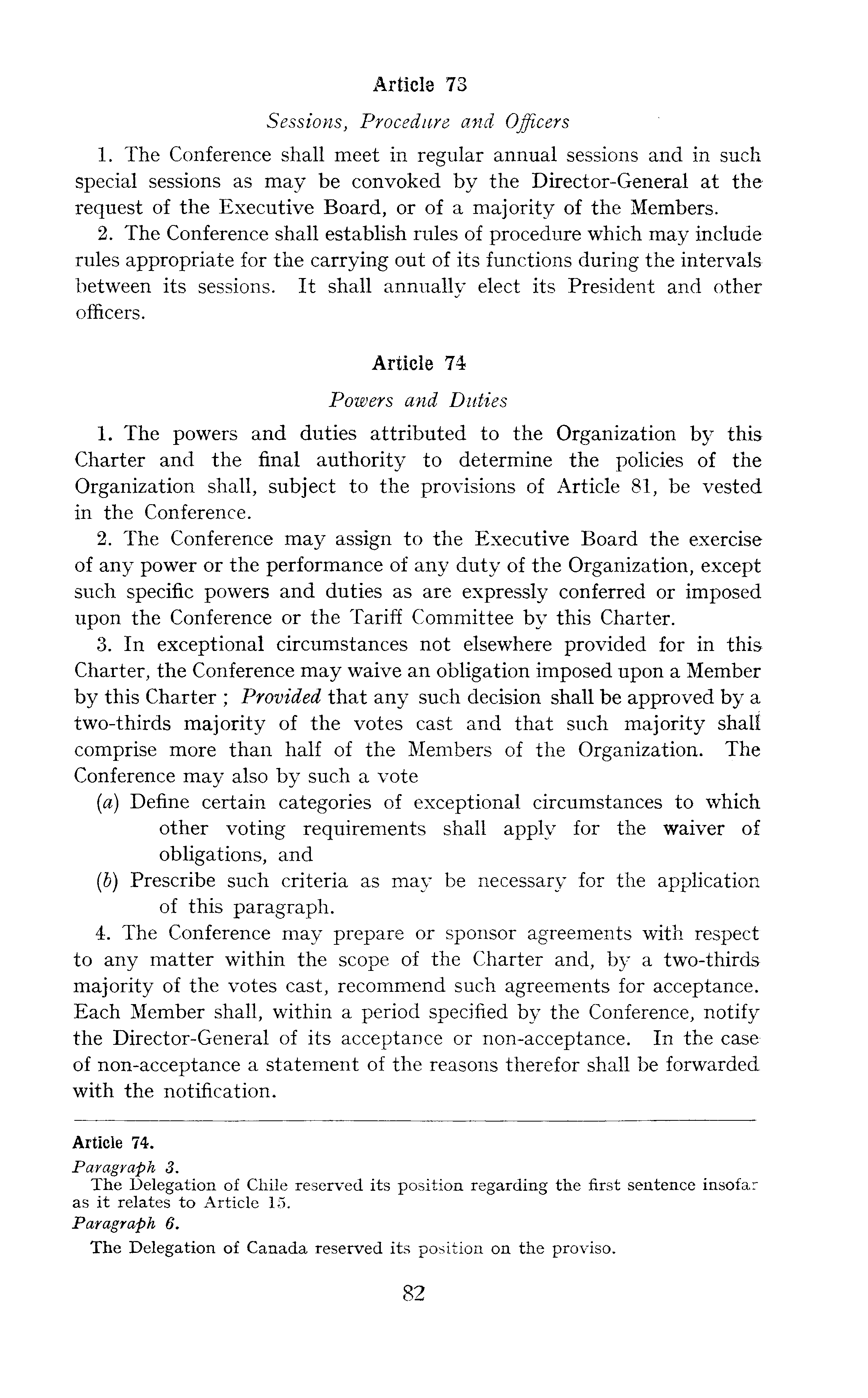 Article 73 Sessions, Procedure and Officers 1. The Conference shall meet in regular annual sessions and in such special sessions as may be convoked by the Director-General at the request of the Executive Board, or of a majority of the Members. 2. The Conference shall establish rules of procedure which may include rules appropriate for the carrying out of its functions during the intervals between its sessions. It shall annually elect its President and other officers. Article 74 Powers and Duties 1. The powers and duties attributed to the Organization by this Charter and the final authority to determine the policies of the Organization shall, subject to the provisions of Article 81, be vested in the Conference. 2. The Conference may assign to the Executive Board the exercise of any power or the performance of any duty of the Organization, except such specific powers and duties as are expressly conferred or imposed upon the Conference or the Tariff Committee by this Charter. 3. In exceptional circumstances not elsewhere provided for in this Charter, the Conference may waive an obligation imposed upon a Member by this Charter ; Provided that any such decision shall be approved by a two-thirds majority of the votes cast and that such majority shall comprise more than half of the Members of the Organization. The Conference may also by such a vote {a) Define certain categories of exceptional circumstances to which other voting requirements shall apply for the waiver of obligations, and (b) Prescribe such criteria as may be necessary for the application of this paragraph. 4. The Conference may prepare or sponsor agreements with respect to any matter within the scope of the Charter and, by a two-thirds majority of the votes cast, recommend such agreements for acceptance. Each Member shall, within a period specified by the Conference, notify the Director-General of its acceptance or non-acceptance. In the case of non-acceptance a statement of the reasons therefor shall be forwarded with the notification.