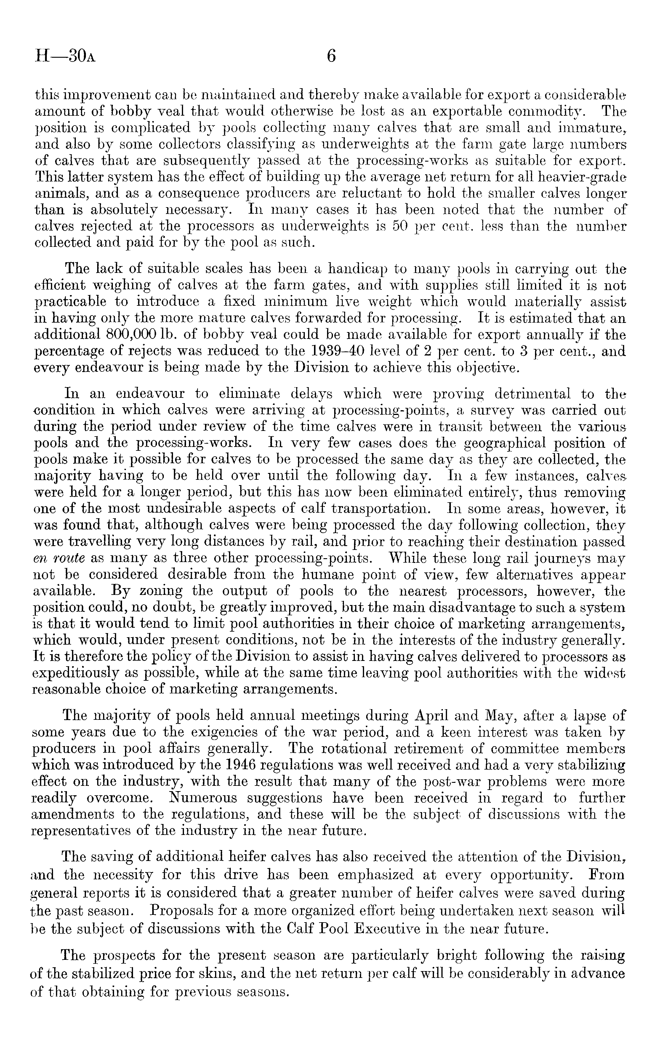 this improvement can be maintained and thereby make available for export a considerable amount of bobby veal that would otherwise be lost as an exportable commodity. The position is complicated by pools collecting many calves that are small and immature, and also by some collectors classifying as underweights at the farm gate large numbers of calves that are subsequently passed at the processing-works as suitable for export. This latter system has the effect of building up the average net return for all heavier-grade animals, and as a consequence producers are reluctant to hold the smaller calves longer than is absolutely necessary. In many cases it has been noted that the number of calves rejected at the processors as underweights is 50 per cent, less than the number collected and paid for by the pool as such. The lack of suitable scales has been a handicap to many pools in carrying out the efficient weighing of calves at the farm gates, and with supplies still limited it is not practicable to introduce a fixed minimum live weight which would materially assist in having only the more mature calves forwarded for processing. It is estimated that an additional 800,000 lb. of bobby veal could be made available for export annually if the percentage of rejects was reduced to the 1939-40 level of 2 per cent, to 3 per cent., and every endeavour is being made by the Division to achieve this objective. In an endeavour to eliminate delays which were proving detrimental to the condition in which calves were arriving at processing-points, a survey was carried out during the period under review of the time calves were in transit between the various pools and the processing-works. In very few cases does the geographical position of pools make it possible for calves to be processed the same day as they are collected, the majority having to be held over until the following day. In a few instances, calves were held for a longer period, but this has now been eliminated entirely, thus removing one of the most undesirable aspects of calf transportation. In some areas, however, it was found that, although calves were being processed the day following collection, they were travelling very long distances by rail, and prior to reaching their destination passed en route as many as three other processing-points. While these long rail journeys may not be considered desirable from the humane point of view, few alternatives appear available. By zoning the output of pools to the nearest processors, however, the position could, no doubt, be greatly improved, but the main disadvantage to such a system is that it would tend to limit pool authorities in their choice of marketing arrangements, which would, under present conditions, not be in the interests of the industry generally. It is therefore the policy of the Division to assist in having calves delivered to processors as expeditiously as possible, while at the same time leaving pool authorities with the widest reasonable choice of marketing arrangements. The majority of pools held annual meetings during April and May, after a lapse of some years due to the exigencies of the war period, and a keen interest was taken by producers in pool affairs generally. The rotational retirement of committee members which was introduced by the 1946 regulations was well received and had a very stabilizing effect on the industry, with the result that many of the post-war problems were more readily overcome. Numerous suggestions have been received in regard to further amendments to the regulations, and these will be the subject of discussions with the representatives of the industry in the near future. The saving of additional heifer calves has also received the attention of the Division, and the necessity for this drive has been emphasized at every opportunity. From general reports it is considered that a greater number of heifer calves were saved during the past season. Proposals for a more organized effort being undertaken next season will be the subject of discussions with the Calf Pool Executive in the near future. The prospects for the present season are particularly bright following the raising of the stabilized price for skins, and the net return per calf will be considerably in advance of that obtaining for previous seasons.