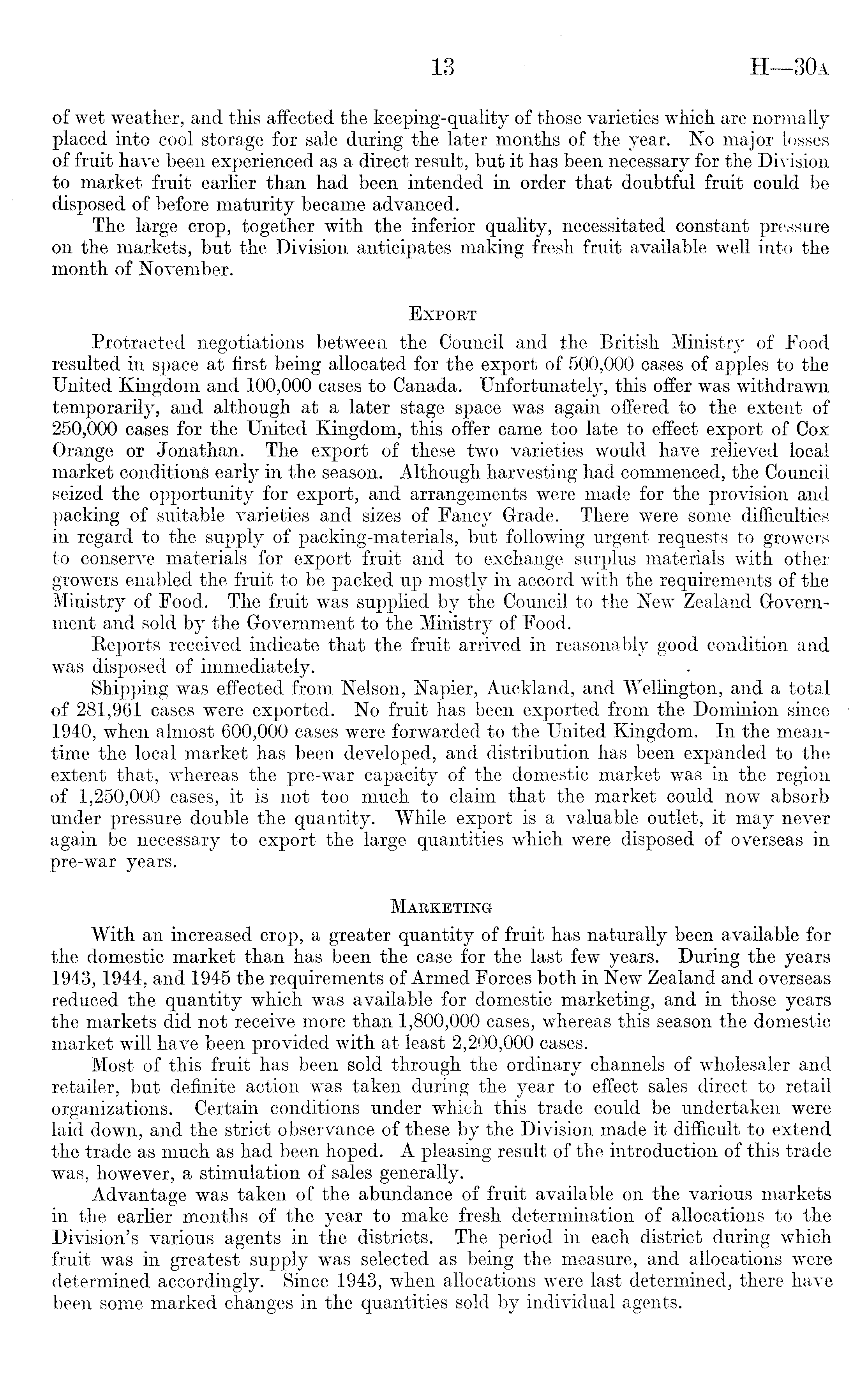 of wet weather, and this affected the keeping-quality of those varieties which are normallyplaced into cool storage for sale during the later months of the year. No major losses of fruit have been experienced as a direct result, but it has been necessary for the Division to market fruit earlier than had been intended in order that doubtful fruit could be disposed of before maturity became advanced. The large crop, together with the inferior quality, necessitated constant pressure on the markets, but the Division anticipates making fresh fruit available well into the month of November. Export Protracted negotiations between the Council and Jbhe British Ministry of Food resulted in space at first being allocated for the export of 500,000 cases of apples to the United Kingdom and 100,000 cases to Canada. Unfortunately, this offer was withdrawn temporarily, and although at a later stage space was again offered to the extent of 250,000 cases for the United Kingdom, this offer came too late to effect export of Cox Orange or Jonathan. The export of these two varieties would have relieved local market conditions early in the season. Although harvesting had commenced, the Council seized the opportunity for export, and arrangements were made for the provision and packing of suitable varieties and sizes of Fancy Grade. There were some difficulties in regard to the supply of packing-materials, but following urgent requests to growers to conserve materials for export fruit and to exchange surplus materials with other growers enabled the fruit to be packed up mostly in accord with the requirements of the Ministry of Food. The fruit was supplied by the Council to the New Zealand Government and sold by the Government to the Ministry of Food. Reports received indicate that the fruit arrived in reasonably good condition and was disposed of immediately. Shipping was effected from Nelson, Napier, Auckland, and Wellington, and a total of 281,961 cases were exported. No fruit has been exported from the Dominion since 1940, when almost 600,000 cases were forwarded to the United Kingdom. In the meantime the local market has been developed, and distribution has been expanded to the extent that, whereas the pre-war capacity of the domestic market was in the region of 1,250,000 cases, it is not too much to claim that the market could now absorb under pressure double the quantity. While export is a valuable outlet, it may never again be necessary to export the large quantities which were disposed of overseas in pre-war years. Marketing With an increased crop, a greater quantity of fruit has naturally been available for the domestic market than has been the case for the last few years. During the years 1943,1944, and 1945 the requirements of Armed Forces both in New Zealand and overseas reduced the quantity which was available for domestic marketing, and in those years the markets did not receive more than 1,800,000 cases, whereas this season the domestic market will have been provided with at least 2,200,000 cases. Most of this fruit has been sold through the ordinary channels of wholesaler and retailer, but definite action was taken during the year to effect sales direct to retail organizations. Certain conditions under which this trade could be undertaken were laid down, and the strict observance of these by the Division made it difficult to extend the trade as much as had been hoped. A pleasing result of the introduction of this trade was, however, a stimulation of sales generally. Advantage was taken of the abundance of fruit available on the various markets in the earlier months of the year to make fresh determination of allocations to the Division's various agents in the districts. The period in each district during which fruit was in greatest supply was selected as being the measure, and allocations were determined accordingly. Since 1943, when allocations were last determined, there have been some marked changes in the quantities sold by individual agents.