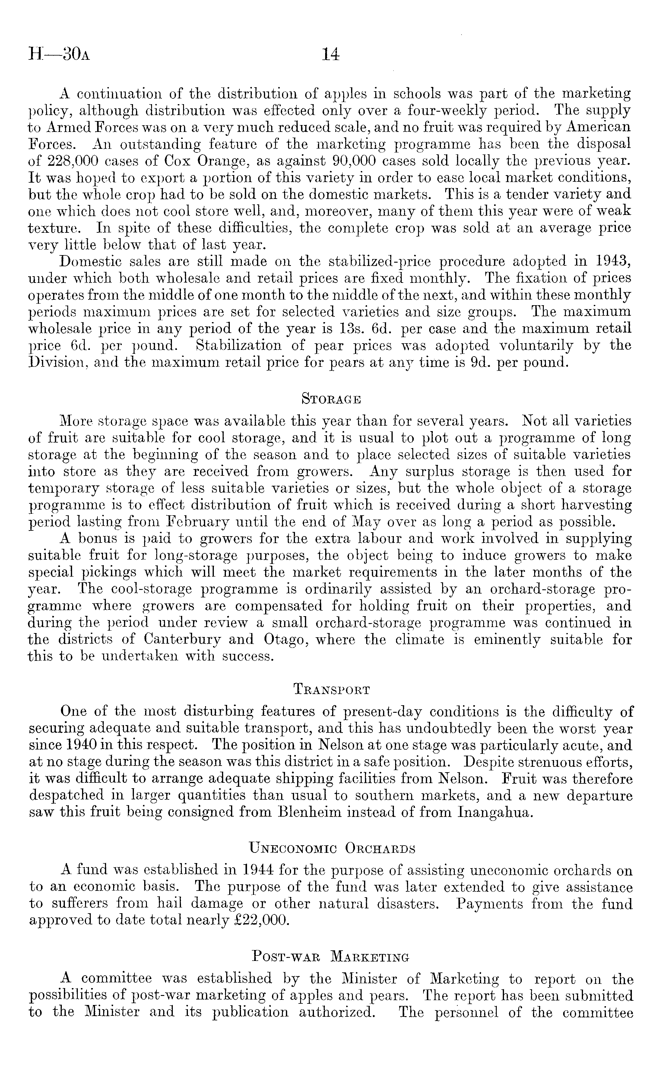 A continuation of the distribution of apples in schools was part of the marketing policy, although distribution was effected only over a four-weekly period. The supply to Armed Forces was on a very much reduced scale, and no fruit was required by American Forces. An outstanding feature of the marketing programme has been the disposal of 228,000 cases of Cox Orange, as against 90,000 cases sold locally the previous year. It was hoped to export a portion of this variety in order to ease local market conditions, but the whole crop had to be sold on the domestic markets. This is a tender variety and one which does not cool store well, and, moreover, many of them this year were of weak texture. In spite of these difficulties, the complete crop was sold at an average price very little below that of last year. Domestic sales are still made on the stabilized-price procedure adopted in 1943, under which both wholesale and retail prices are fixed monthly. The fixation of prices operates from the middle of one month to the middle of the next, and within these monthly periods maximum prices are set for selected varieties and size groups. The maximum wholesale price in any period of the year is 13s. 6d. per case and the maximum retail price 6d. per pound. Stabilization of pear prices was adopted voluntarily by the Division, and the maximum retail price for pears at any time is 9d. per pound. Storage More storage space was available this year than for several years. Not all varieties of fruit are suitable for cool storage, and it is usual to plot out a programme of long storage at the beginning of the season and to place selected sizes of suitable varieties into store as they are received from growers. Any surplus storage is then used for temporary storage of less suitable varieties or sizes, but the whole object of a storage programme is to effect distribution of fruit which is received during a short harvesting period lasting from February until the end of May over as long a period as possible. A bonus is paid to growers for the extra labour and work involved in supplying suitable fruit for long-storage purposes, the object being to induce growers to make special pickings which will meet the market requirements in the later months of the year. The cool-"storage programme is ordinarily assisted by an orchard-storage programme where growers are compensated for holding fruit on their properties, and during the period under review a small orchard-storage programme was continued in the districts of Canterbury and Otago, where the climate is eminently suitable for this to be undertaken with success. Transport One of the most disturbing features of present-day conditions is the difficulty of securing adequate and suitable transport, and this has undoubtedly been the worst year since 1940 in this respect. The position in Nelson at one stage was particularly acute, and at no stage during the season was this district in a safe position. Despite strenuous efforts, it was difficult to arrange adequate shipping facilities from Nelson. Fruit was therefore despatched in larger quantities than usual to southern markets, and a new departure saw this fruit being consigned from Blenheim instead of from Inangahua. Uneconomic Orchards •A fund was established in 1944 for the purpose of assisting uneconomic orchards on to an economic basis. The purpose of the fund was later extended to give assistance to sufferers from hail damage or other natural disasters. Payments from the fund approved to date total nearly £22,000. Post-war Marketing A committee was established by the Minister of Marketing to report on the possibilities of post-war marketing of apples and pears. The report has been submitted to the Minister and its publication authorized. The personnel of the committee