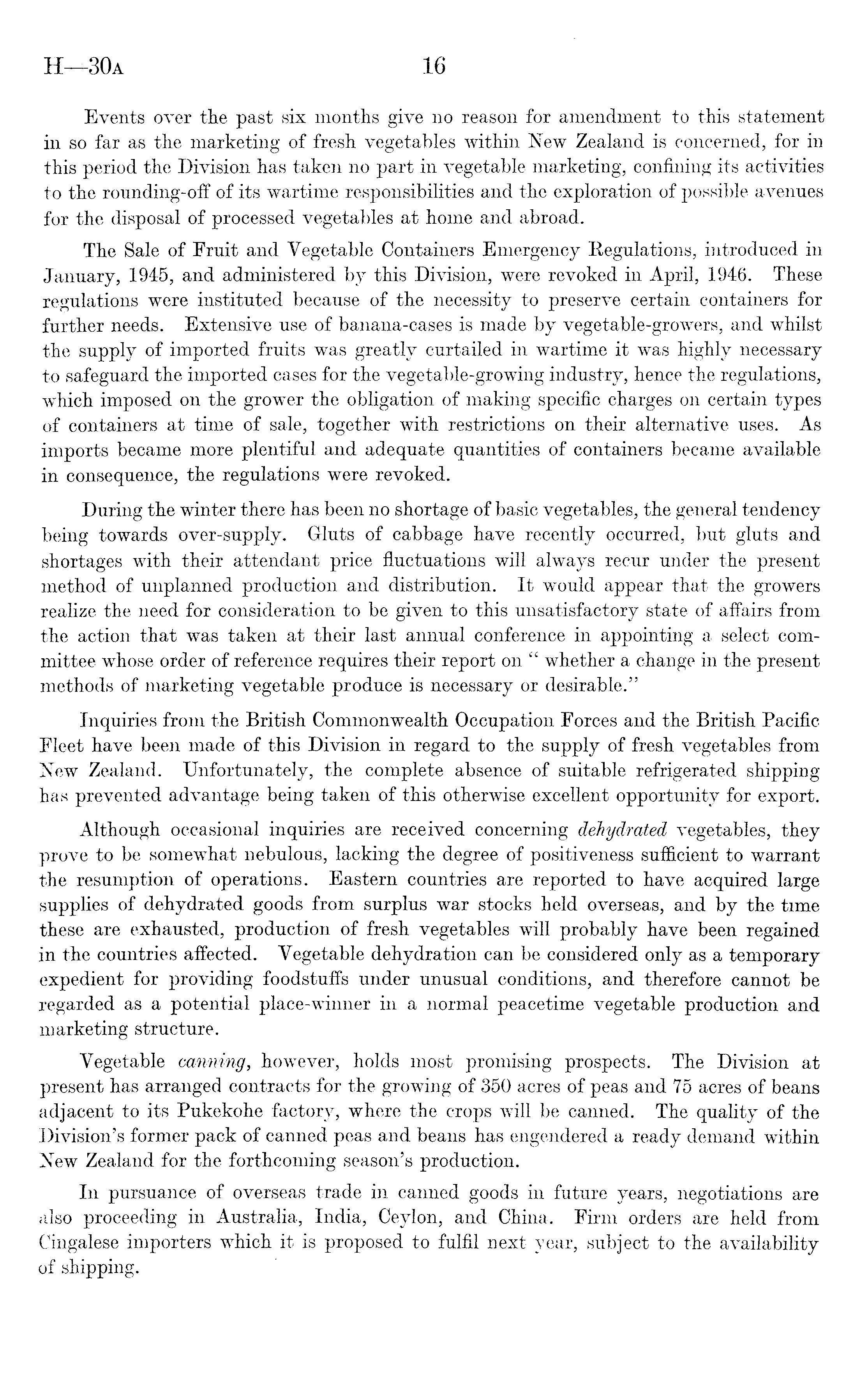 Events over the past six months give no reason for amendment to this statement in so far as the marketing of fresh vegetables within New Zealand is concerned, for in this period the Division has taken no part in vegetable marketing, confining its activities to the rounding-off of its wartime responsibilities and the exploration of possible avenues for the disposal of processed vegetables at home and abroad. The Sale of Fruit and Vegetable Containers Emergency Regulations, introduced in January, 1945, and administered by this Division, were revoked in April, 1946. These regulations were instituted because of the necessity to preserve certain containers for further needs. Extensive use of banana-cases is made by vegetable-growers, and whilst the supply of imported fruits was greatly curtailed in wartime it was highly necessary to safeguard the imported cases for the vegetable-growing industry, hence the regulations, which imposed on the grower the obligation of making specific charges on certain types of containers at time of sale, together with restrictions on their alternative uses. As imports became more plentiful and adequate quantities of containers became available in consequence, the regulations were revoked. During the winter there has been no shortage of basic vegetables, the general tendency being towards over-supply. Gluts of cabbage have recently occurred, but gluts and shortages with their attendant price fluctuations will always recur under the present method of unplanned production and distribution. It would appear th'at the growers realize the need for consideration to be given to this unsatisfactory state of affairs from the action that was taken at their last annual conference in appointing a select committee whose order of reference requires their report on " whether a change in the present methods of marketing vegetable produce is necessary or desirable." Inquiries from the British Commonwealth Occupation Forces and the British Pacific Fleet have been made of this Division in regard to the supply of fresh vegetables from New Zealand. Unfortunately, the complete absence of suitable refrigerated shipping has prevented advantage being taken of this otherwise excellent opportunity for export. Although occasional inquiries are received concerning dehydrated vegetables, they prove to be somewhat nebulous, lacking the degree of positiveness sufficient to warrant the resumption of operations. Eastern countries are reported to have acquired large supplies of dehydrated goods from surplus war stocks held overseas, and by the time these are exhausted, production of fresh vegetables will probably have been regained in the countries affected. Vegetable dehydration can be considered only as a temporary expedient for providing foodstuffs under unusual conditions, and therefore cannot be regarded as a potential place-winner in a normal peacetime vegetable production and marketing structure. Vegetable canning, however, holds most promising prospects. The Division at present has arranged contracts for the growing of 350 acres of peas and 75 acres of beans adjacent to its Pukekohe factory, where the crops will be canned. The quality of the Division's former pack of canned peas and beans has engendered a ready demand within New Zealand for the forthcoming season's production. In pursuance of overseas trade in canned goods in future years, negotiations are also proceeding in Australia, India, Ceylon, and China. Firm orders are held from Cingalese importers which it is proposed to fulfil next year, subject to the availability of shipping.