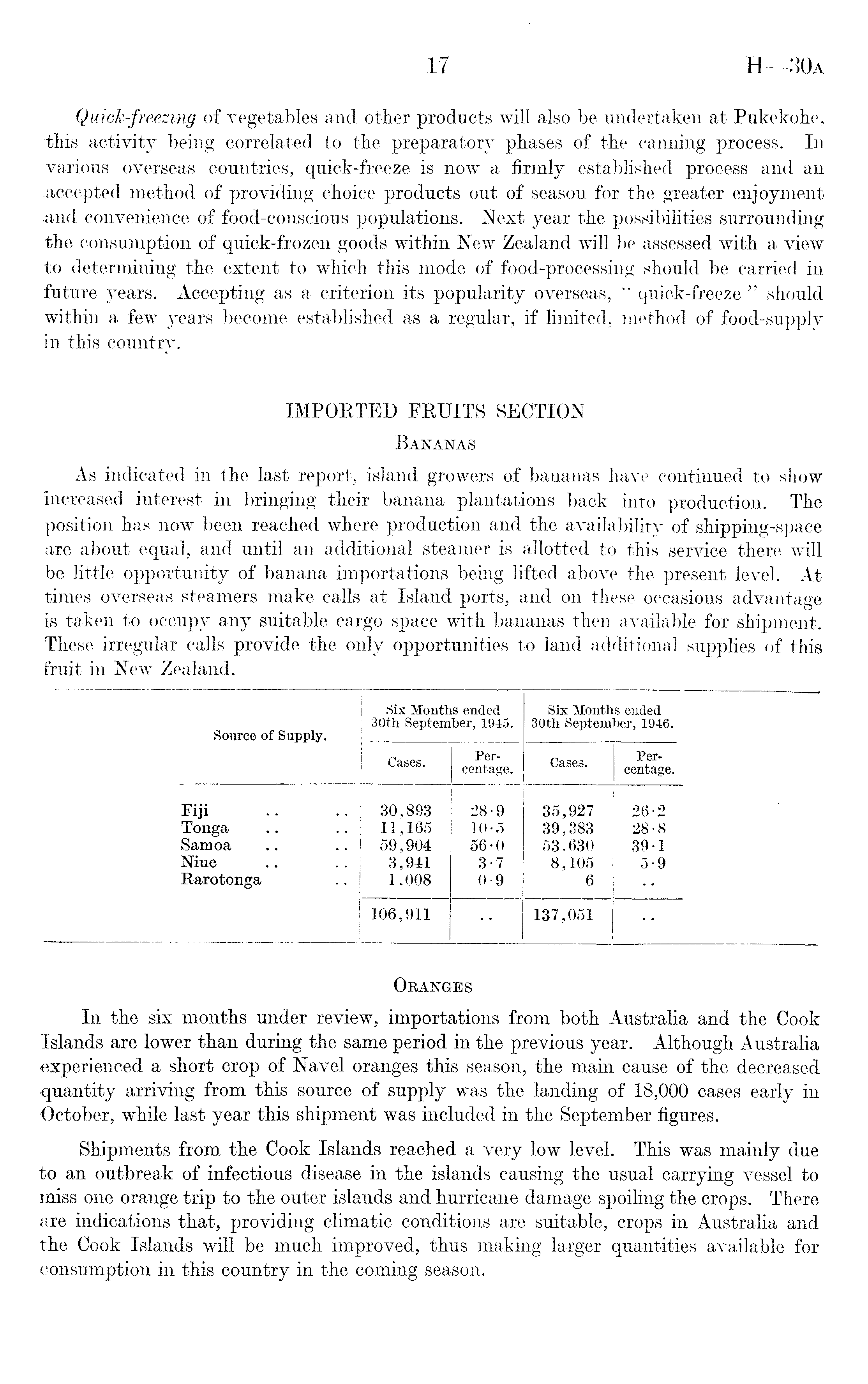 Oranges In the six months under review, importations from both Australia and the Cook Islands are lower than during the same period in the previous year. Although Australia experienced a short crop of Navel oranges this season, the main cause of the decreased quantity arriving from this source of supply was the landing of 18,000 cases early in October, while last year this shipment was included in the September figures. Shipments from the Cook Islands reached a very low level. This was mainly due to an outbreak of infectious disease in the islands causing the usual carrying vessel to miss one orange trip to the outer islands and hurricane damage spoiling the crops. There are indications that, providing climatic conditions are suitable, crops in Australia and the Cook Islands will be much improved, thus making larger quantities available for consumption in this country in the coming season.