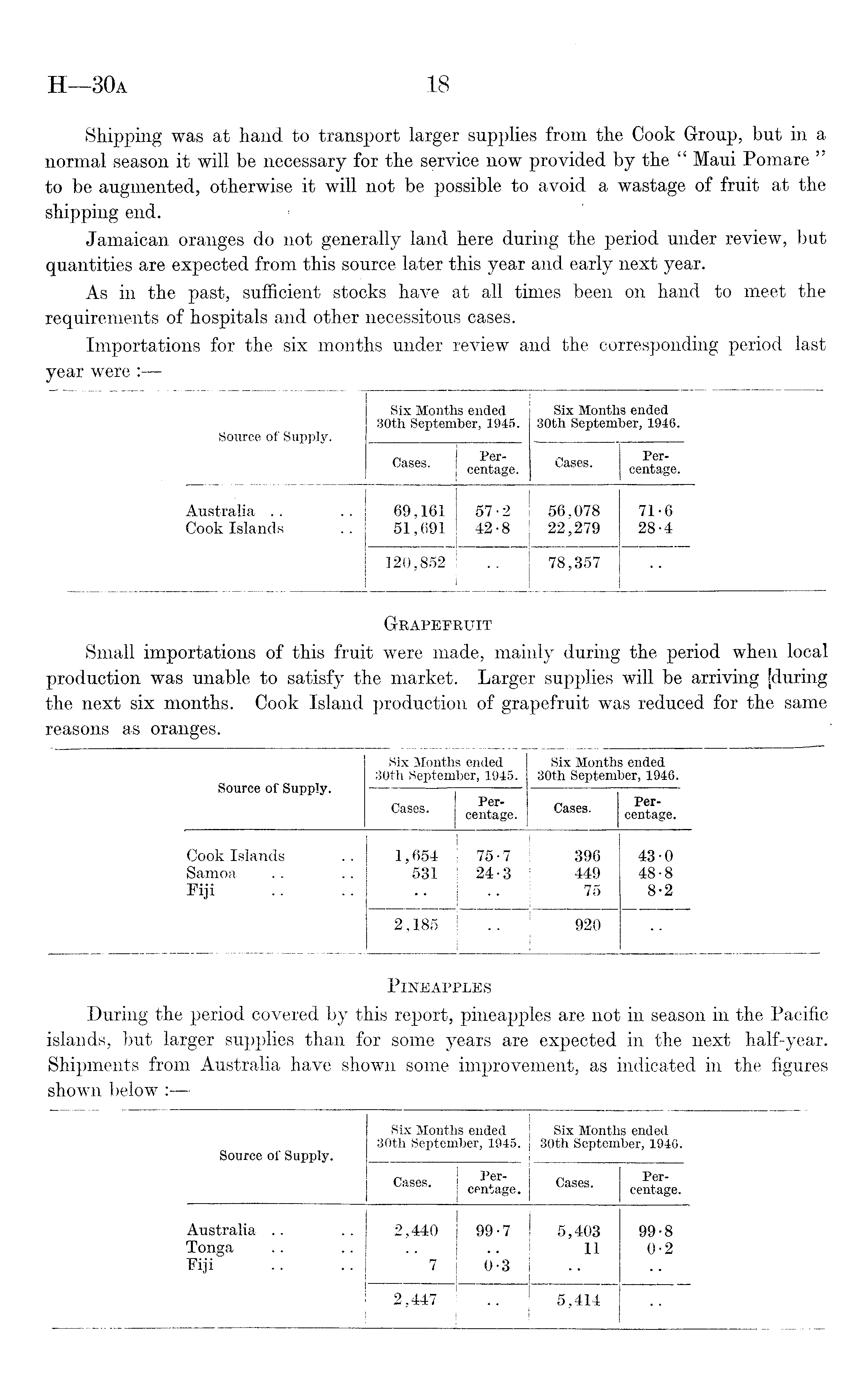Grapefruit Small importations of this fruit were made, mainly during the period when local production was unable to satisfy the market. Larger supplies will be arriving [during the next six months. Cook Island production of grapefruit was reduced for the same reasons as oranges.