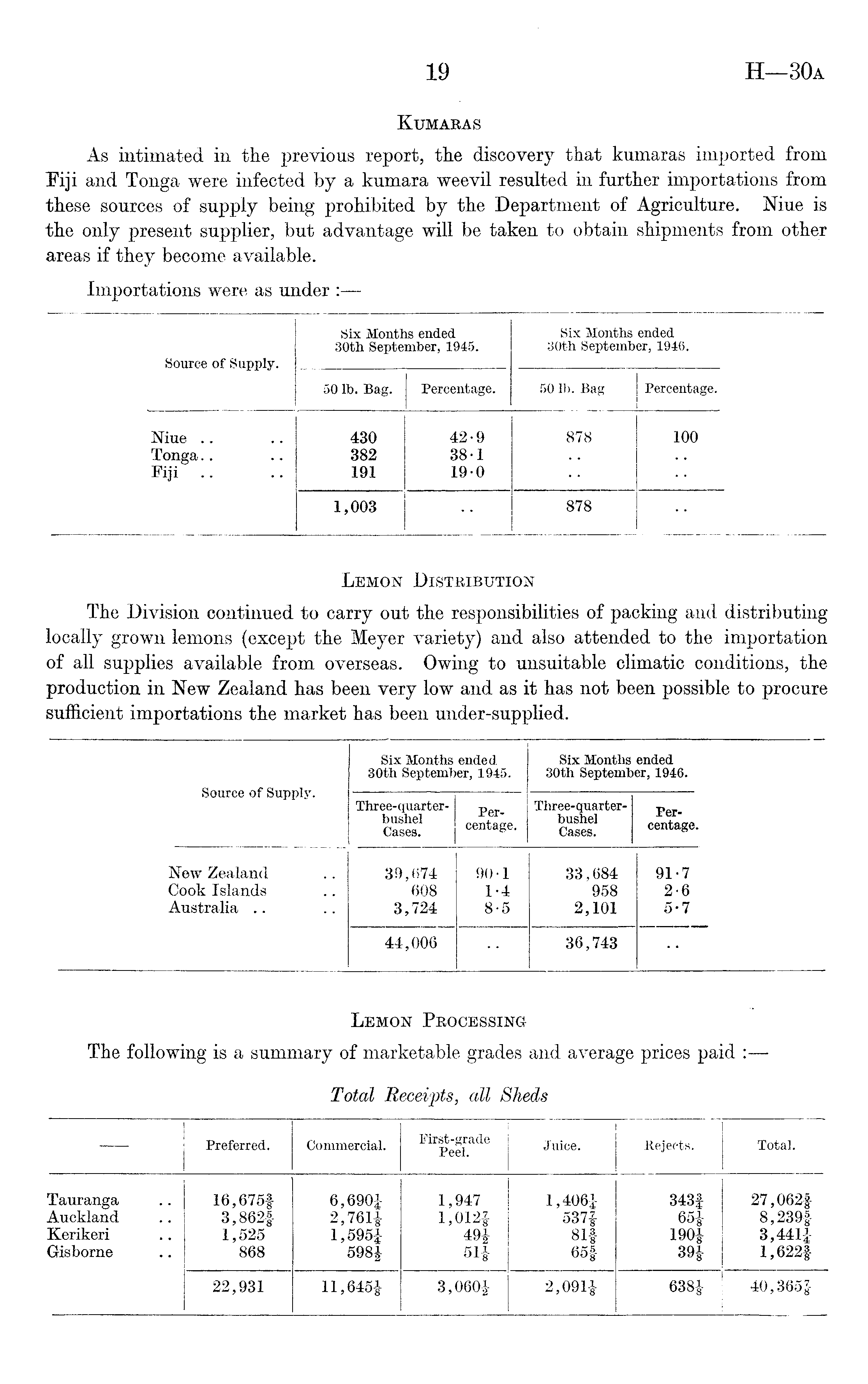 Kumaras As intimated in the previous report, the discovery that kumaras imported from Piji and Tonga were infected by a kumara weevil resulted in further importations from these sources of supply being prohibited by the Department of Agriculture. Niue is the only present supplier, but advantage will be taken to obtain shipments from other areas if they become available. Importations were as under :