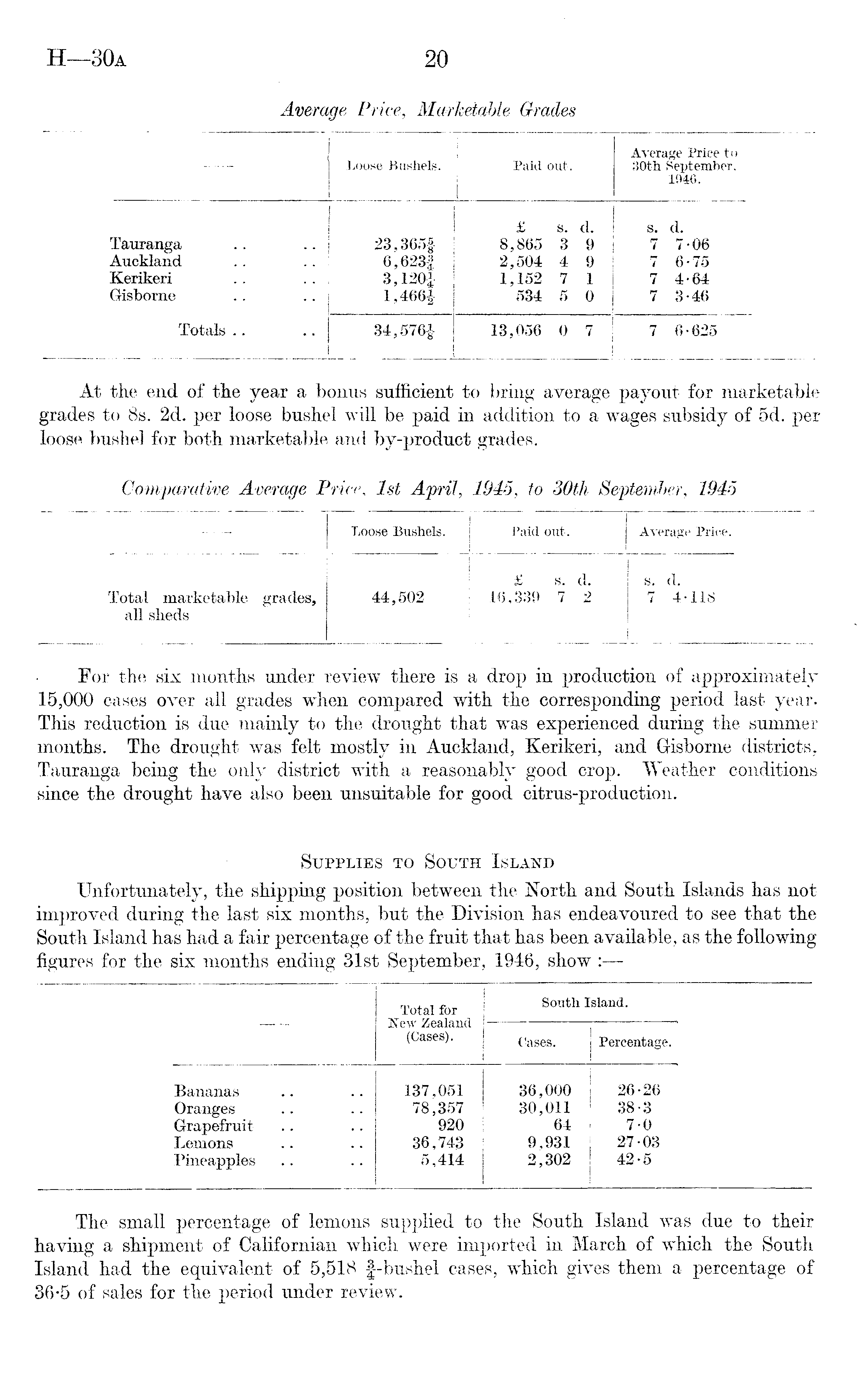Average Price to Loose Bushels. Paid out. 30th September, 1946. £ 8. d. s. d. Tauranga 23,365f 8,865 3 9 7 7-06 Auckland .. .. j 6,623§ 2,504 4 9 7 6-75 Kerikeri .. 3,120J 1,152 7 1 7 4-64 Gisborne 1,466J 534 5 0 7 3-46 Totals 34,576§ 13,056 0 7 7 6-625