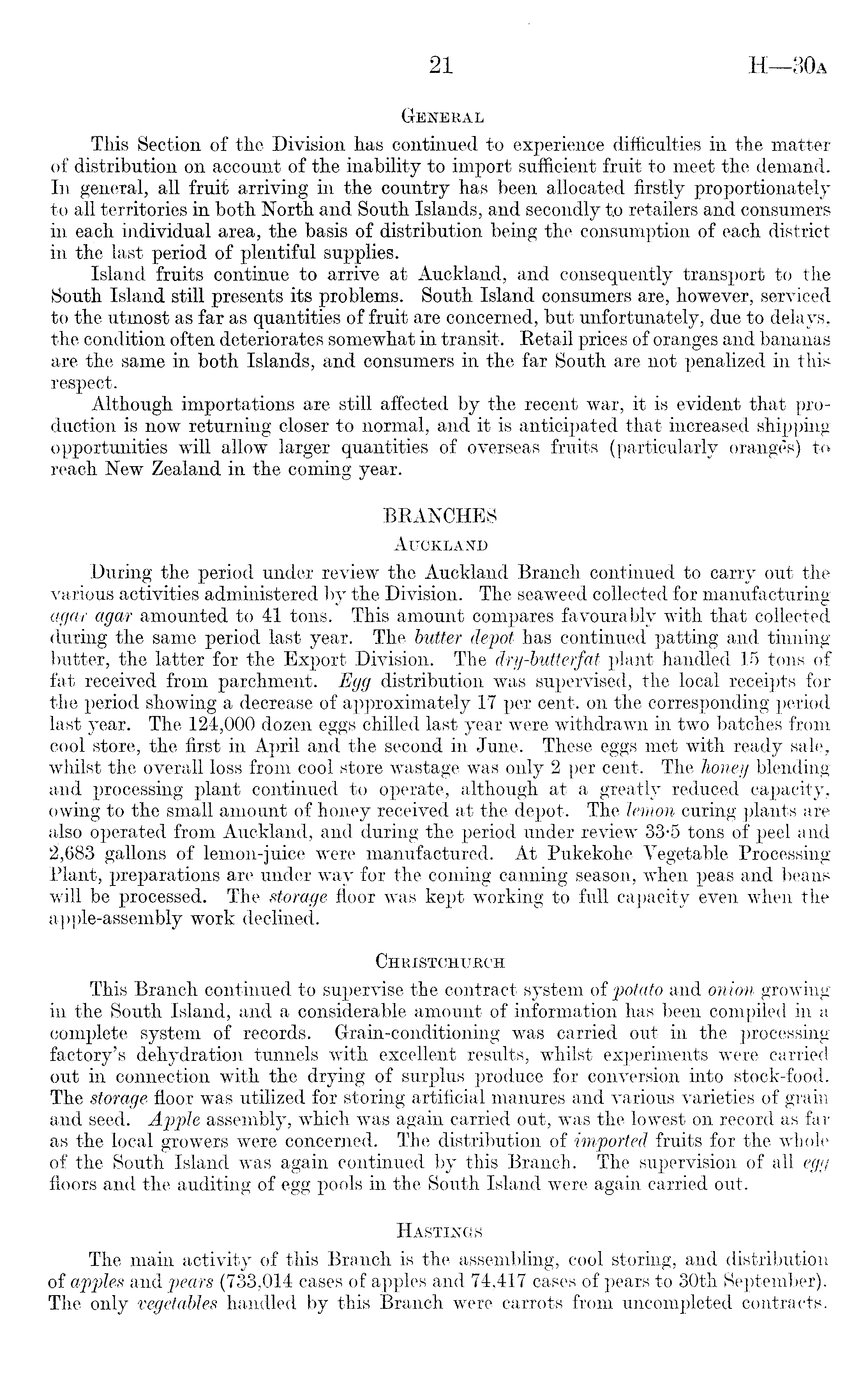 General This Section of the Division has continued to experience difficulties in the matter of distribution on account of the inability to import sufficient fruit to meet the demand. In general, all fruit arriving in the country has been allocated firstly proportionately to all territories in both North and South Islands, and secondly t.o retailers and consumers in each individual area, the basis of distribution being the consumption of each district in the last period of plentiful supplies. Island fruits continue to arrive at Auckland, and consequently transport to the South Island still presents its problems. South Island consumers are, however, serviced to the utmost as far as quantities of fruit are concerned, but unfortunately, due to delays, the condition often deteriorates somewhat in transit. Retail prices of oranges and bananas are the same in both Islands, and consumers in the far South are not penalized in this respect. Although importations are still affected by the recent war, it is evident that production is now returning closer to normal, and it is anticipated that increased shipping opportunities will allow larger quantities of overseas fruits (particularly oranges) to reach New Zealand in the coming year. BRANCHES Auckland During the period under review the Auckland Branch continued to carry out the various activities administered by the Division. The seaweed collected for manufacturing agar agar amounted to 41 tons. This amount compares favourably with that collected during the same period last year. The butter depot has continued patting and tinning butter, the latter for the Export Division. The dry-butterfat plant handled 15 tons of fat received from parchment. Egg distribution was supervised, the local receipts for the period showing a decrease of approximately 17 per cent, on the corresponding period last year. The 124,000 dozen eggs chilled last year were withdrawn in two batches from cool store, the first in April and the second in June. These eggs met with ready sale, whilst the overall loss from cool store wastage was only 2 per cent. The honey blending and processing plant continued to operate, although at a greatly reduced capacity, owing to the small amount of honey received at the depot. The lemon curing plants are also operated from Auckland, and during the period under review 33-5 tons of peel and 2,683 gallons of lemon-juice were manufactured. At Pukekohe Vegetable Processing Plant, preparations are under way for the coming canning season, when peas and beans will be processed. The storage floor was kept working to full capacity even when the apple-assembly work declined. Christchurch This Branch continued to supervise the contract system of potato and onion growing in the South Island, and a considerable amount of information has been compiled in a complete system of records. Grain-conditioning was carried out in the processing factory's dehydration tunnels with excellent results, whilst experiments were carried out in connection with the drying of surplus produce for conversion into stock-food. The storage floor was utilized for storing artificial manures and various varieties of grain and seed. Apple assembly, which was again carried out, was the lowest on record as far as the local growers were concerned. The distribution of imported fruits for the whole of the South Island was again continued by this Branch. The supervision of all egg floors and the auditing of egg pools in the South Island were again carried out. Hastings The main activity of this Branch is the assembling, cool storing, and distribution of apples and pears (733,014 cases of apples and 74,417 cases of pears to 30th September). The only vegetables handled by this Branch were carrots from uncompleted contracts.