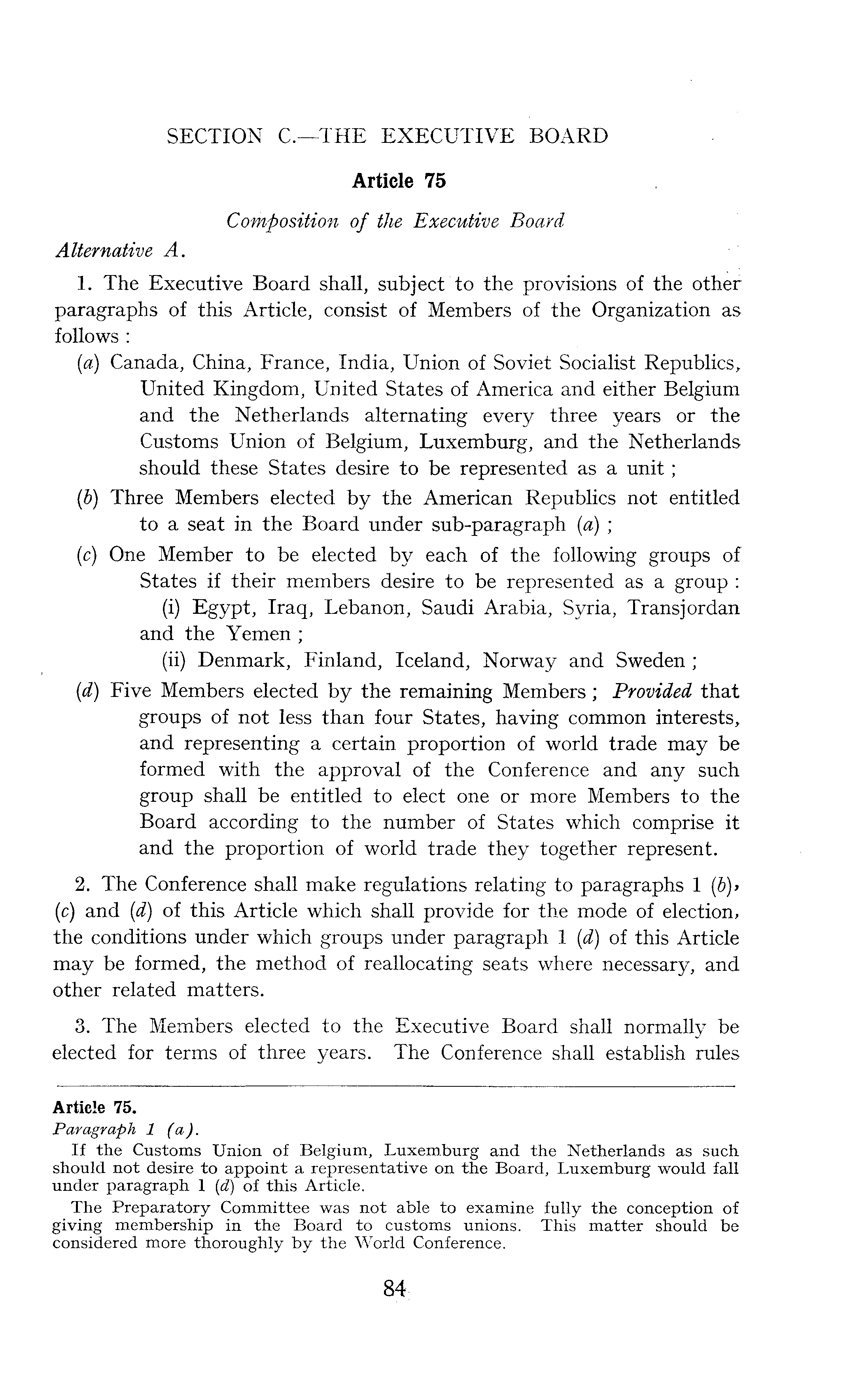 SECTION C.—THE EXECUTIVE BOARD Article 75 Composition of the Executive Board Alternative A. 1. The Executive Board shall, subject to the provisions of the other paragraphs of this Article, consist of Members of the Organization as follows : {a) Canada, China, France, India, Union of Soviet Socialist Republics, United Kingdom, United States of America and either Belgium and the Netherlands alternating every three years or the Customs Union of Belgium, Luxemburg, and the Netherlands should these States desire to be represented as a unit; (b) Three Members elected by the American Republics not entitled to a seat in the Board under sub-paragraph (a) ; (c) One Member to be elected by each of the following groups of States if their members desire to be represented as a group : (i) Egypt, Iraq, Lebanon, Saudi Arabia, Syria, Transjordan and the Yemen; (ii) Denmark, Finland, Iceland, Norway and Sweden ; (d) Five Members elected by the remaining Members; Provided that groups of not less than four States, having common interests, and representing a certain proportion of world trade may be formed with the approval of the Conference and any such group shall be entitled to elect one or more Members to the Board according to the number of States which comprise it and the proportion of world trade they together represent. 2. The Conference shall make regulations relating to paragraphs 1 (b)> (c) and (d) of this Article which shall provide for the mode of election, the conditions under which groups under paragraph 1 (d) of this Article may be formed, the method of reallocating seats where necessary, and other related matters. .3. The Members elected to the Executive Board shall normally be elected for terms of three years. The Conference shall establish rules