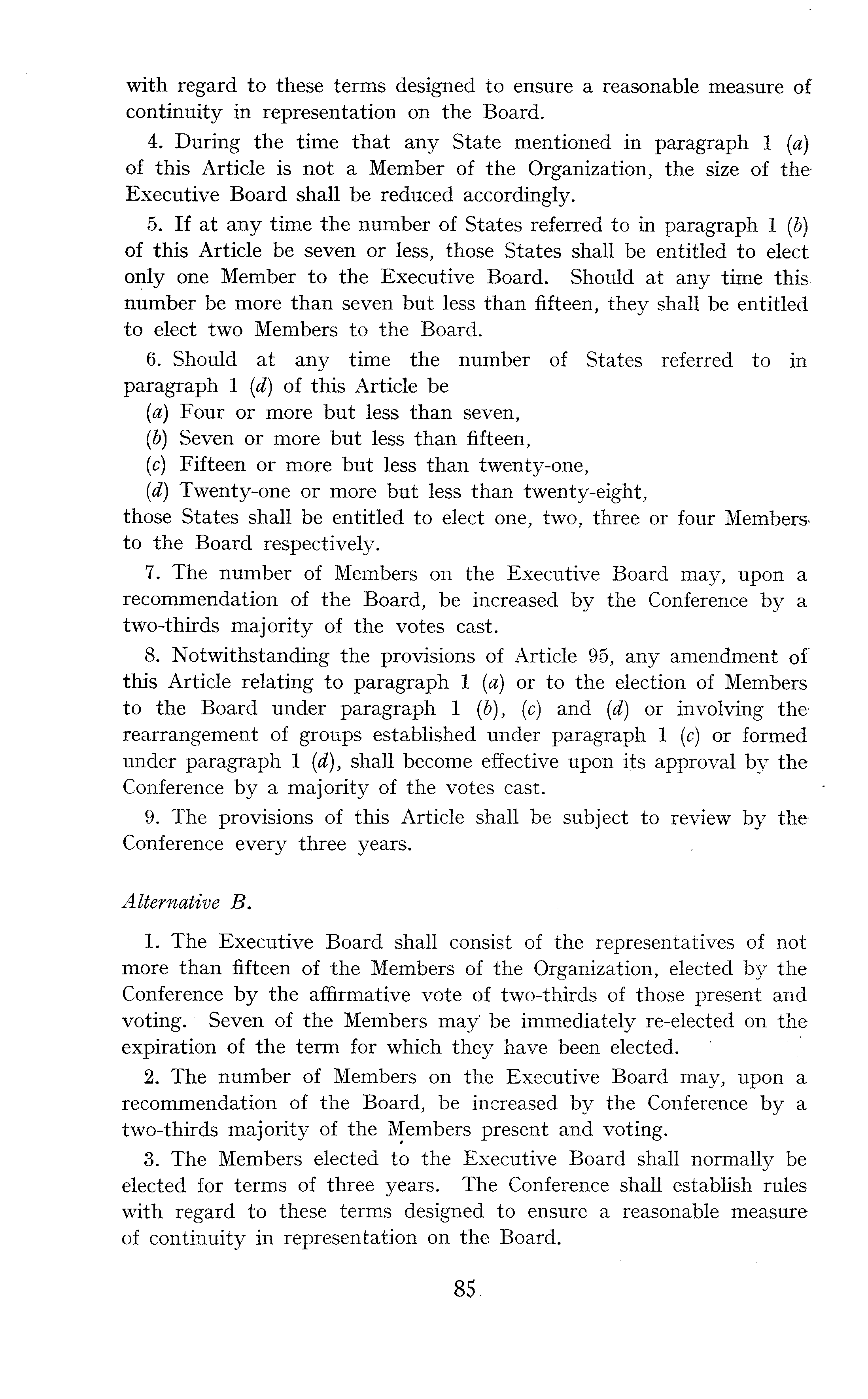 with regard to these terms designed to ensure a reasonable measure of continuity in representation on the Board. 4. During the time that any State mentioned in paragraph 1 [a) of this Article is not a Member of the Organization, the size of the Executive Board shall be reduced accordingly. 5. If at any time the number of States referred to in paragraph 1 ( b) of this Article be seven or less, those States shall be entitled to elect only one Member to the Executive Board. Should at any time this number be more than seven but less than fifteen, they shall be entitled to elect two Members to the Board. 6. Should at any time the number of States referred to in paragraph 1 (d) of this Article be (a) Four or more but less than seven, (b) Seven or more but less than fifteen, (c) Fifteen or more but less than twenty-one, (d) Twenty-one or more but less than twenty-eight, those States shall be entitled to elect one, two, three or four Members to the Board respectively. 7. The number of Members on the Executive Board may, upon a recommendation of the Board, be increased by the Conference by a two-thirds majority of the votes cast. 8. Notwithstanding the provisions of Article 95, any amendment of this Article relating to paragraph 1 (a) or to the election of Members to the Board under paragraph 1 (b), (c) and (d) or involving the rearrangement of groups established under paragraph 1 (c) or formed under paragraph 1 (d), shall become effective upon its approval by the Conference by a majority of the votes cast. 9. The provisions of this Article shall be subject to review by the Conference every three years. Alternative B. 1. The Executive Board shall consist of the representatives of not more than fifteen of the Members of the Organization, elected by the Conference by the affirmative vote of two-thirds of those present and voting. Seven of the Members may be immediately re-elected on the expiration of the term for which they have been elected. 2. The number of Members on the Executive Board may, upon a recommendation of the Board, be increased by the Conference by a two-thirds majority of the Members present and voting. 3. The Members elected to the Executive Board shall normally be elected for terms of three years. The Conference shall establish rules with regard to these terms designed to ensure a reasonable measure of continuity in representation on the Board.