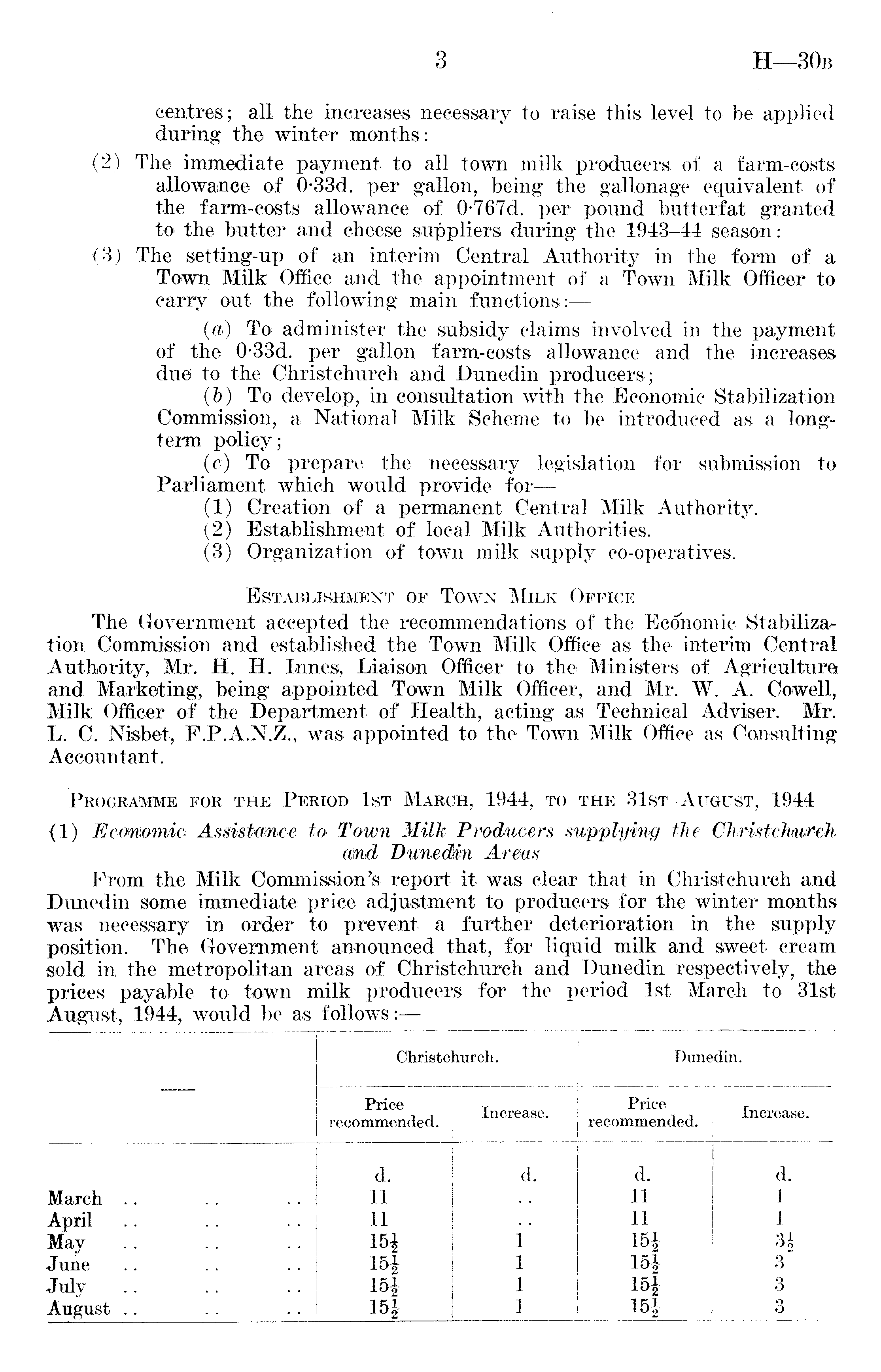 centres; all the increases necessary to raise this level to be applied during the winter months: (2) The immediate payment to all town milk producers of a farm-costs allowance of 0-33 d. per gallon, being the gallonage equivalent of the farm-costs allowance of 0767 d. per pound butterfat granted to the butter and cheese suppliers during the 1943-44 season: (3) The setting-up of an interim Central Authority in the form of a Town Milk Office and the appointment of a Town Milk Officer to carry out the following main functions: — (a) To administer the subsidy claims involved in the payment of the 0-33 d. per gallon farm-costs allowance and the increases due to the Christchureh and Dunedin producers; (b) To develop, in consultation with the Economic Stabilization Commission, a, National Milk Scheme to be introduced as a longterm policy; (c) To prepare the necessary legislation for submission to Parliament which would provide for — (1) Creation of a permanent Central Milk Authority. (2) Establishment of local Milk Authorities. (3) Organization of town milk supply co-operatives. Establishment op Town Milk Office The Government accepted the recommendations of the Economic Stabilizar tion Commission and established the Town Milk Office as the interim Central Authority, Mr. H. IT. Innes, Liaison Officer to the Ministers of Agriculture and Marketing, being appointed Town Milk Officer, and Mr. W. A. Cowell, Milk Officer of the Department of Health, acting as Technical Adviser. Mr. L. C. Nisbet, F.P.A.N.Z., was appointed to the Town Milk Office as Consulting Accountant. Programme for the Period Ist March, 1944, to the 31st August, 1944 (1) Economic Assistance to Town Milk Producers supplying the Christchureh a\nd Dwn&din Areas From the Milk Commission's report it was clear that in Christchureh and Dunedin some immediate price adjustment to producers for the winter months was necessary in order to prevent a further deterioration in the supply position. The Government announced that, for liquid milk and sweet cream sold in the metropolitan areas of Christchureh and Dunedin respectively, the prices payable to town milk producers for the period Ist March to 31st August, 1944, would be as follows: —
