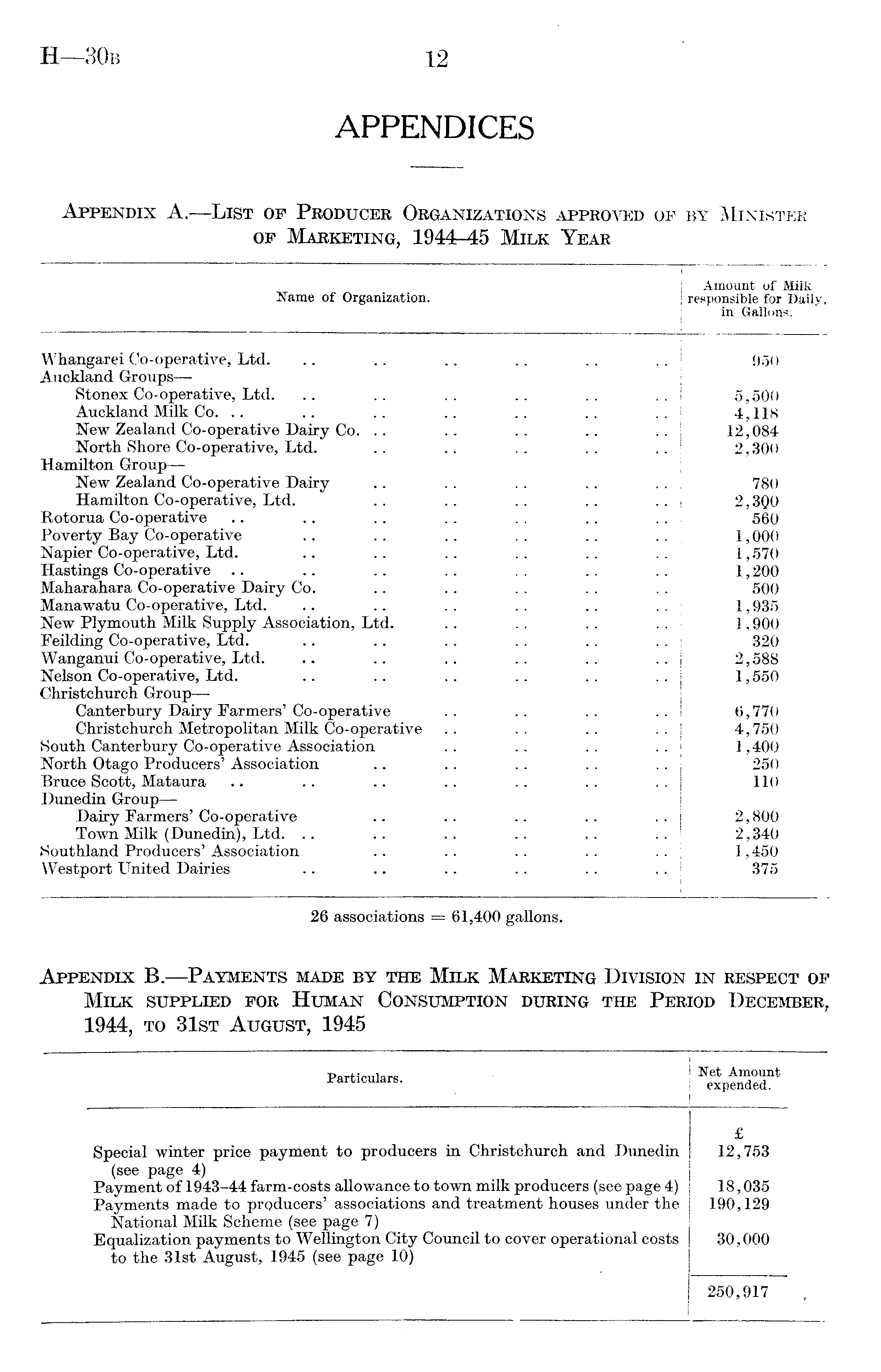 Appendix B.—Payments made by the Milk Marketing Division in respect of Milk supplied for Human Consumption during the Period December, 1944, to 31st August, 1945