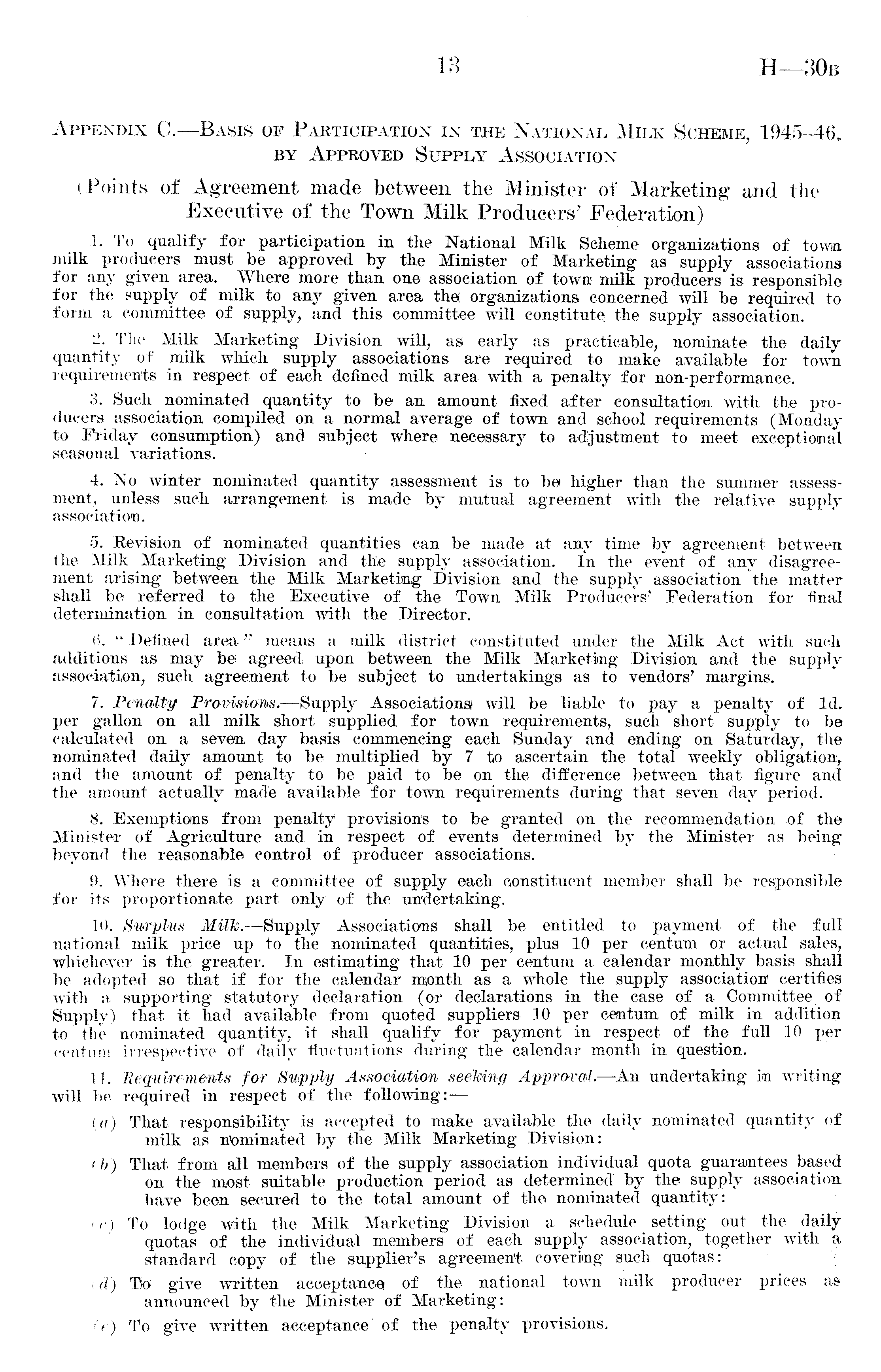 Appendix C. —Basis of Participation in the National Milk Scheme, 1945-46, by Approved Supply Association (Points of Agreement made between the Minister of Marketing and the Executive of the Town Milk Producers' Federation) 1. To qualify for participation in the National Milk Scheme organizations of town milk producers must be approved by the Minister of Marketing as supply associations for any given area. Where more than one association of town milk producers is responsible for the supply of milk to any given area the: organizations concerned will be required to form a committee of supply, and this committee will constitute the supply association. 2. The Milk Marketing Division will, as early as practicable, nominate the daily quantity of milk which supply associations are required to make available for town requirements in respect of each denned milk area with a penalty for non-performance. 3. Such nominated quantity to be an amount fixed after consultation, with the producers association compiled on a normal average of town and school requirements (Monday to Friday consumption) and subject where necessary to adjustment to meet exceptional seasonal variations. 4. No winter nominated quantity assessment is to be higher than the summer assessment, unless such arrangement is made by mutual agreement with the relative supply association. 5. Eevision of nominated quantities can be made at any time by agreement between the Milk Marketing- Division and the supply association. In the event of any disagreement arising between the Milk Marketing Division and the supply association the matter shall be referred to the Executive of the Town Milk Producers' Federation for final determination in consultation with the Director. 6. " Defined area" means a milk district constituted under the Milk Act with such additions as may be agreed upon between the Milk Marketing Division and the supply association, such agreement to be subject to undertakings as to vendors' margins. 7. Penalty Provisions. —Supply Associations) will be liable to pay a penalty of Id. per gallon on all milk short supplied for town requirements, such short supply to be calculated on a seven day basis commencing each Sunday and ending on Saturday, the nominated daily amount to be multiplied by 7 to ascertain the total weekly obligation, and the amount of penalty to be paid to be on the difference between that figure and the amount actually made available for town requirements during that seven day period. 8. Exemptions from penalty provisions to be granted on the recommendation of the Minister of Agriculture and in respect of events determined by the Minister as being beyond the reasonable control of producer associations. 9. Where there is a committee of supply each constituent member shall be responsible for its proportionate part only of the undertaking. 10. SwrplMS Milk. —Supply Associations shall be entitled to payment of the full national milk price up to the nominated quantities, plus 10 per centum or actual sales, whichever is the greater. In estimating that 10 per centum a calendar monthly basis shall be adopted so that if for the calendar month as a whole the supply association certifies with a supporting statutory declaration (or declarations in the case of a Committee of Supply) that it had available from quoted suppliers 10 per centum of milk in addition to the nominated quantity, it shall qualify for payment in respect of the full 10 per centum irrespective of daily fluctuations during the calendar month in question. 11. Requirements for Supply Association seeking Approval. —An undertaking in writing will be required in respect of the following: («■) That responsibility is accepted to make available the daily nominated quantity of milk as nominated by the Milk Marketing Division: (b) That from all members of the supply association individual quota guarantees based on the most suitable production period as determined by the supply association have been secured to the total amount of the nominated quantity: (<•) To lodge with the Milk Marketing Division a schedule setting out the daily quotas of the individual members of each supply association, together with a standard copy of the supplier's agreement covering such quotas: '.(V) To give written acceptance of the national town milk producer prices as announced by the Minister of Marketing: (<?) To give written acceptance of the penalty provisions.