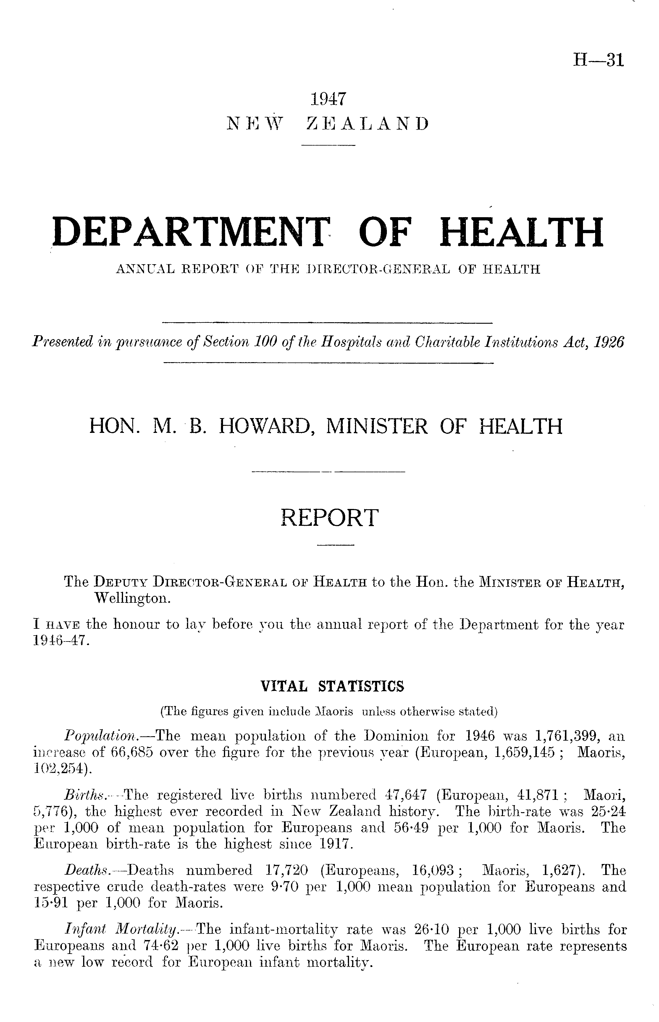 REPORT The Deputy Director-General of Health to the Hon. the Minister of Health, Wellington. I have the honour to lav before you the annual report of the Department for the year 1946-47. VITAL STATISTICS (The figures given include Maoris unless otherwise stated) Population.—The mean population of the Dominion for 1946 was 1,761,399, an increase of 66,685 over the figure for the previous year (European, 1,659,145 ; Maoris, 102,254). Births. —The registered live births numbered 47,647 (European, 41,871 ; Maori, 5,776), the highest ever recorded in New Zealand history. The birth-rate was 25-24 per 1,000 of mean population for Europeans and 56-49 per 1,000 for Maoris. The European birth-rate is the highest since 1917. Deaths.—Deaths numbered 17,720 (Europeans, 16,093; Maoris, 1,627). The respective crude death-rates were 9-70 per 1,000 mean population for Europeans and 15-91 per 1,000 for Maoris. Infant Mortality.—The infant-mortality rate was 26-10 per 1,000 live births for Europeans and 74-62 per 1,000 live births for Maoris. The European rate represents a new low record for European infant mortality.