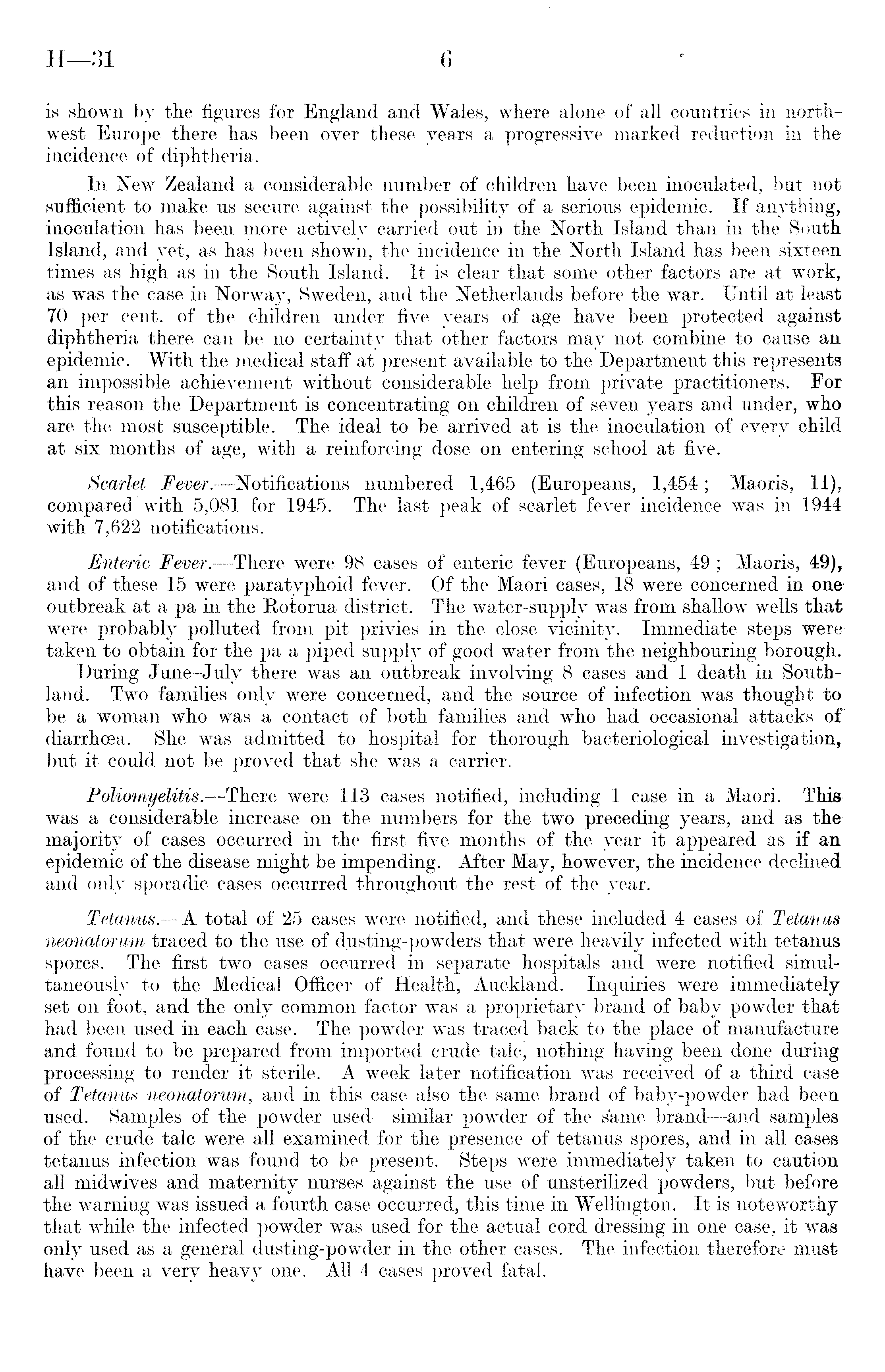 is shown by the figures for England and Wales, where alone of all countries in northwest Europe there has been over these years a progressive marked reduction in the incidence of diphtheria. In New Zealand a considerable number of children have been inoculated, hut not sufficient to make us secure against the possibility of a serious epidemic. If anything, inoculation has been more actively carried out in the North Island than in the South Island, and yet, as has been shown, the incidence in the North Island has been sixteen times as high as in the South Island. It is clear that some other factors are at work, as was the case in Norway, Sweden, and the Netherlands before the war. Until at least 70 per cent, of the children under five years of age have been protected against diphtheria there can be no certainty that other factors may not combine to cause an epidemic. With the medical staff at present available to the Department this represents an impossible achievement without considerable help from private practitioners. For this reason the Department is concentrating on children of seven years and under, who are the most susceptible. The ideal to be arrived at is the inoculation of every child at six months of age, with a reinforcing dose on entering school at five. Scarlet Fever. —Notifications numbered 1,465 (Europeans, 1,454; Maoris, 11), compared with 5,081 for 1945. The last peak of scarlet fever incidence was in 1944 with 7,622 notifications. Enteric Fever.—There were 98 cases of enteric fever (Europeans, 49 ; Maoris, 49), and of these 15 were paratyphoid fever. Of the Maori cases, 18 were concerned in one outbreak at apa in the Rotorua district. The water-supply was from shallow wells that were probably polluted from pit privies in the close vicinity. Immediate steps were taken to obtain for the pa a piped supply of good water from the neighbouring borough. During June-July there was an outbreak involving -8 cases and 1 death in Southland. Two families only were concerned, and the source of infection was thought to be a woman who was a contact of both families and who had occasional attacks of diarrhoea. She was admitted to hospital for thorough bacteriological investigation, but it could not be proved that she was a carrier. Poliomyelitis. —There were 113 cases notified, including 1 case in a Maori. This was a considerable increase on the numbers for the two preceding years, and as the majority of cases occurred in the first five months of the year it appeared as if an epidemic of the disease might be impending. After May, however, the incidence declined and only sporadic cases occurred throughout the rest of the year. Tetanus.—A total of 25 cases were notified, and these included 4 cases of Tetanus neonatorum traced to the use of dusting-powders that were heavily infected with tetanus spores. The first two cases occurred in separate hospitals and were notified simultaneously to the Medical Officer of Health, Auckland. Inquiries were immediately set on foot, and the only common factor was a proprietary brand of baby powder that had been used in each case. The powder was traced back to the place of manufacture and found to be prepared from imported crude talc, nothing having been done during processing to render it sterile. A week later notification was received of a third case of Tetanus neonatorum, and in this case also the same brand of baby-powder had been used. Samples of the powder used —similar powder of the same brand —and samples of the crude talc were all examined for the presence of tetanus spores, and in all cases tetanus infection was found to be present. Steps were immediately taken to caution all midwives and maternity nurses against the use of unsterilized powders, but before the warning was issued a fourth case occurred, this time in Wellington. It is noteworthy that while the infected powder was used for the actual cord dressing in one case, it was only used as a general dusting-powder in the other cases. The infection therefore must have been a very heavy one. All 4 cases proved fatal.