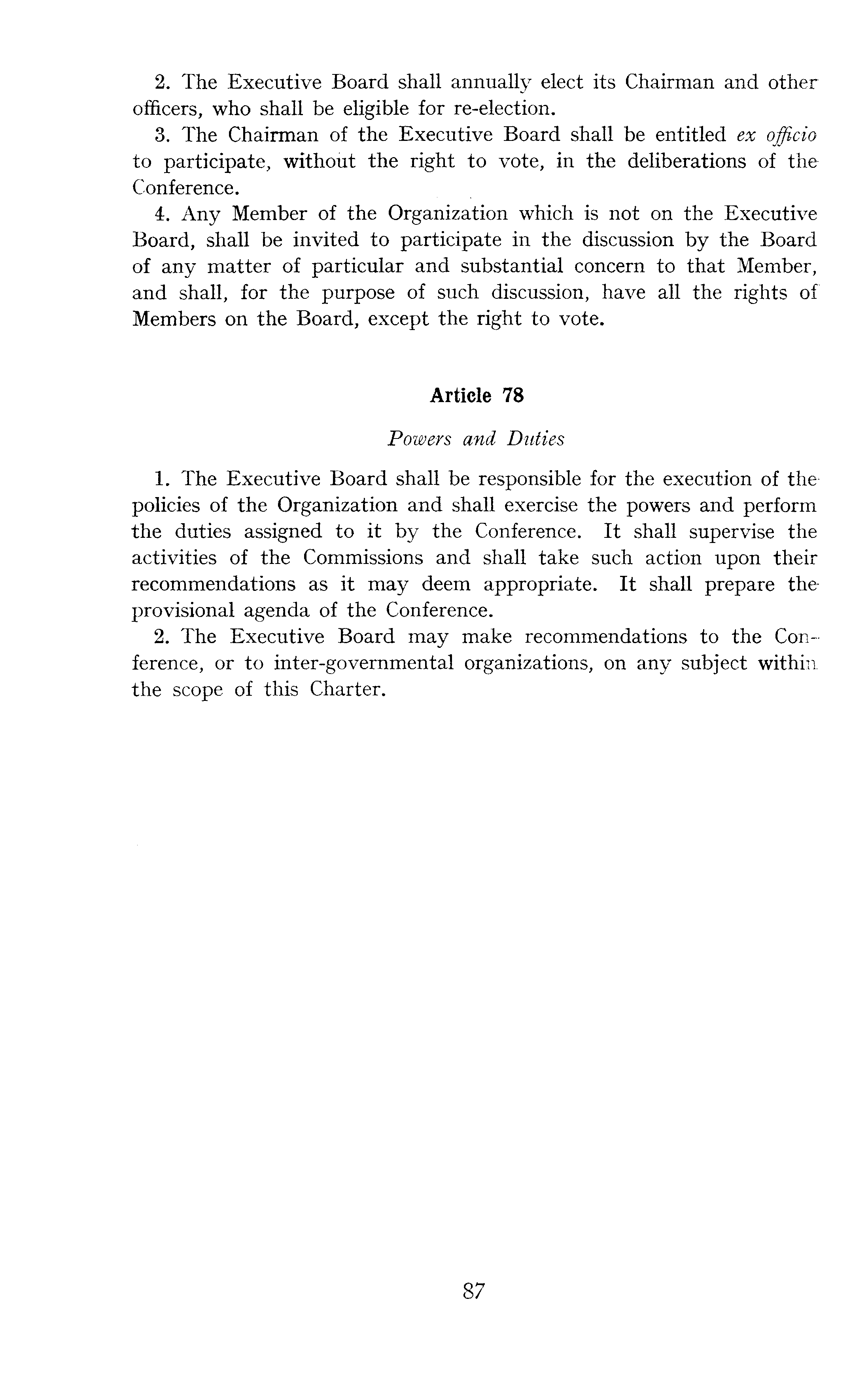 2. The Executive Board shall annually elect its Chairman and other officers, who shall be eligible for re-election. 3. The Chairman of the Executive Board shall be entitled ex officio to participate, without the right to vote, in the deliberations of the Conference. 4. Any Member of the Organization which is not on the Executive Board, shall be invited to participate in the discussion by the Board of any matter of particular and substantial concern to that Member, and shall, for the purpose of such discussion, have all the rights of Members on the Board, except the right to vote. Article 78 Powers and Duties 1. The Executive Board shall be responsible for the execution of the policies of the Organization and shall exercise the powers and perform the duties assigned to it by the Conference. It shall supervise the activities of the Commissions and shall take such action upon their recommendations as it may deem appropriate. It shall prepare the provisional agenda of the Conference. 2. The Executive Board may make recommendations to the Conference, or to inter-governmental organizations, on any subject within the scope of this Charter.
