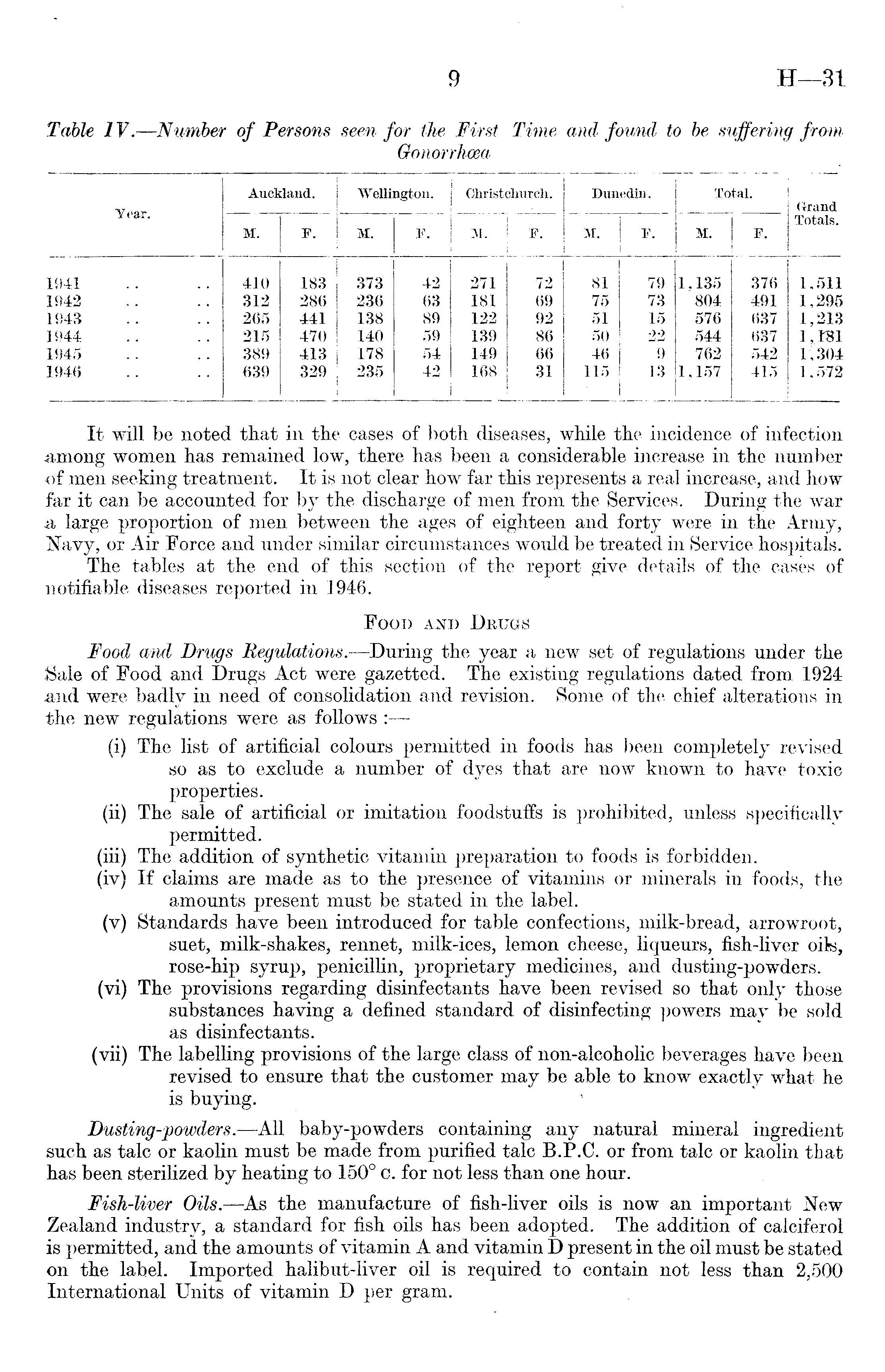 It will be noted that in the cases of both diseases, while the incidence of infection among women has remained low, there has been a considerable increase in the number of men seeking treatment. It is not clear how far this represents a real increase, and how far it can be accounted for by the discharge of men from the Services. During the war a, large proportion of men between the ages of eighteen and forty were in the Army, Navy, or Air Force and under similar circumstances would be treated in Service hospitals. The tables at the end of this section of the report give details of the cases of notifiable diseases reported in 1946. Food and Drugs Food and Drugs Regulations. —During the year a new set of regulations under the Sale of Food and Drugs Act were gazetted. The existing regulations dated from 1924 and were badly in need of consolidation and revision. Some of the chief alterations in the new regulations were as follows : (i) The list of artificial colours permitted in foods has been completely revised so as to exclude a number of dyes that are now known to have toxic properties. (ii) The sale of artificial or imitation foodstuffs is prohibited, unless specifically permitted. (iii) The addition of synthetic vitamin preparation to foods is forbidden. (iv) If claims are made as to the presence of vitamins or minerals in foods, the amounts present must be stated in the label. (v) Standards have been introduced for table confections, milk-bread, arrowroot, suet, milk-shakes, rennet, milk-ices, lemon cheese, liqueurs, fish-liver oils, rose-hip syrup, penicillin, proprietary medicines, and dusting-powders. (vi) The provisions regarding disinfectants have been revised so that only those substances having a defined standard of disinfecting powers may be sold as disinfectants. (vii) The labelling provisions of the large class of non-alcoholic beverages have been revised to ensure that the customer may be able to know exactly what he is buying. Dusting-powders. —All baby-powders containing any natural mineral ingredient such as talc or kaolin must be made from purified talc B.P.C. or from talc or kaolin that has been sterilized by heating to 150° c. for not less than one hour. Fish-liver Oils. —As the manufacture of fish-liver oils is now an important New Zealand industry, a standard for fish oils has been adopted. The addition of calciferol is permitted, and the amounts of vitamin A and vitamin D present in the oil must be stated on the label. Imported halibut-liver oil is required to contain not less than 2,500 International Units of vitamin D per gram.
