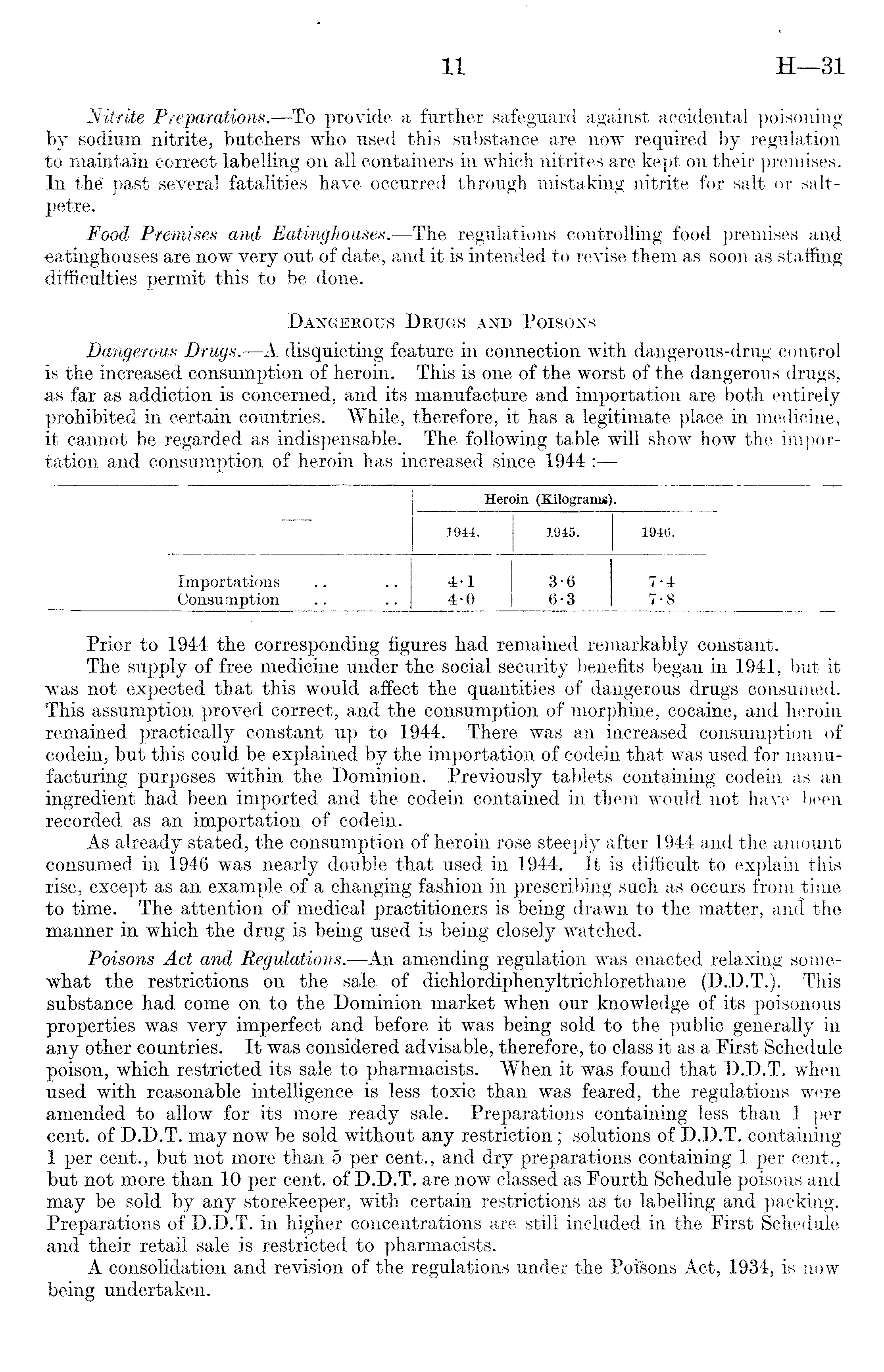 Nitrite Preparations.—To provide a further safeguard against accidental poisoning by sodium nitrite, butchers who used this substance are now required by regulation to maintain correct labelling on all containers in which nitrites are kept on their premises. In the past several fatalities have occurred through mistaking nitrite for salt or saltpetre. Food Premises and Eatinghouses.—The regulations controlling food premises and eatinghouses are now very out of date, and it is intended to. revise them as soon as staffing difficulties permit this to be done. Dangerous Drugs and Poisons Dangerous Drugs.—A disquieting feature in connection with dangerous-drug control is the increased consumption of heroin. This is one of the worst of the dangerous drugs, as far as addiction is concerned, and its manufacture and importation are both entirely prohibited in certain countries. While, therefore, it has a legitimate place in medicine, it cannot be regarded as indispensable. The following table will show how the importation and consumption of heroin has increased since 1944 :